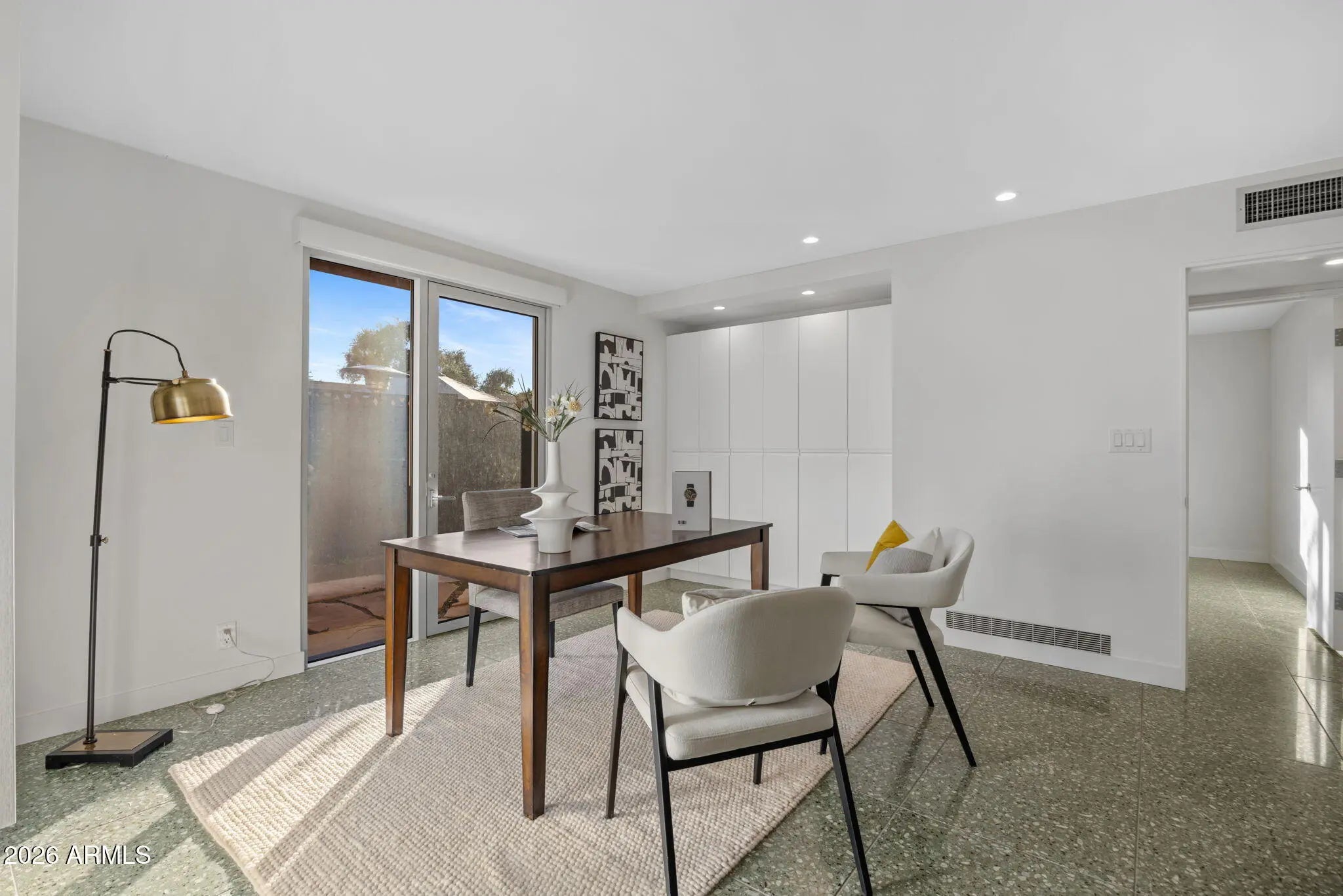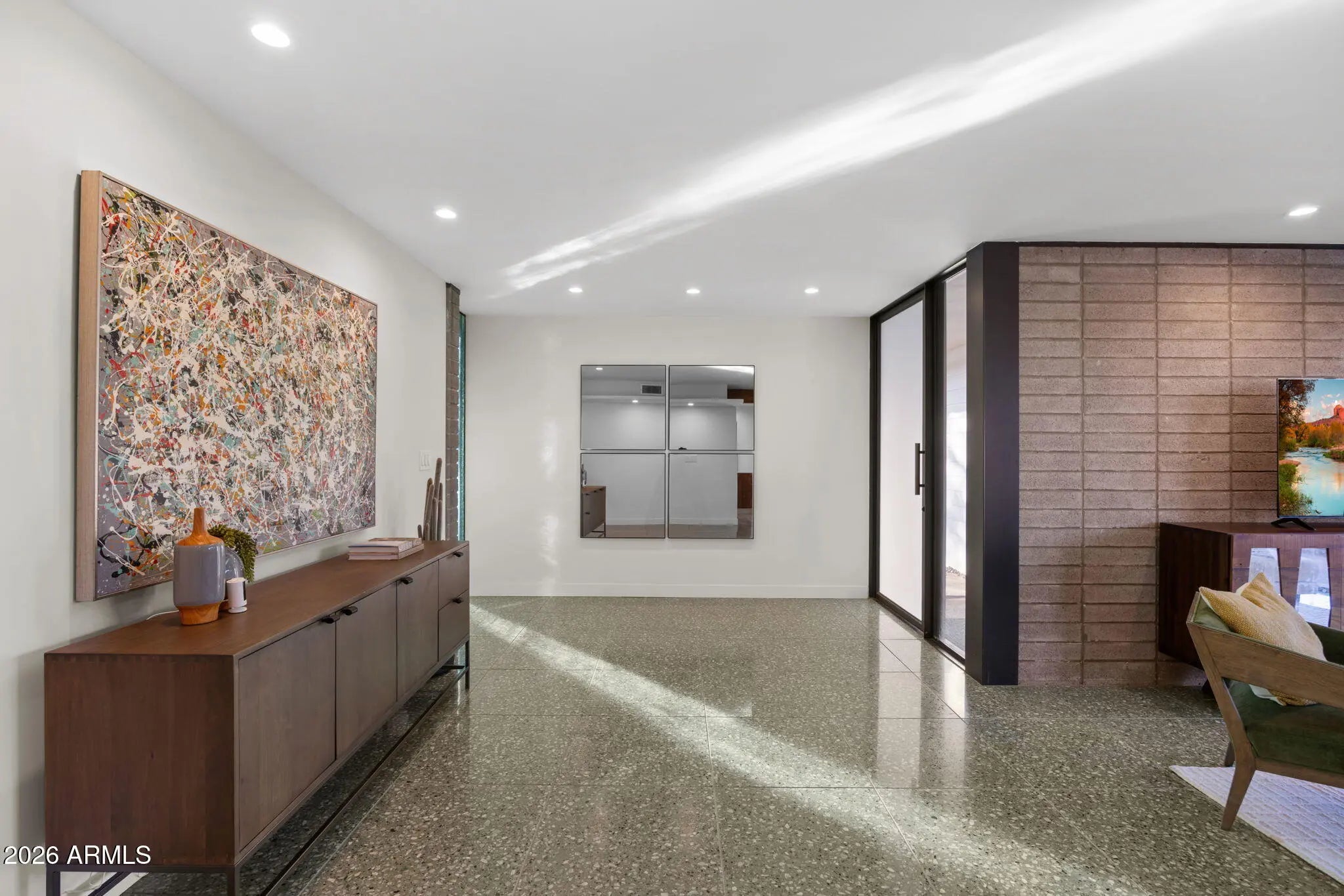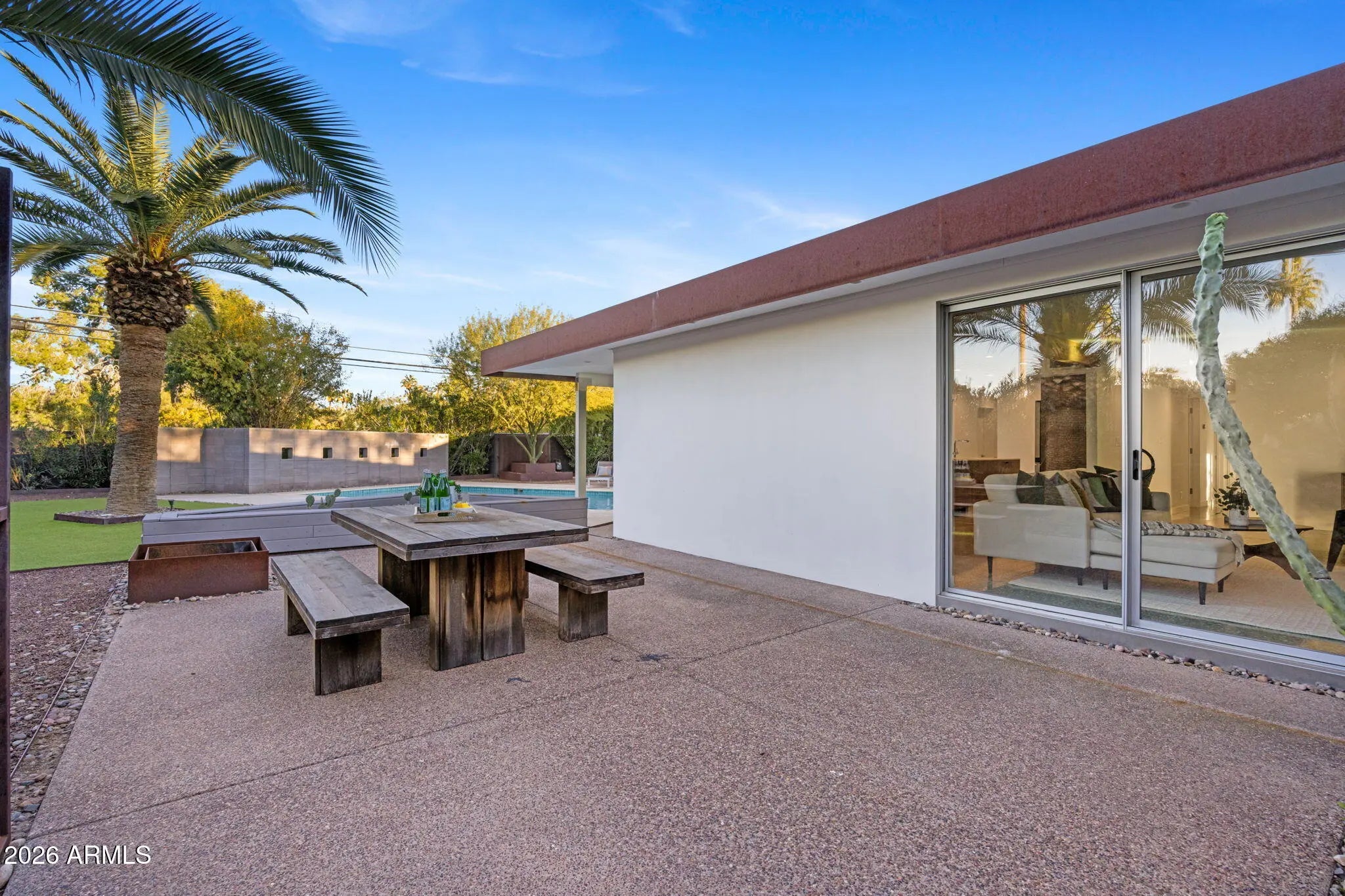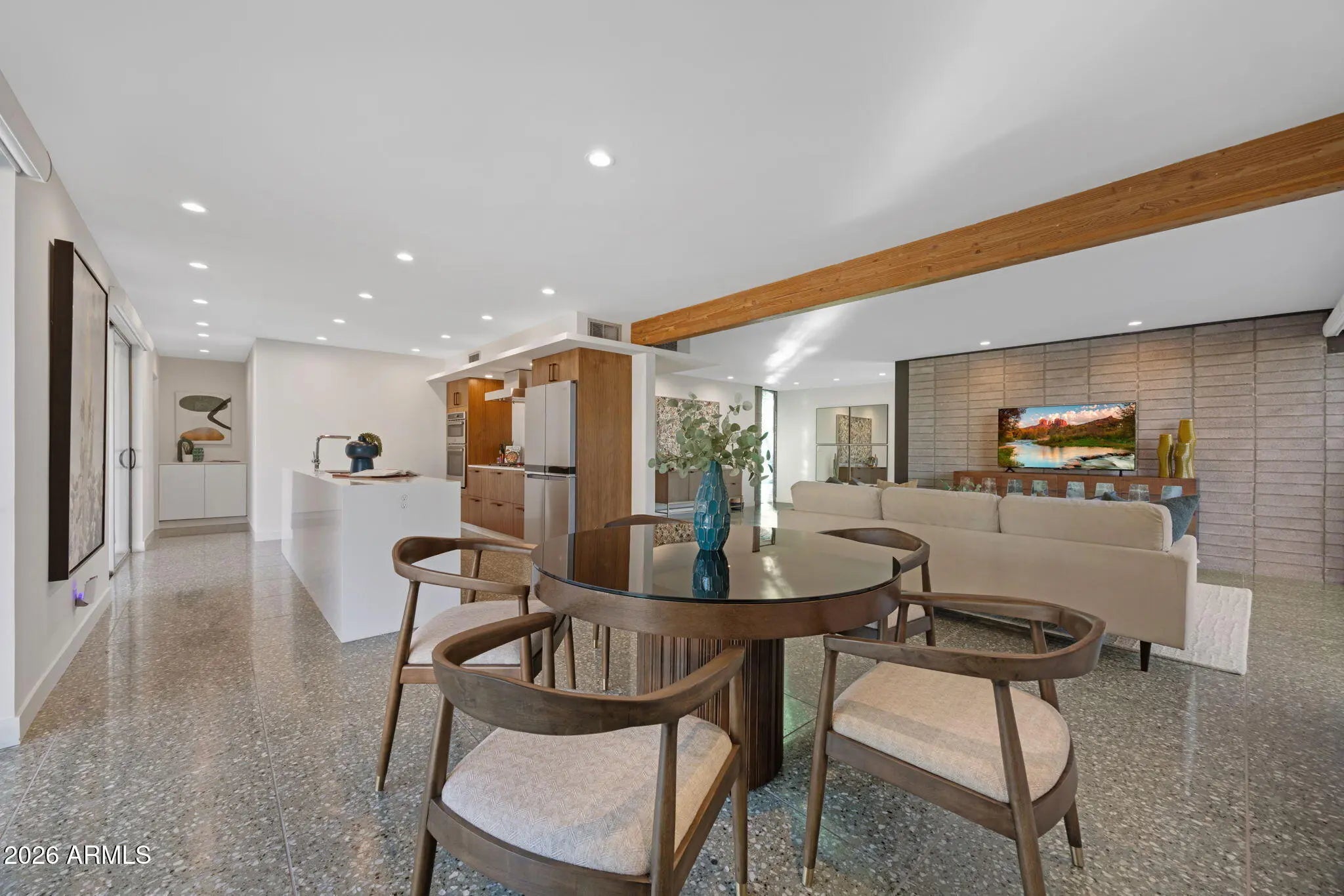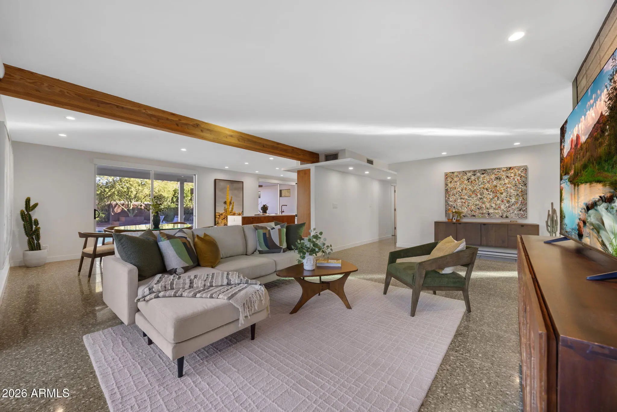 Located in Paradise Gardens, one of the only Phoenix neighborhoods designed by renowned architect Al Beadle, this fully renovated Cholla Model represents a rare opportunity to own an authentic example of mid-century desert modernism. Built in 1959, the home preserves Beadle's original architectural vision while integrating thoughtful modern updates. The residence offers 2,328 square feet with 3 bedrooms, 2 bathrooms, a dedicated office, and a private swimming pool. Original design elements include terrazzo flooring, rammed earth construction, breeze block walls, stacked glass, and steel fascia detailing. The home has been fully renovated with careful attention to maintaining its architectural integrity. The Euro-style kitchen features a waterfall island, modern cabinetry, and clean-lined finishes that align with the home's minimalist design language. Bathrooms have been updated with spa-inspired materials and fixtures. Lutron automated shades provide seamless light control throughout the living spaces. Interior and exterior finishes have been refreshed, and the pool has been resurfaced. The property includes a carport and sits approximately 0.5 miles from Shea Boulevard, about 1 mile from SR-51 access, and near the new Paradise Valley Mall redevelopment featuring Whole Foods, Sephora, Trevor's Liquor, and Flower Child. Central Phoenix, Paradise Valley, and Scottsdale destinations are easily accessible. Homes in Paradise Gardens are infrequently available, particularly those that retain original Al Beadle design elements alongside modern renovations. This property offers a rare opportunity to own a historically significant mid-century residence in a neighborhood recognized for its architectural pedigree.