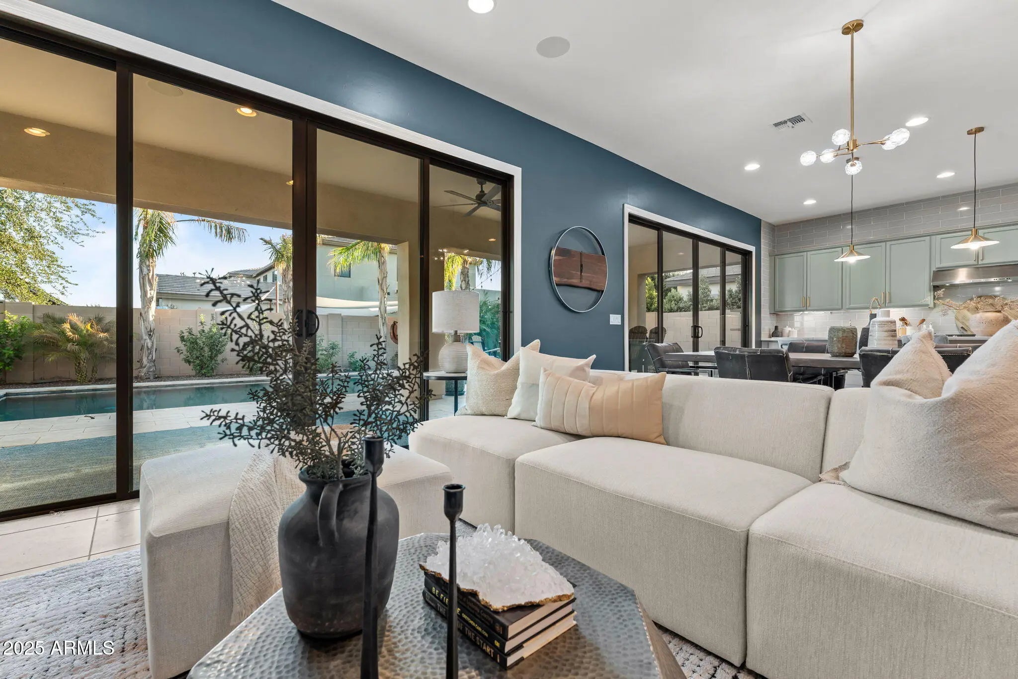Welcome to Avian Meadows by Toll Brothers, one of the Southeast Valley's most desirable neighborhoods. This beautifully designed single-level home features 4 bedrooms plus a den and a teen/media room with 3.5 baths in a spacious, split floor plan. The gourmet kitchen showcases quartz countertops, stunning cabinetry, a 36'' gas cooktop, 48'' built-in refrigerator, wall oven, and a large walk-in pantry. The primary suite offers a spa-like retreat with dual vanities, a soaking tub, and an oversized walk-in shower. Expansive living and entertaining spaces include the kitchen and great room with 24 feet of sliding glass doors, seamlessly connecting to the backyard for true indoor/outdoor living. Step outside to a resort-style backyard with travertine decking, a sparkling heated pool