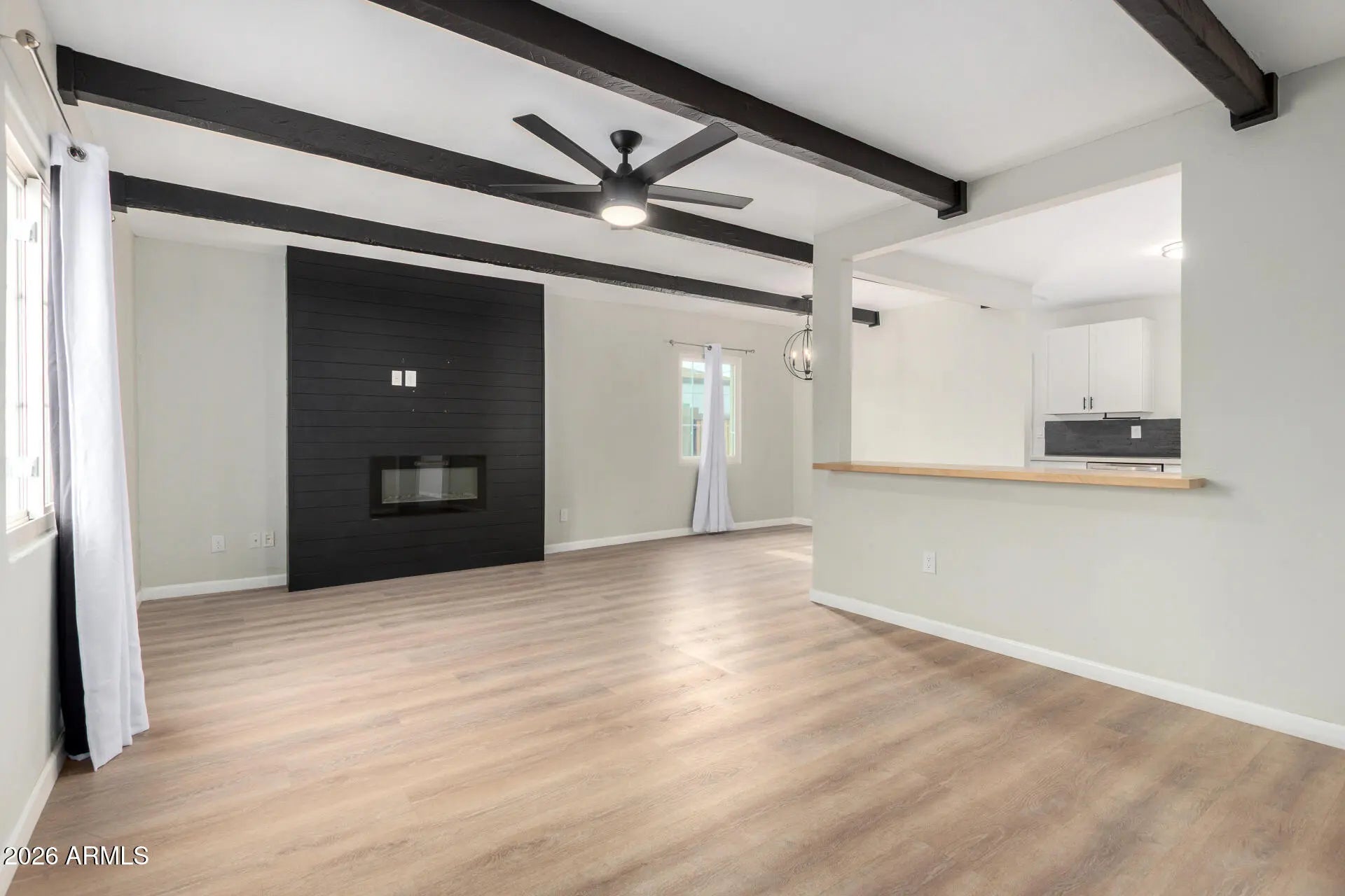 TASTEFULLY UPDATED home, ready to move in! This charming single-level residence displays a low-care front yard w/artificial turf and an RV gate w/parking & extended driveway. The inviting interior exudes modern style with a neutral palette, tons of natural light, and wood-look flooring throughout. You'll love the desirable great room paired with exposed beams and a cozy fireplace! The spotless eat-in kitchen boasts SS appliances, quartz counters, white shaker cabinetry, and a butcher block breakfast bar. With a 2-bed & 1-bath layout, this gem is perfect for anyone looking to enjoy easy and low-maintenance living. Check out the spacious backyard offering shade tree & citrus tree, along with a full-length covered patio to relax or have a fun BBQ! Great Phoenix location! Make this gem yours!