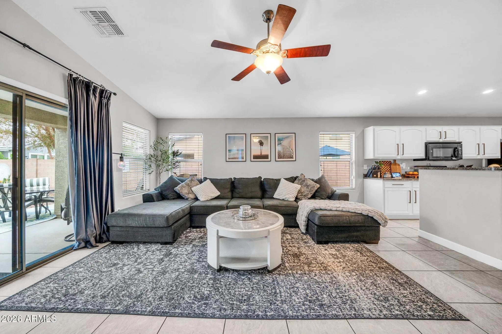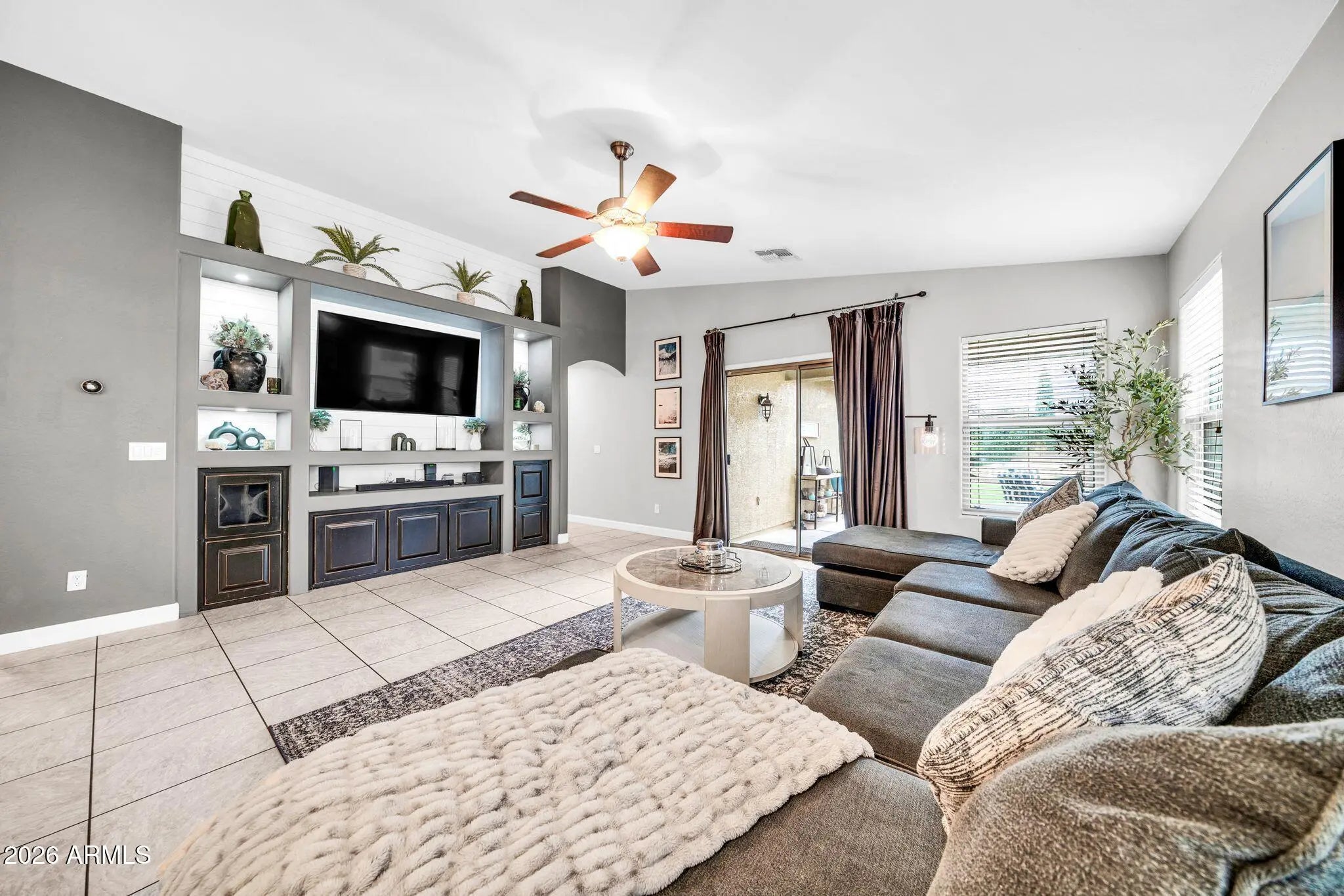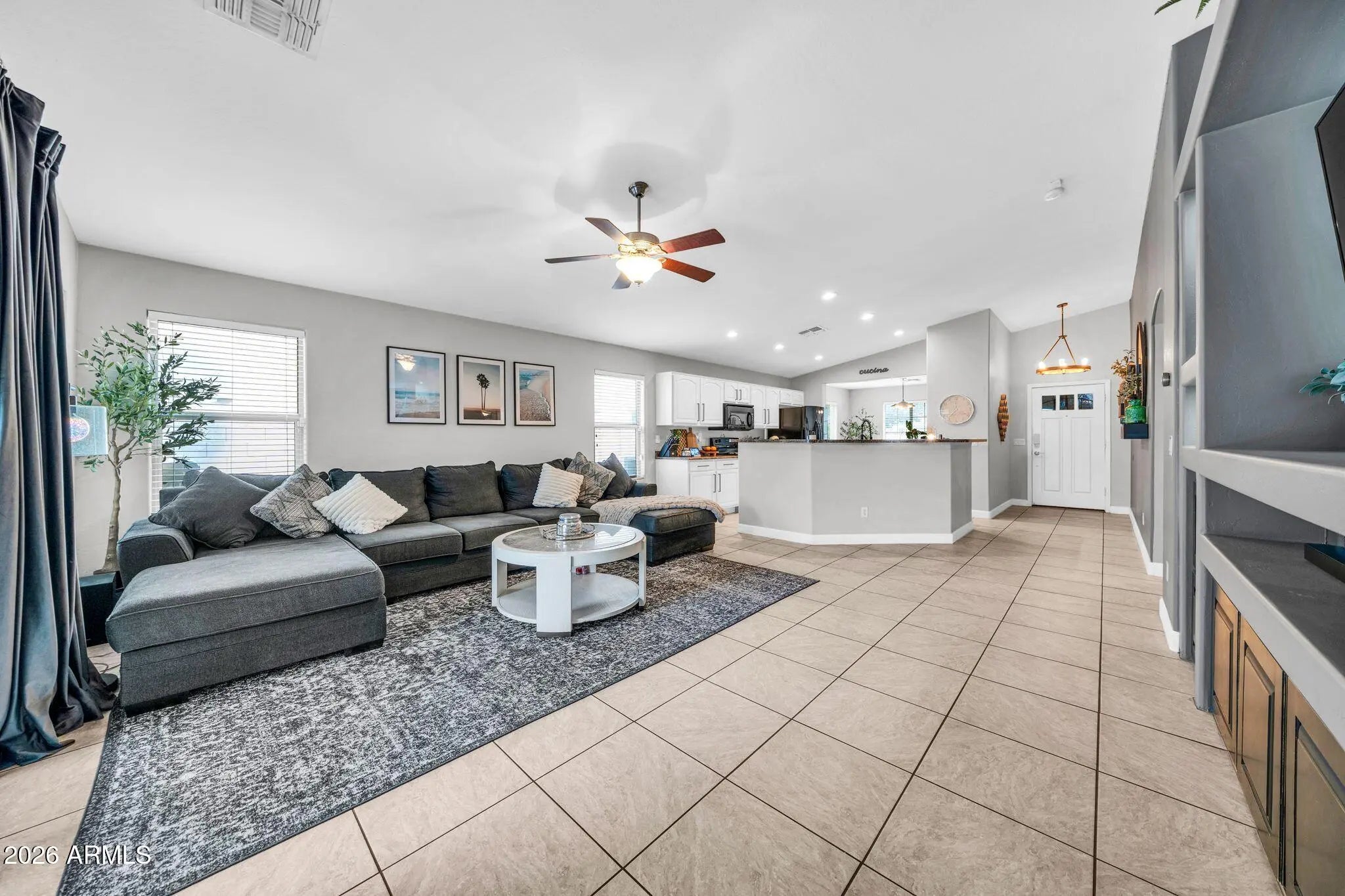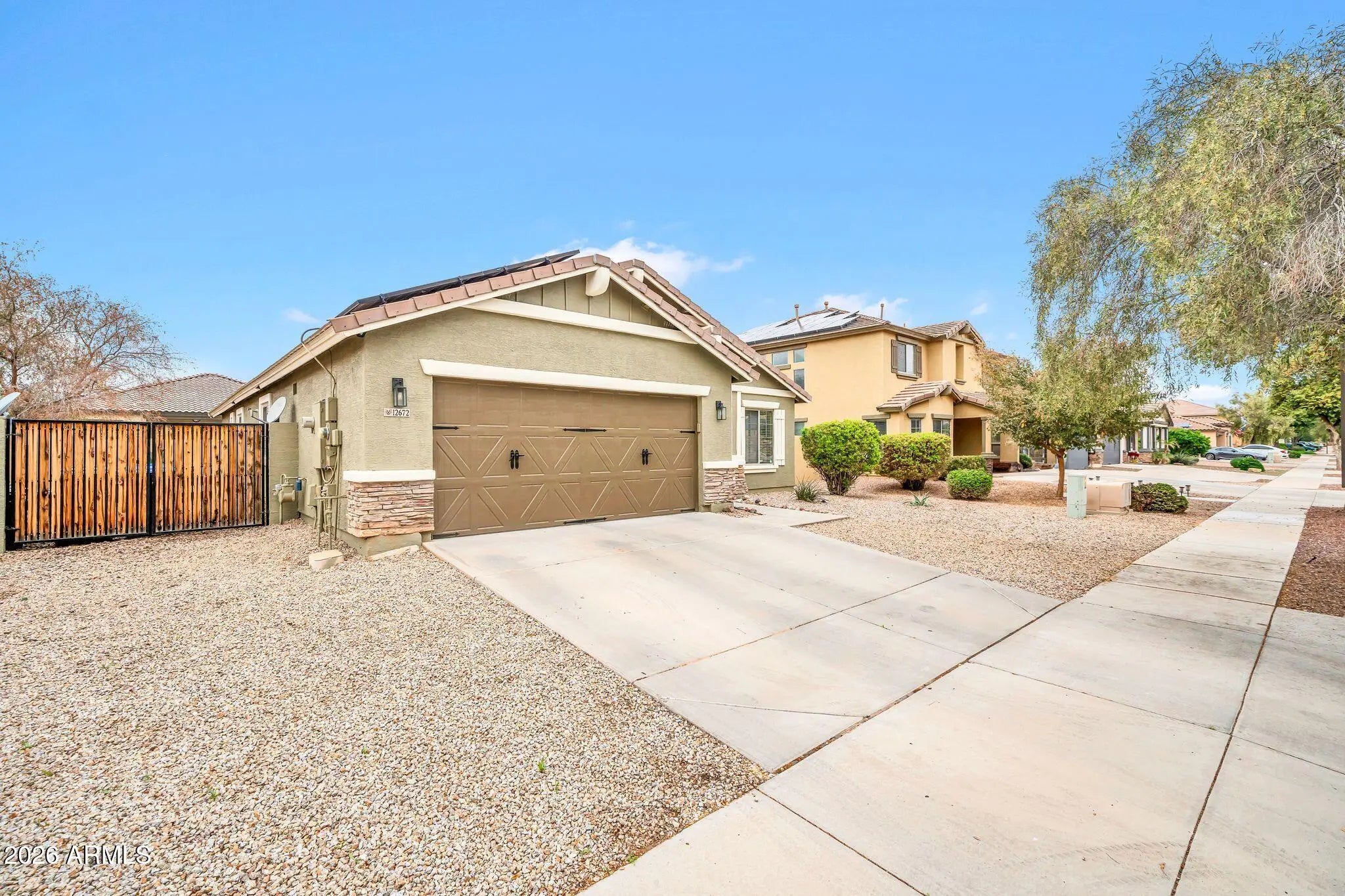 Welcome home to this beautifully maintained single-story residence offering 1,682 square feet of comfortable living in a peaceful Surprise, AZ subdivision. With 3 spacious bedrooms and 2 full bathrooms, this home strikes the perfect balance between functionality, style, and easy living. Step inside to find neutral tile flooring throughout all main areas, with plush carpet in the bedrooms. The open kitchen features refinish wood cabinetry, black appliances, and breakfast bar that flows seamlessly into the family room, highlighted by a stunning custom built-in entertainment wall. Retreat to the spacious primary suite with vaulted ceilings and beautiful newly renovated primary bath. One of the standout features is the freshly painted exterior along with the owned solar system, providing energy efficiency and long-term savings. The oversized lot offers endless possibilities for outdoor enjoyment, gardening, or future customization big enough to add a pool, while the RV gate adds rare flexibility for recreational vehicles, trailers, or additional storage. This inviting neighborhood is known for its welcoming atmosphere, making it a wonderful place to enjoy evening walks, or connect with neighbors in the many nearby parks that are close by. Take advantage of the brand-new businesses, shopping, restaurants and entertainment in this beautiful community. Combining modern updates, practical features, and a desirable setting, this home is truly move-in ready and offers something for every stage of life. Don't miss the opportunity to make it yours. Before you make your decision, this is a must-see home! Take your home tour today!