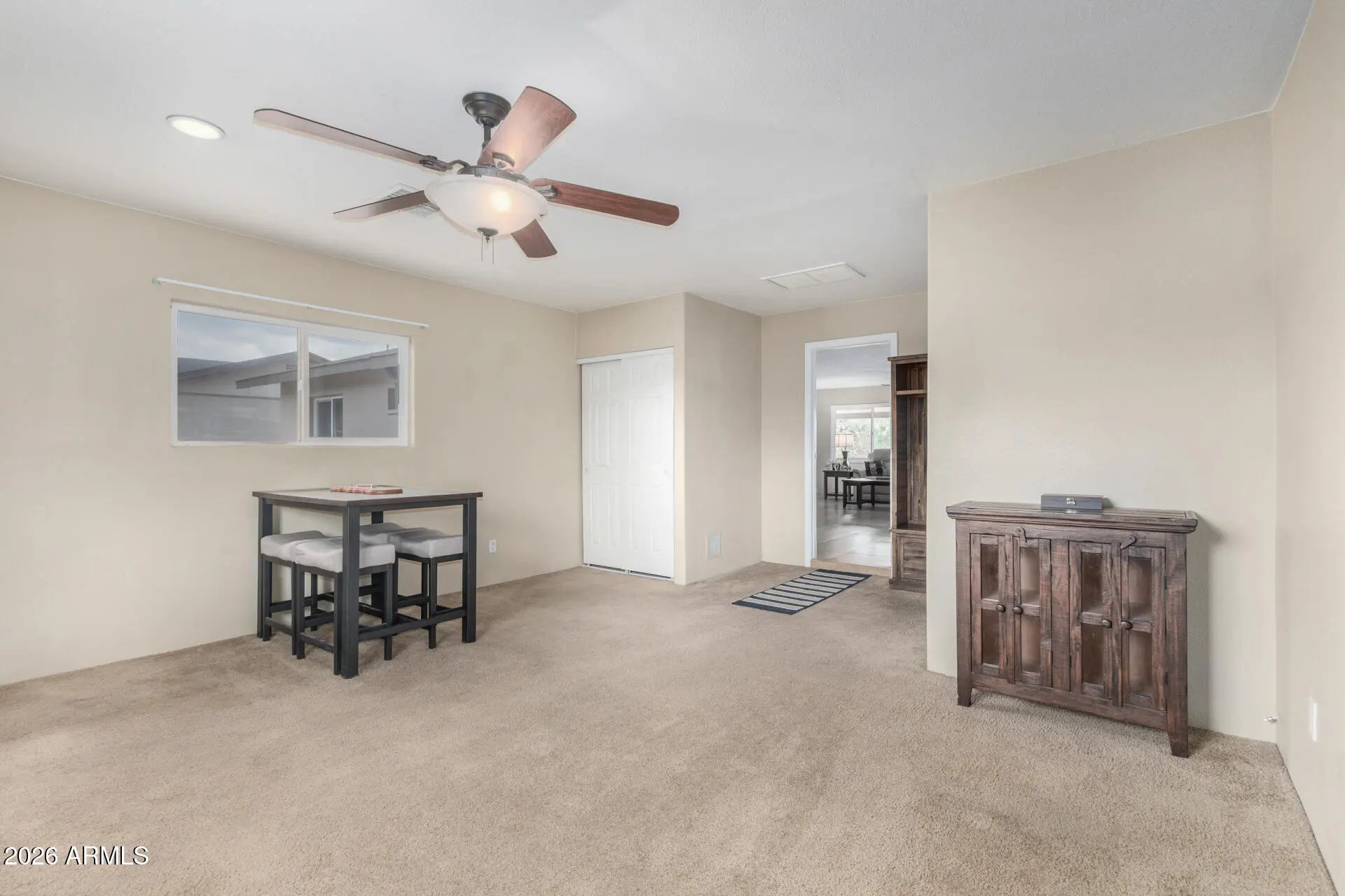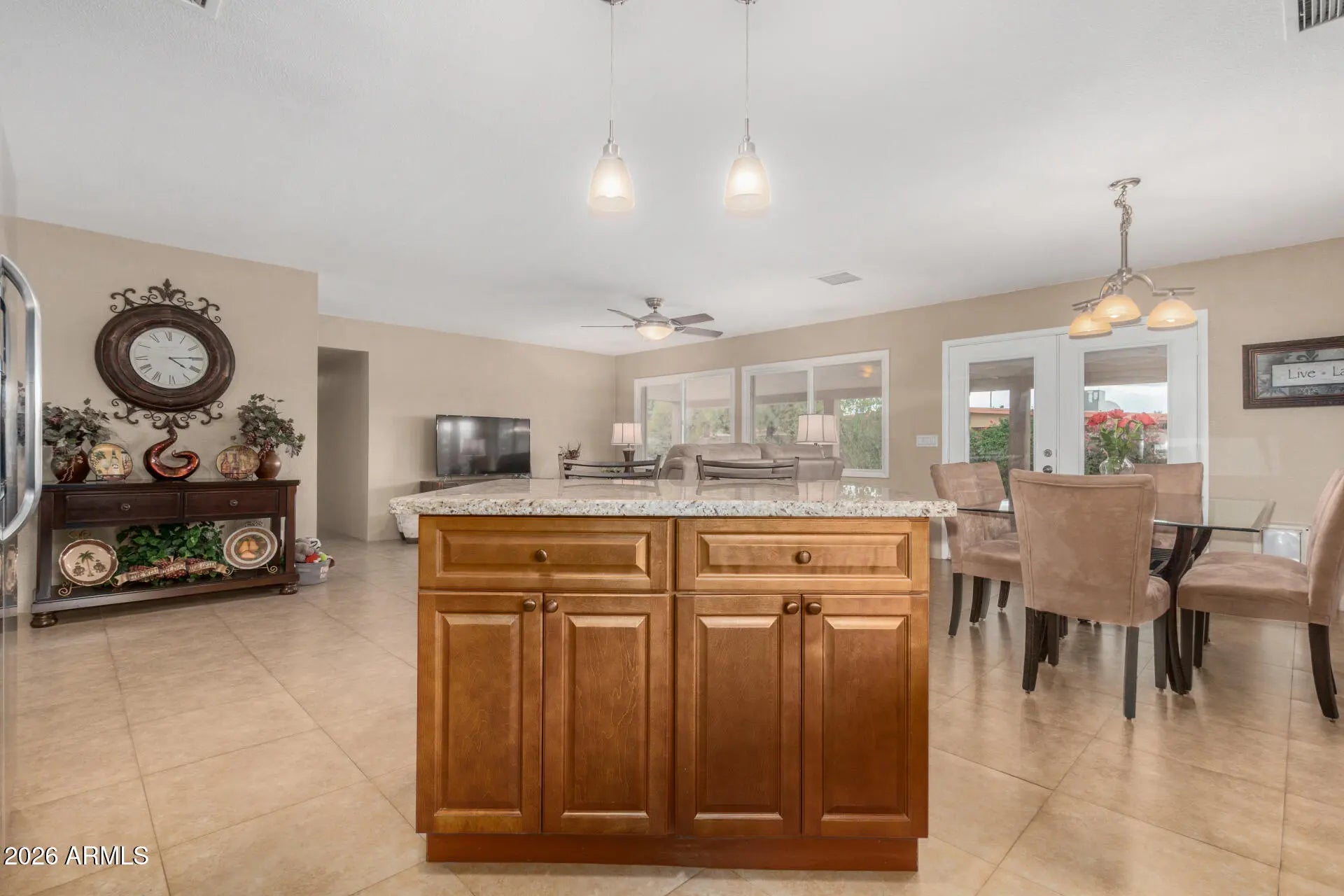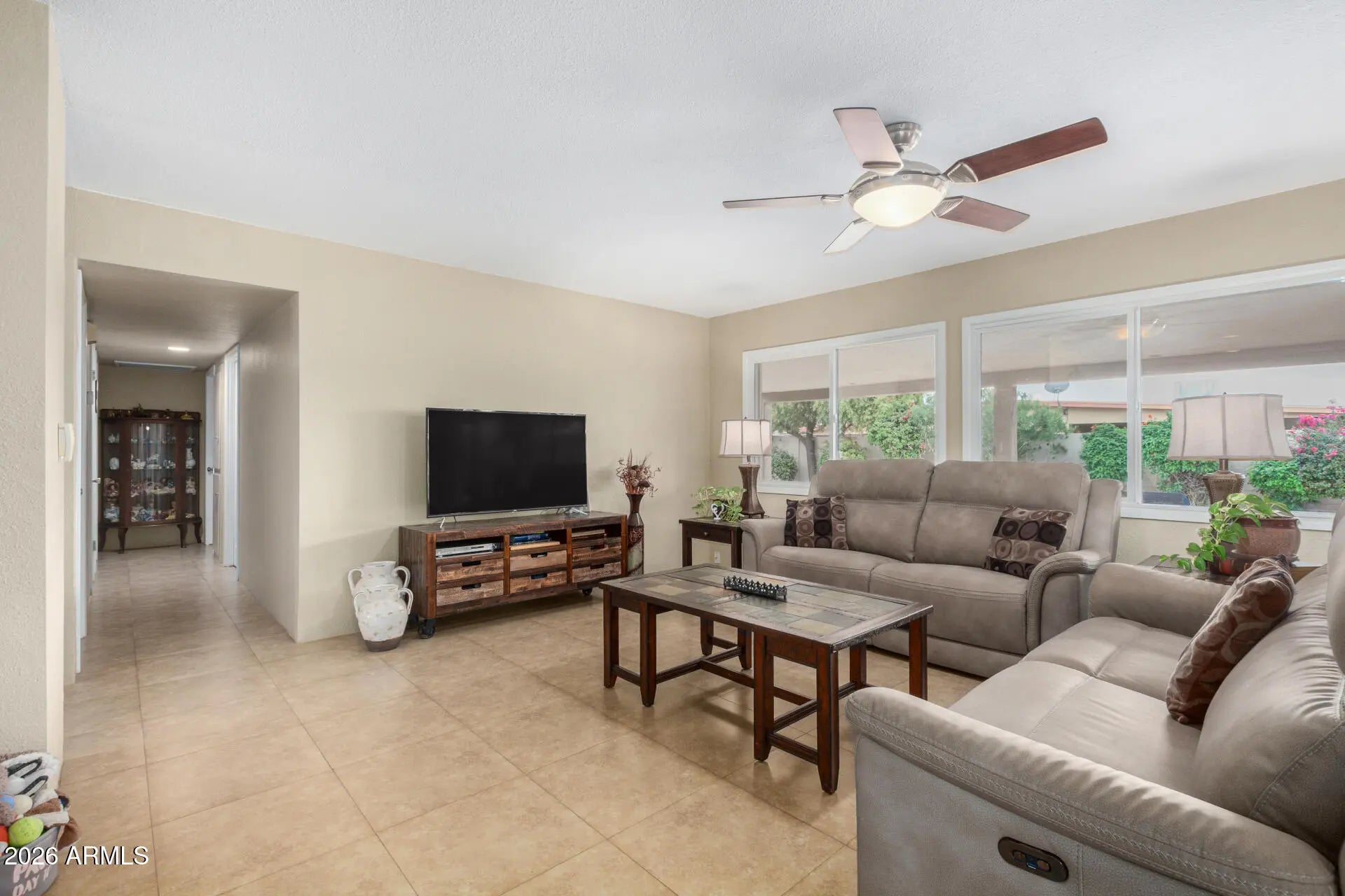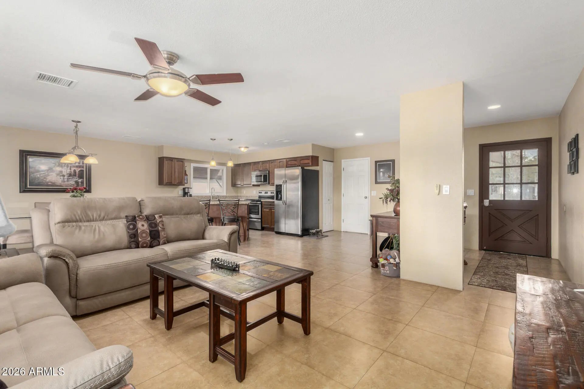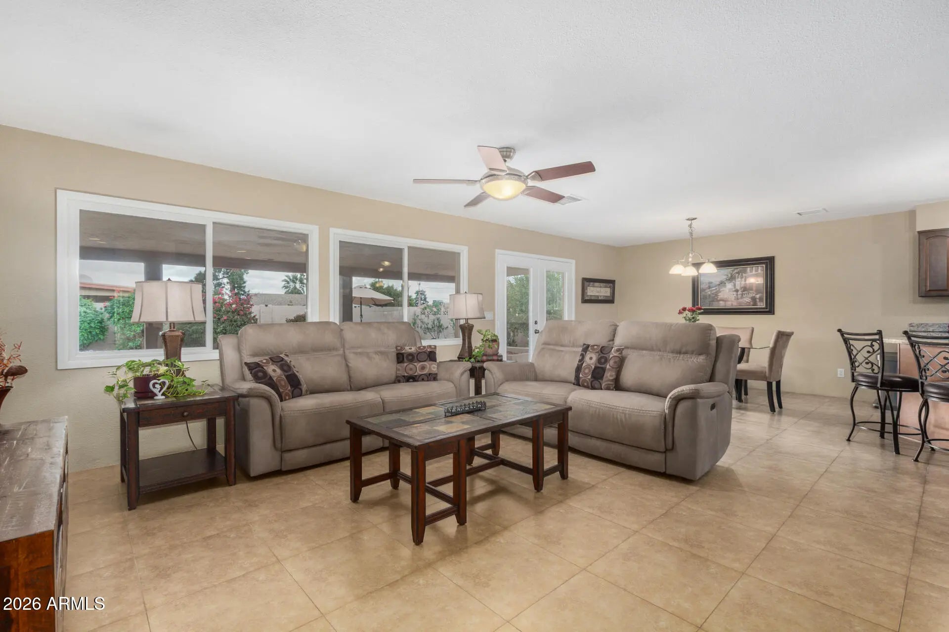 Spacious, inviting, and exceptionally well cared for, this home offers an open layout built for everyday living and effortless entertaining. The kitchen anchors the space with ample cabinetry, stainless steel appliances, and a center island that flows naturally into the main living areas. Tile flooring runs throughout the home, complemented by neutral finishes and generously sized bedrooms. Oversized laundry room provides excellent storage space! A thoughtfully converted garage adds a flexible fourth bedroom, perfect for guests, a home office, or extra living space. Fresh exterior paint enhances curb appeal and reflects the pride of ownership found throughout the property. The backyard is where this home really shines, featuring a play pool, covered patio, and built in planters ready for flowers or greenery. It is ideal for relaxing, hosting, or enjoying Arizona summers the right way. The solar system actually makes sense here. The payment is just $71 per month, with no escalation ever. That means predictable savings without the usual solar headaches. And yes, it needs to be said. This is genuinely one of the cleanest homes you will see at this price point. The condition is immaculate, the pride of ownership shows everywhere, and it is truly a must see. A fantastic opportunity for a first home or anyone looking for a move in ready property with flexible space and strong value.