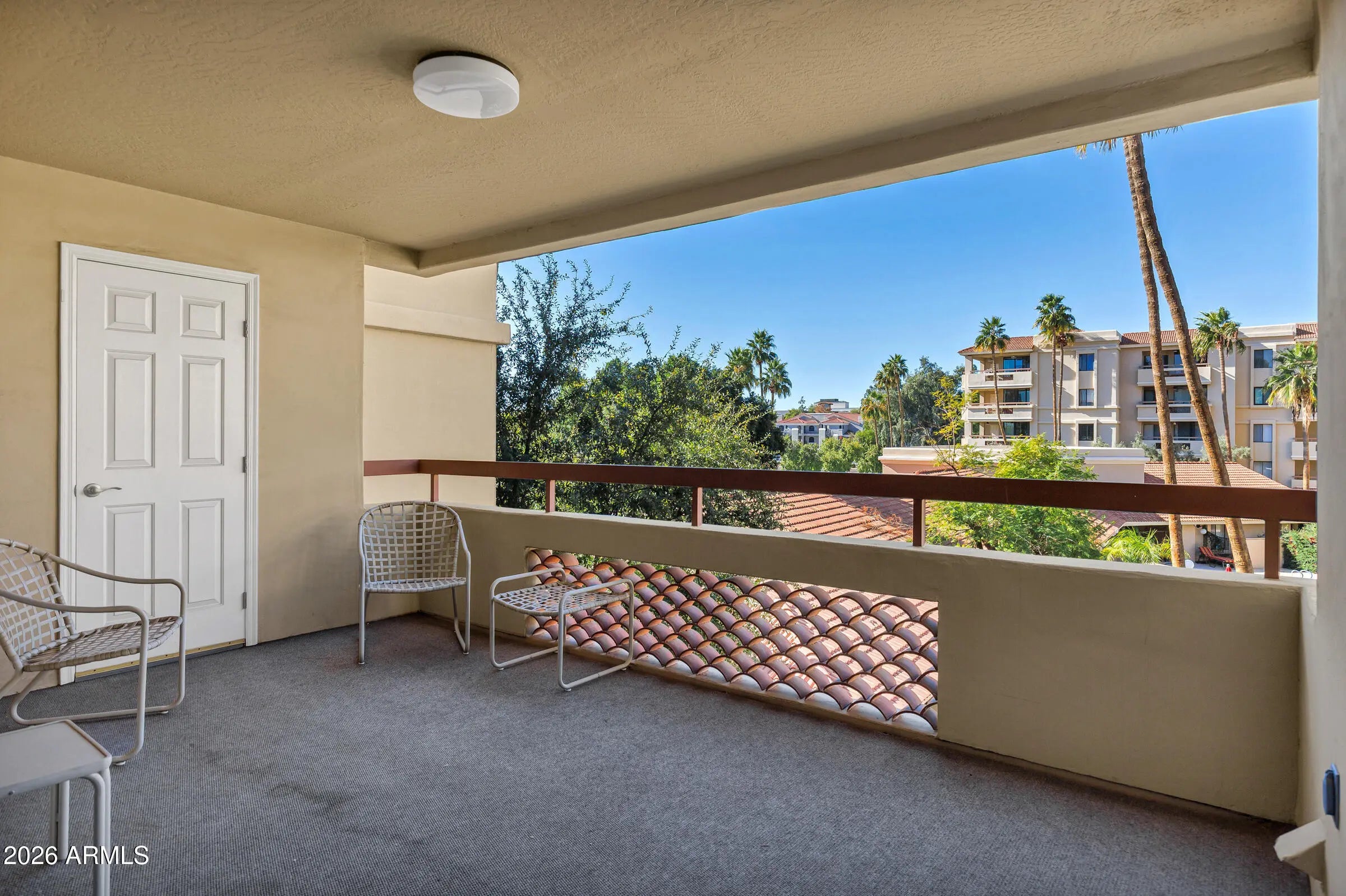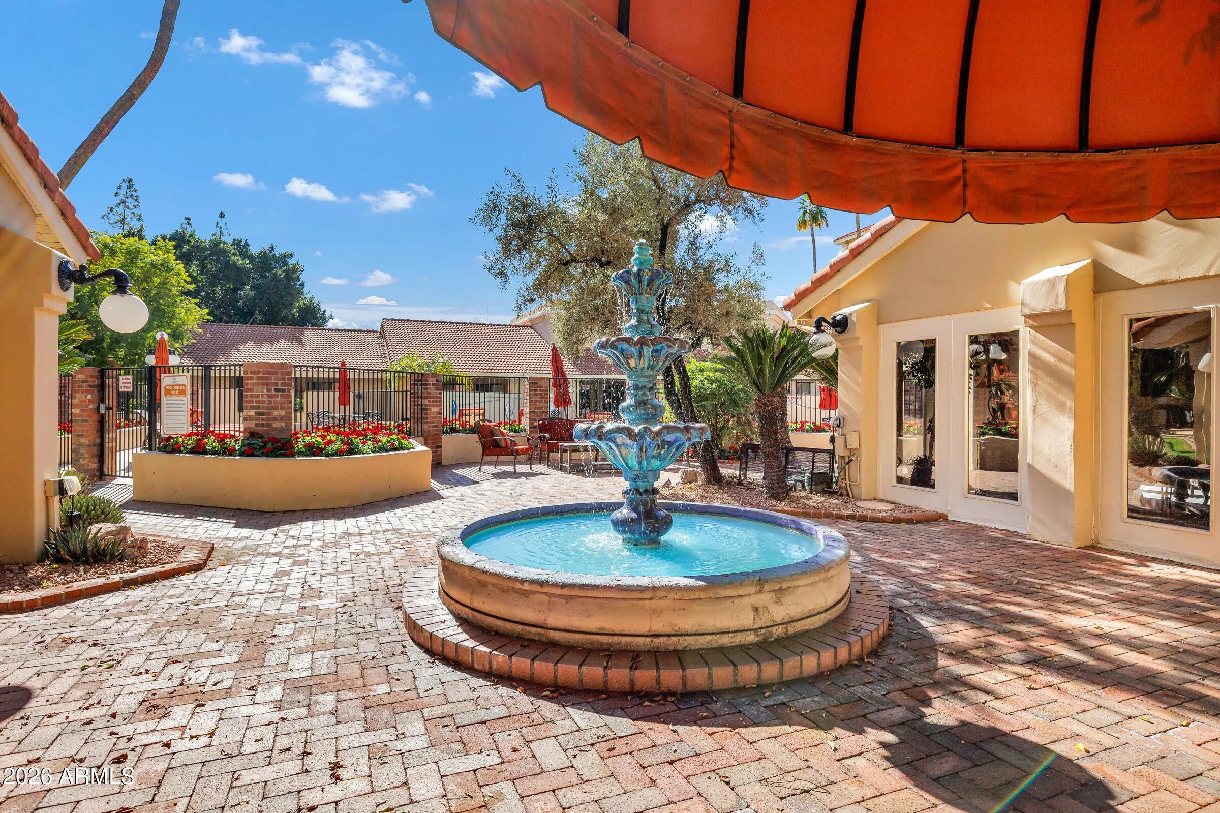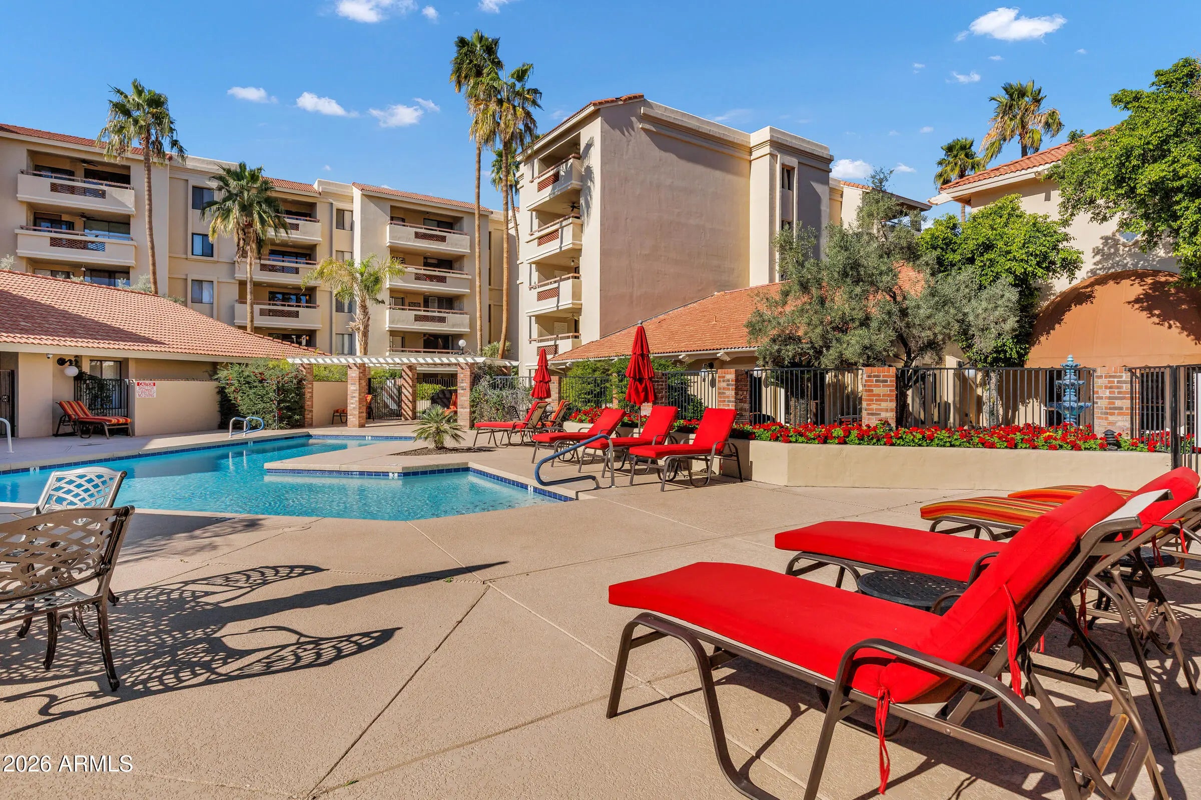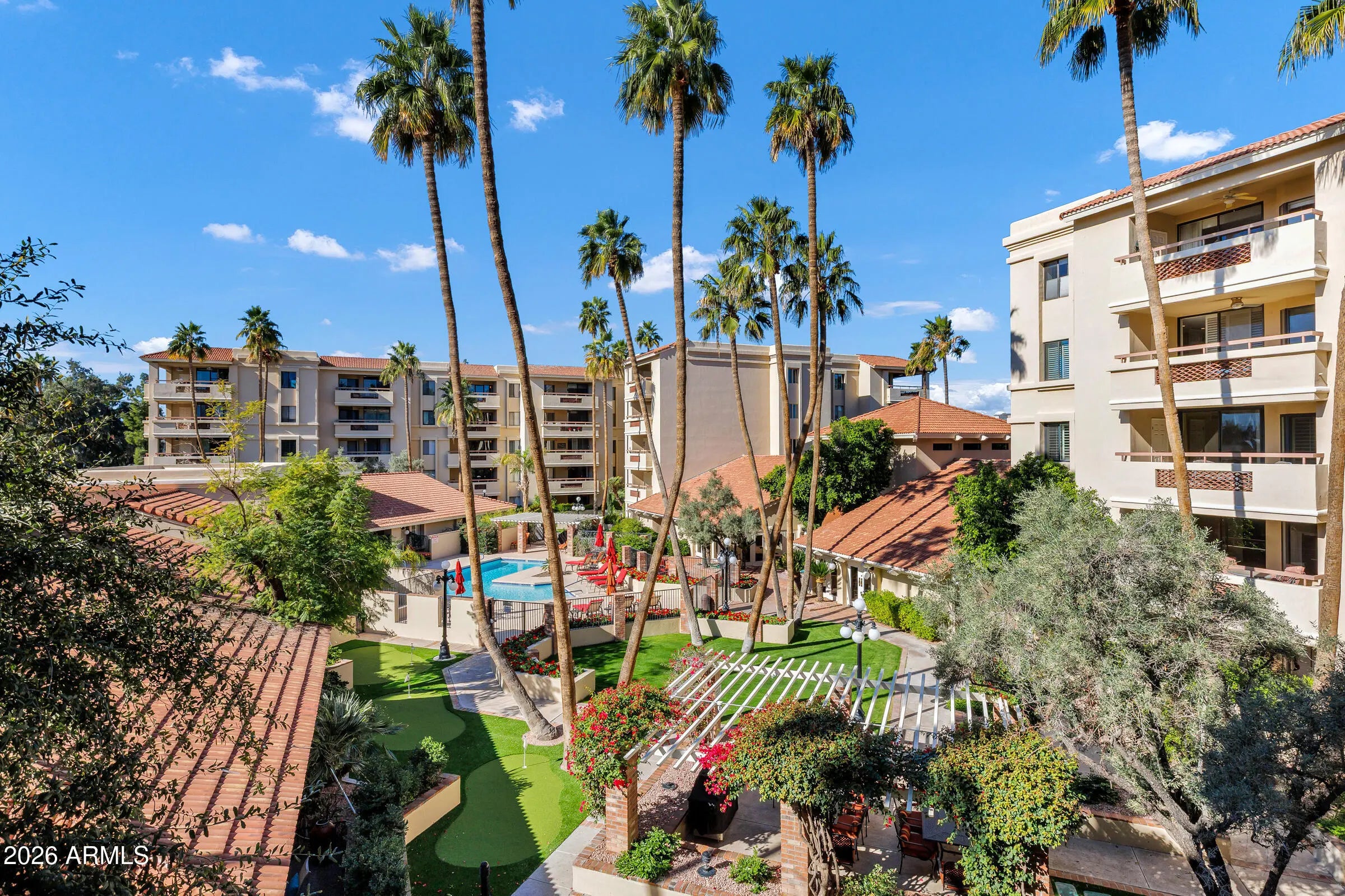 Perfectly positioned at Marquessa, this move-in-ready condo overlooks the peaceful courtyard and pool and features NEW carpet in both bedrooms and an open, inviting layout. The kitchen includes tiled countertops, a glass-top range, breakfast bar, pantry, and a spacious dining area flowing into the living room. The primary suite offers a ¾ bath and walk-in closet, while the second bedroom sits near a full hallway bath—ideal for guests or a home office. Extras include in-unit laundry, plus a rare private storage room off the balcony. Unbeatable Scottsdale location just minutes from Old Town, Fashion Square, and the Waterfront.