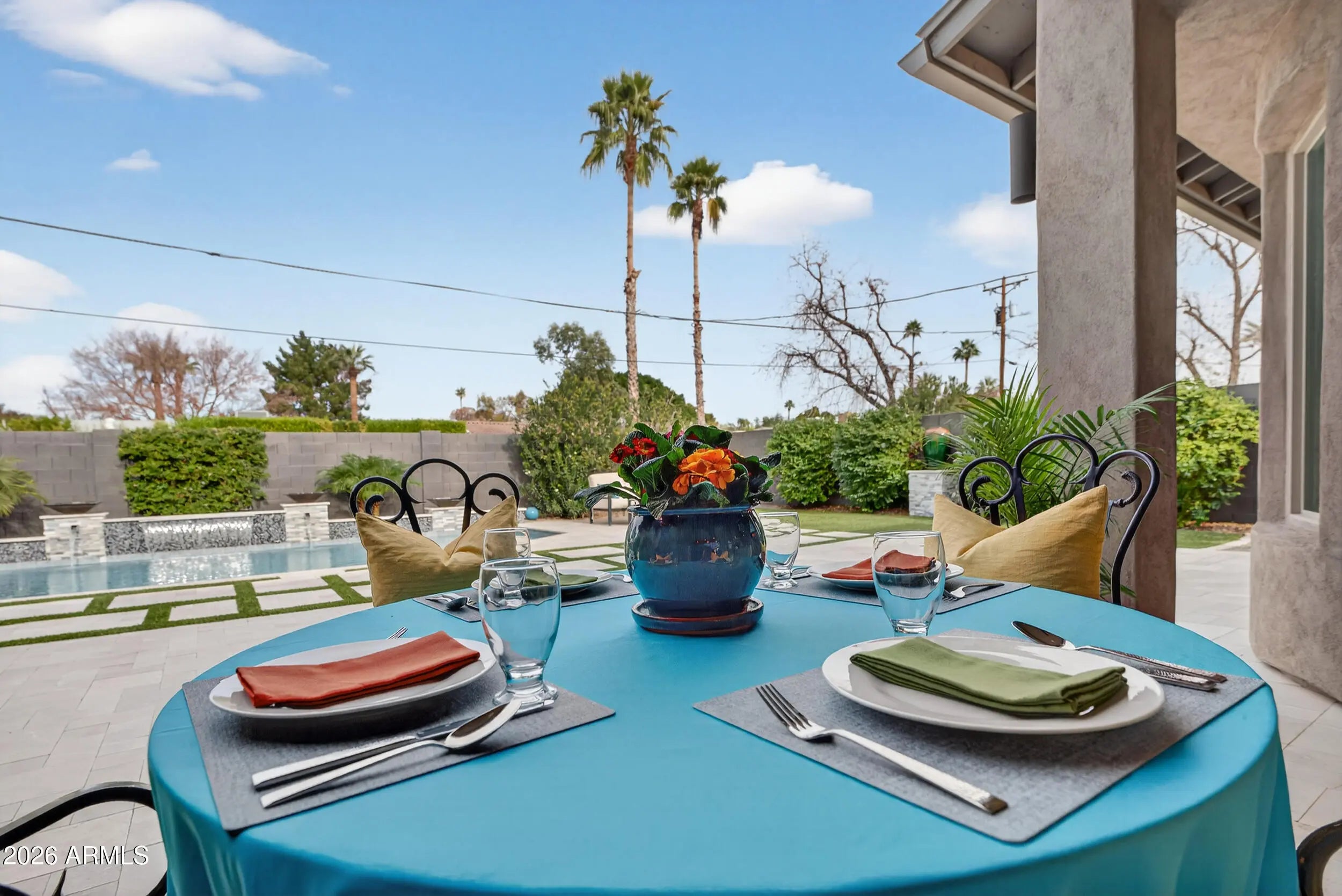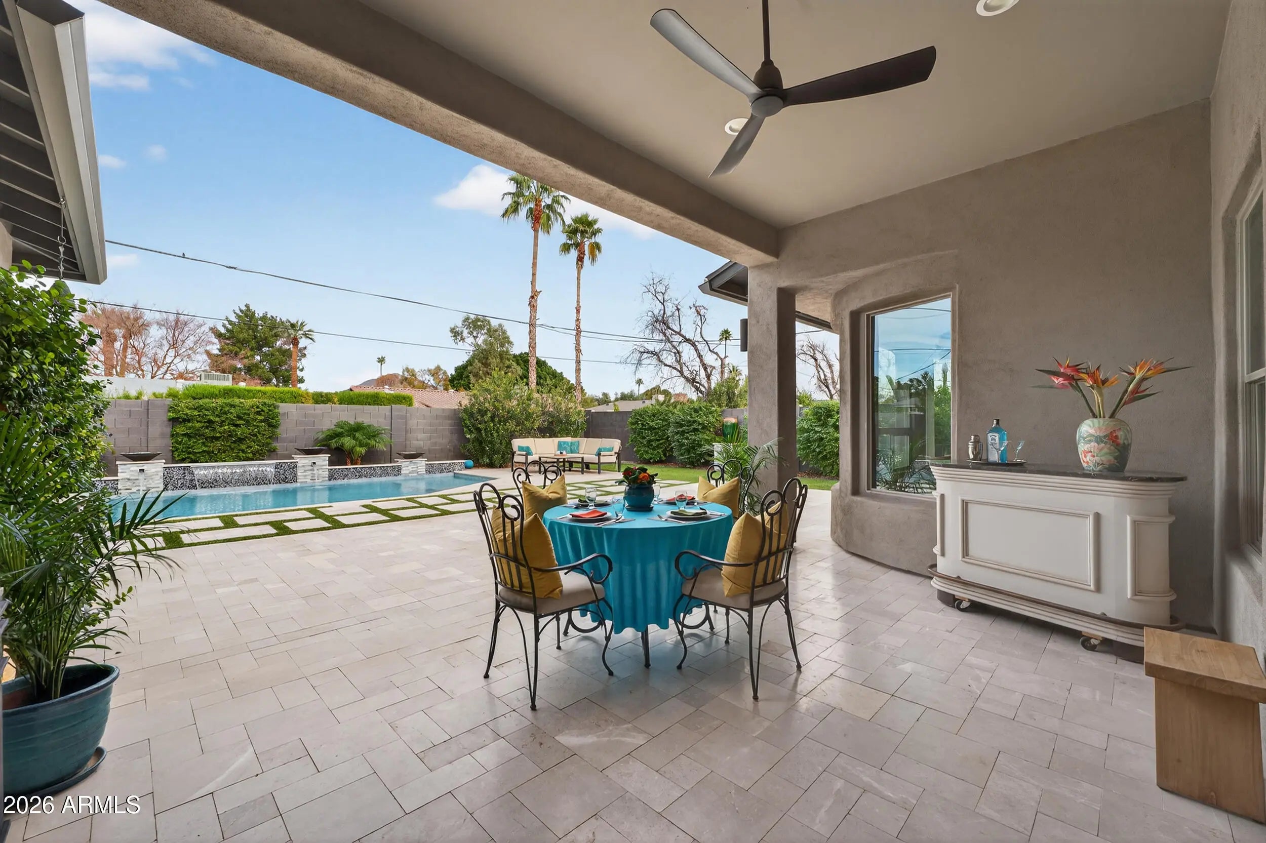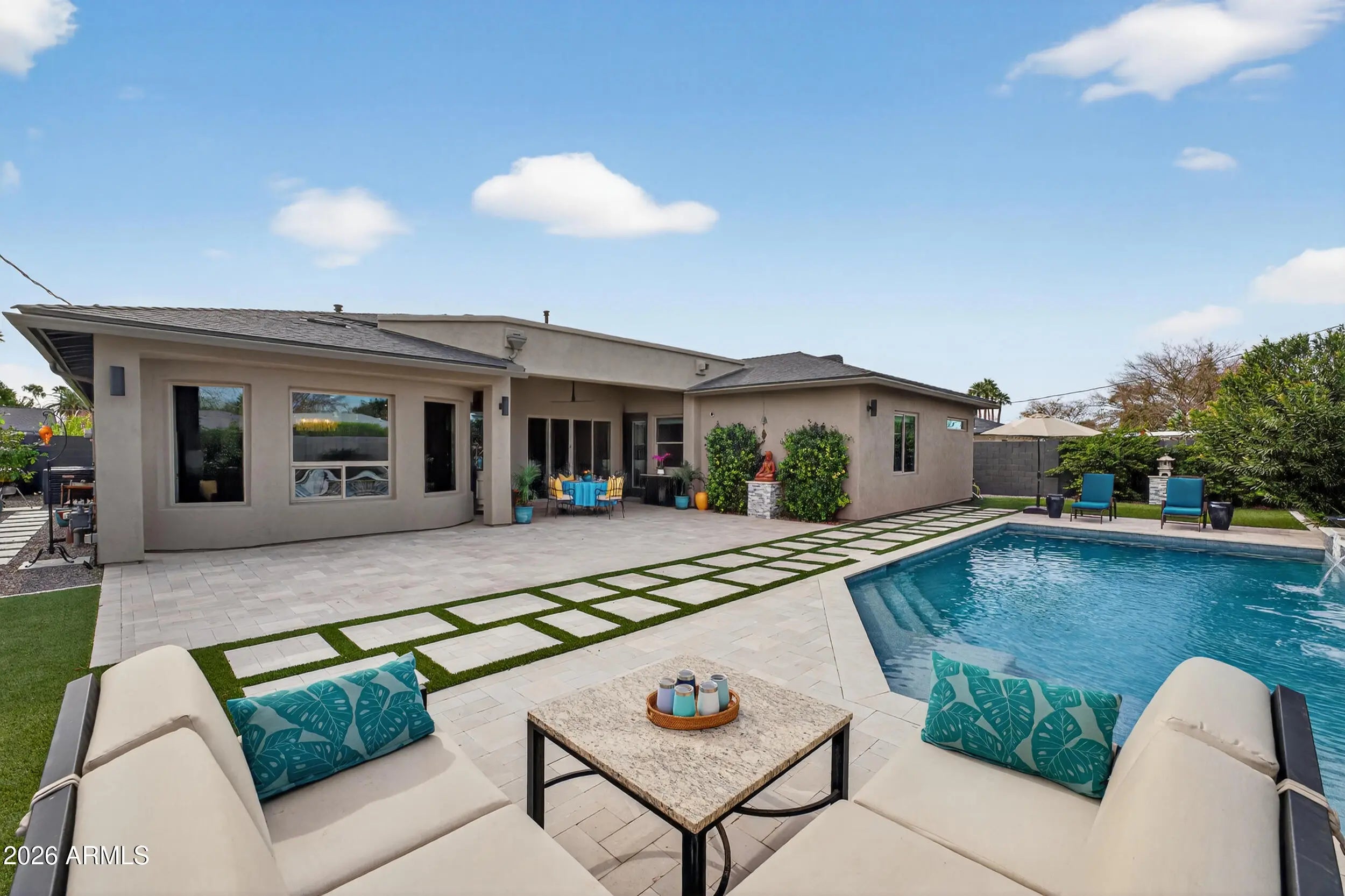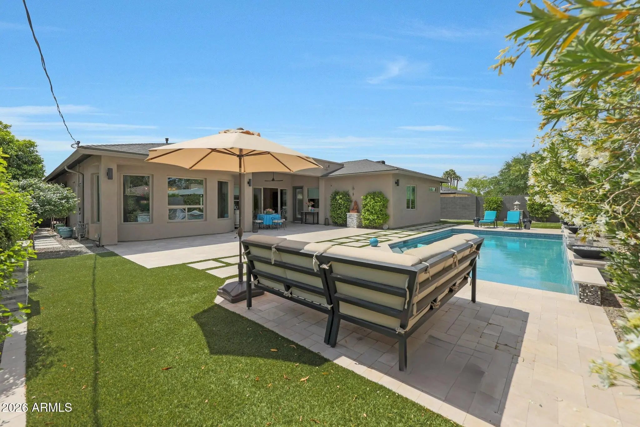 Experience refined, all-season living in this custom-built residence located just south of Arcadia. This home features expansive indoor spaces that flow seamlessly into resort-style outdoor living, creating an exceptional setting for both relaxed living and elevated entertaining. Every detail has been carefully curated to create a tranquil sanctuary, where indoor contemporary elegance blends seamlessly with the beauty of the outdoors. A serene, cohesive color palette flows throughout the home, enhancing its sense of calm, sophistication, and timeless appeal. Perfectly suited for everyday luxury and memorable gatherings, this residence offers a stunning backdrop for your next chapter in life. Inside appreciate the open floor plan, natural light filled rooms, high ceilings and luxury finishes. The gourmet kitchen overlooks the main living and dining areas. Outside, the sparkling heated pool is the focal point w/ waterfall and gas features. A covered patio, travertine decking, greenery, statuary & lighting pull it all together. Perfect for entertaining or solo downtime. Designed for enjoyment 365 days a year. Back inside, a large primary suite w/ access to the backyard. Luxurious en-suite bath w/ dual sinks, separate tub/shower & customized walk in closet. 2 guest bedrooms share a jack/jill bathroom w/ dual sinks & walk in shower. 4th bedroom configured as media room w/ walk in closet. Minutes from Arcadia's dining & shopping. Convenient access to loop 202, SR143 and Sky Harbor.