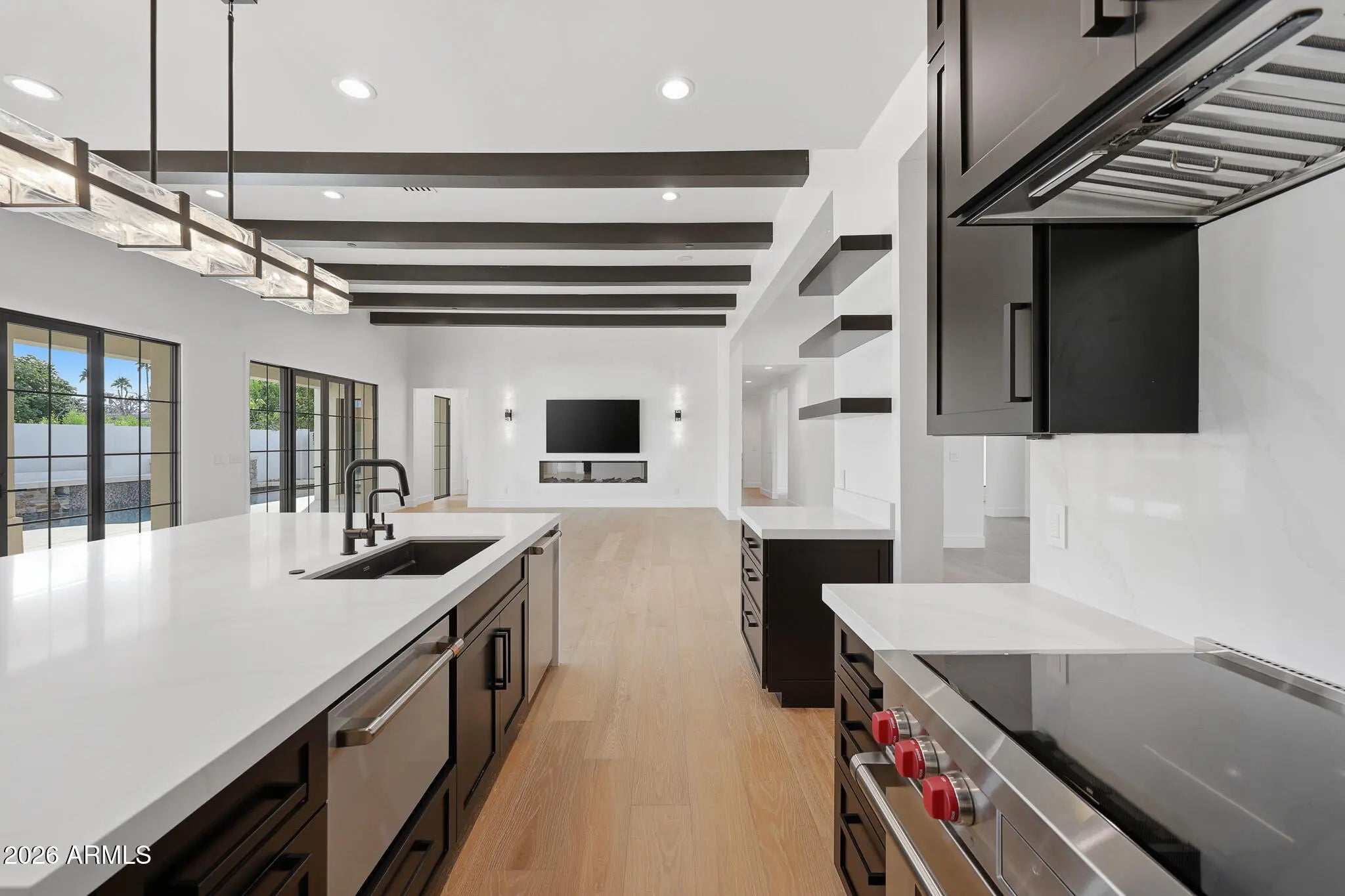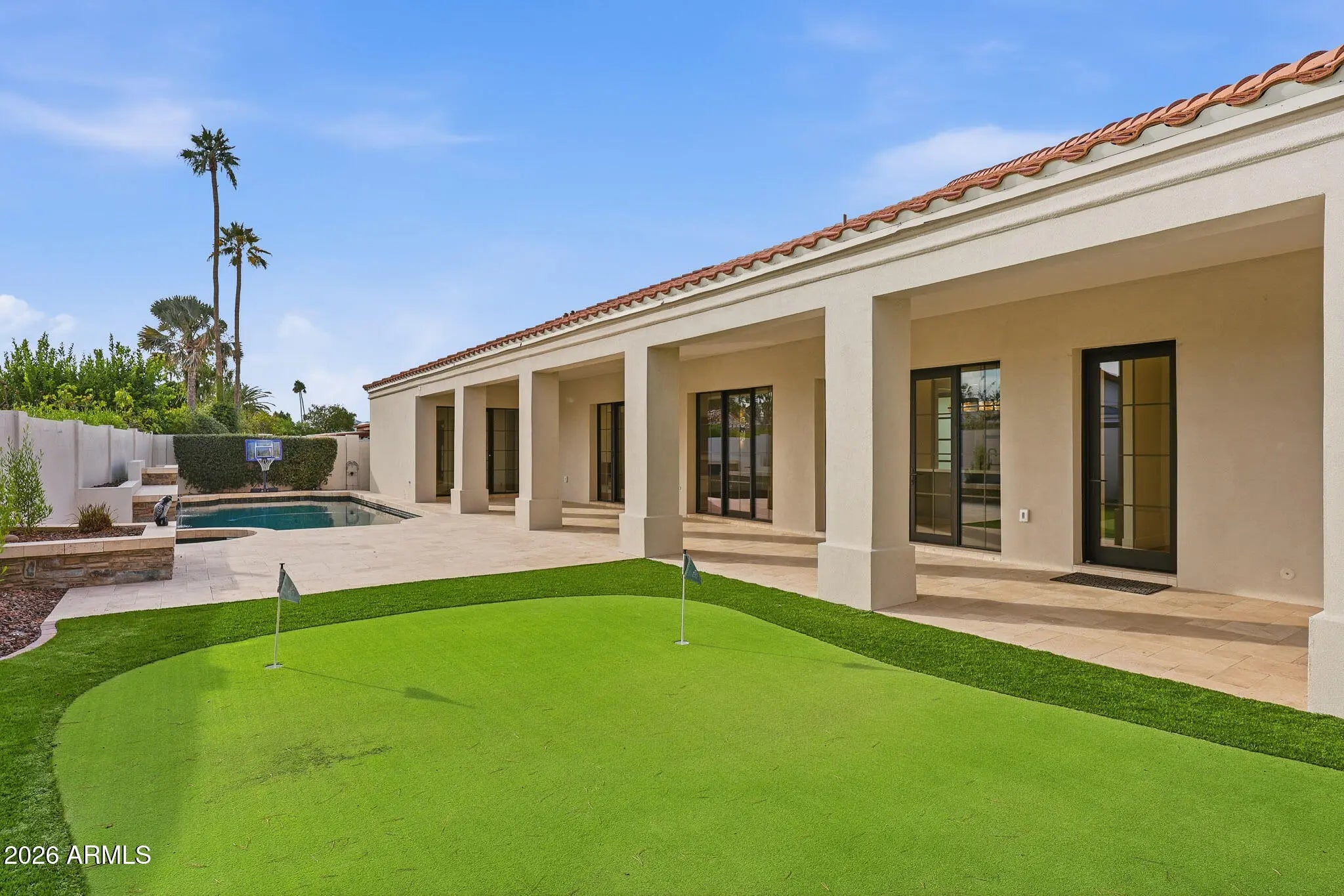 Spectacular, fully reimagined residence showcasing a complete top-to-bottom remodel with the finest high-end finishes throughout. This stunning 3,567-square-foot home offers a desirable split floor plan with 4 bedrooms, 3.5 bathrooms, and a rare 3-car garage featuring epoxy floors and two separate storage rooms, including a dedicated space for refuse containers. Ideally situated on a north/south-facing interior lot in the highly sought-after McCormick Ranch community. The resort-style backyard is designed for both relaxation and entertaining, complete with an RV gate, heated lap / play pool with water feature, spa, and putting green. Low-maintenance artificial turf enhances both the front and rear yards. Every detail of the home has been thoughtfully upgraded, including all-new stucco, interior and exterior paint, roof and underlayment, doors and windows, plumbing, lighting, fixtures, and hardware. Additional improvements include two new A/C's, water heater, water softener, new garage doors, updated fire sprinkler system, and new AC vents, baseboards, and door casings. Gorgeous new oak hardwood flooring flows throughout the home. The completely redesigned chef's kitchen features a Wolf induction range, Sub-Zero refrigerator, expansive quartz island and countertops, self-closing cabinetry, dishwasher, additional glassware dishwasher, breakfast bar, and a dedicated coffee bar. The formal dining room includes a new wet bar with wine and beverage refrigerators. An impressive 83" electric fireplace anchors the family room, complemented by beautiful wood-beam ceilings. The reconfigured floor plan adds a new half bath, a bonus lounge/den, and enhanced access to the primary suite. Three new sets of French doors open seamlessly to the backyard, while a stunning front pivot door with filtered privacy glass creates a dramatic entry. The luxurious primary bath is truly exceptional, featuring a soaking tub, spacious walk-in shower, and an expansive custom walk-in closet with built-in organizers and stacked washer and dryer. Additional highlights include new barn doors in bedrooms and multiple in-home conveniences. Conveying with the home are two washers, two dryers, two beverage refrigerators, a wine refrigerator, and the family room television. A rare opportunity to own a truly turnkey luxury home in one of Scottsdale's most coveted neighborhoods!