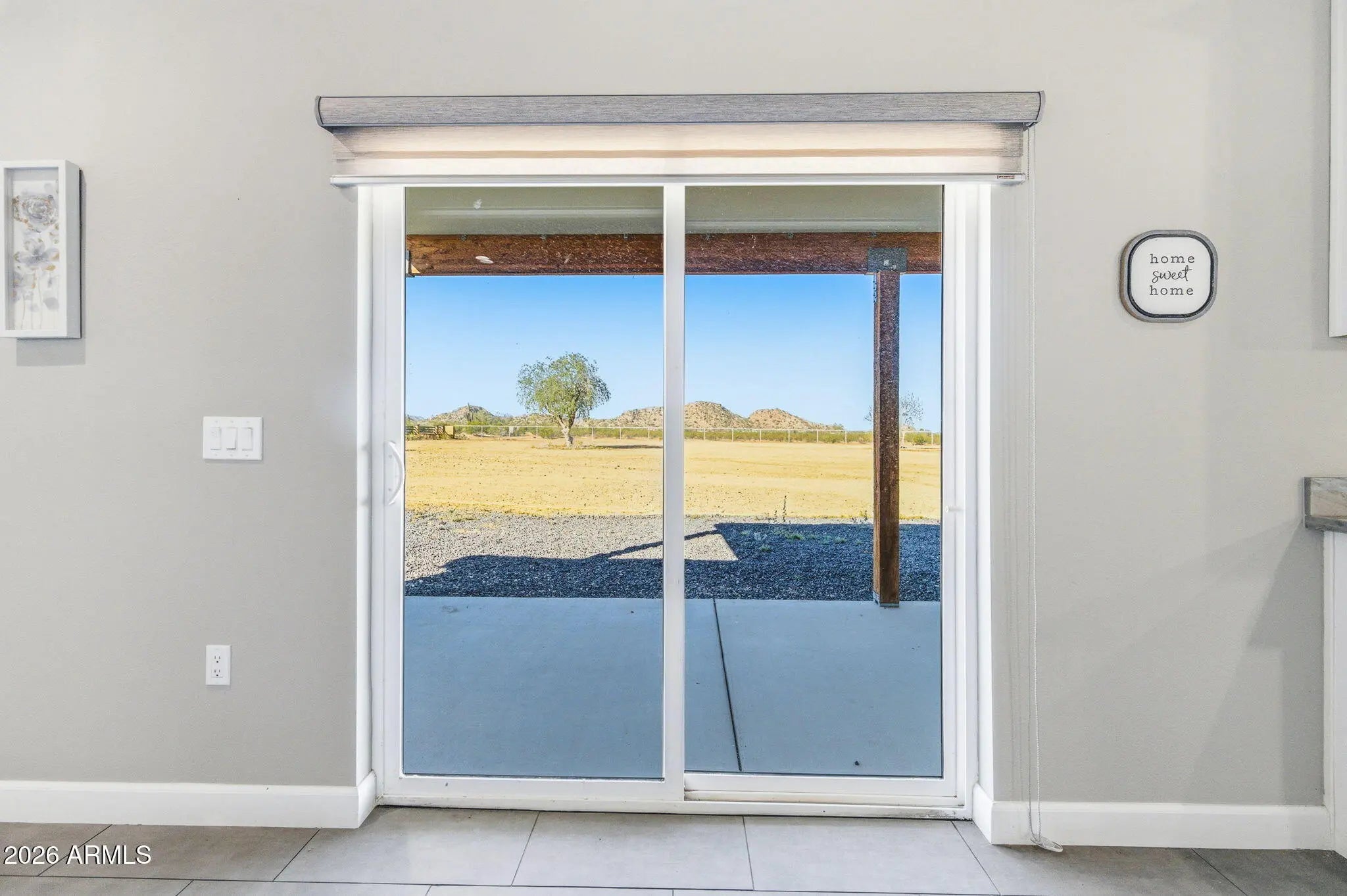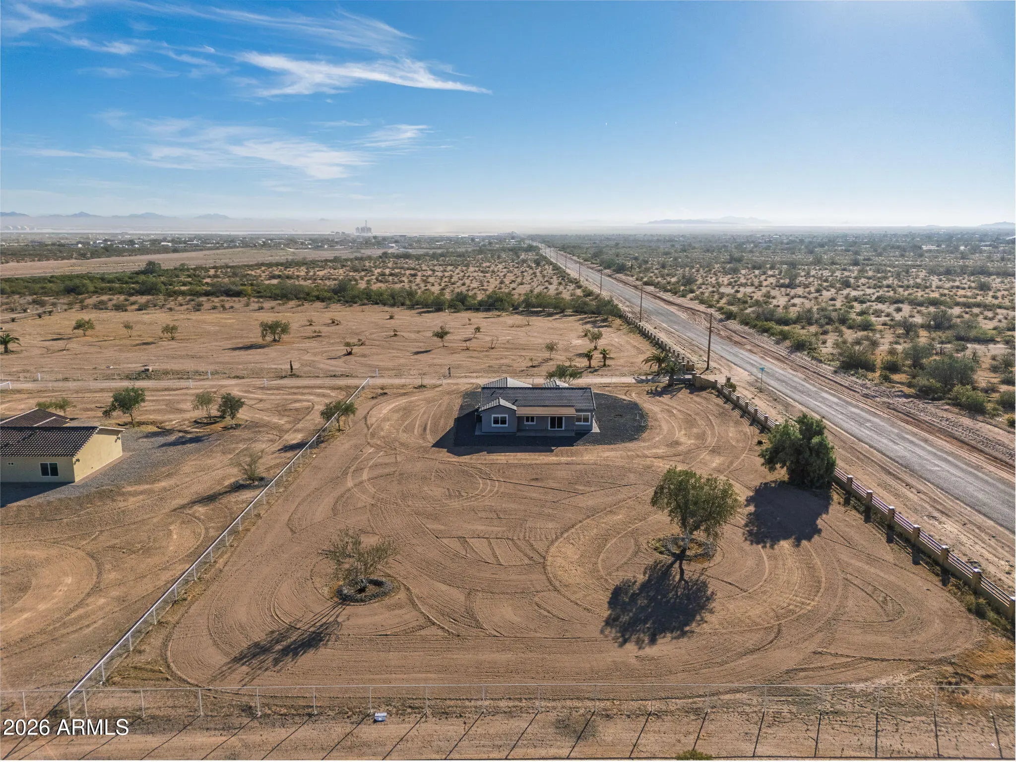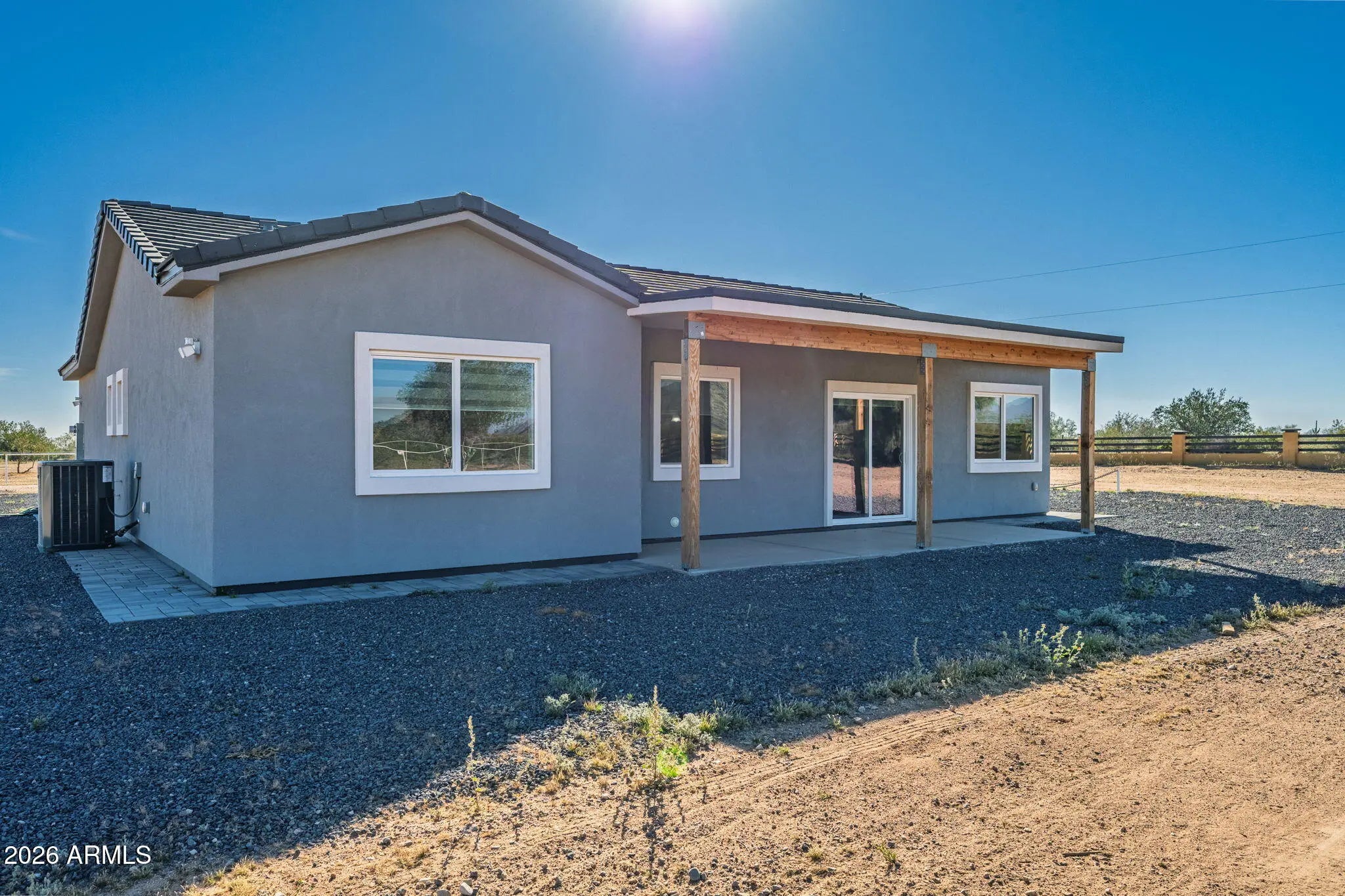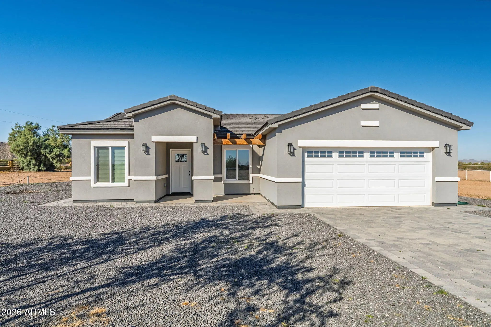 PREMIUM CORNER LOT! This 2024 built home radiates true pride of ownership & features 1515 sq ft with 3 spacious beds & 2 full baths! Upgrades include entertainer's kitchen w/ white cabinetry, granite countertops, SS appliances & island overlooking the great room, gorgeous staggered plank tile flooring throughout, modern fixtures, open concept floor plan, soaring ceilings, custom blinds, epoxy garage flooring & more! Palatial primary bedroom features walk-in closet & ensuite w/ large walk-in tile shower! Enjoy the Arizona sunsets on your 1.25 acre CORNER lot in Hidden Valley w/ front & back covered patios, desert landscaping, perimeter pipe fencing with extra frontage, surrounded by custom homes with plenty of room for horse and toys & RV gate! Level lot is close enough to enjoy the perks of city amenities but far enough to enjoy the peace & quiet! CONVENIENTLY LOCATED in a ONE OF A KIND custom home community with minimum 1 acre lots just a half block from Hwy 347 w/ easy access to Maricopa & Casa Grande! Enjoy this beautiful & secure desert oasis with no HOA, upgraded shared well, paved roads & AMAZING MOUNTAIN VIEWS!