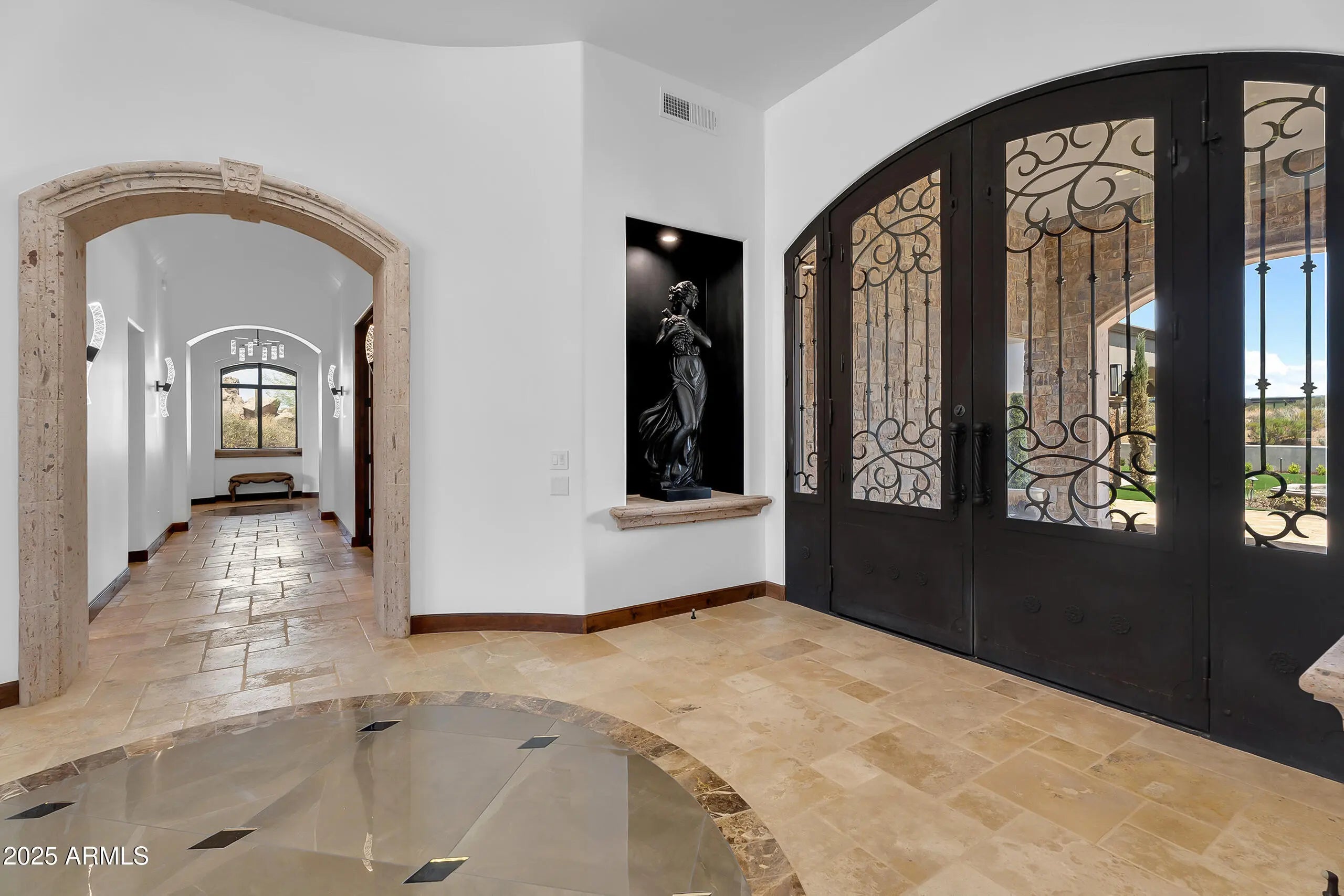 This single-level, Tuscan-inspired estate is thoughtfully positioned on nearly three secluded acres to capture sweeping desert and mountain views, framed by Troon Mountain in the near distance. From the moment you arrive, the home makes a lasting impression, welcoming you with a dramatic entry framed by exposed wood beams and a sense of warmth and refinement that continues throughout. Spanning 7,433 square feet, the home balances volume with comfort, offering spaces that feel expansive yet inviting. In the great room and primary suite, sliding glass doors tuck away to create an effortless indoor-outdoor atmosphere, perfect for entertaining or relaxed daily living. Three cantera stone fireplaces in the great room, primary suite, and backyard add elegance and warmth throughout.... At the heart of the home, the chef's kitchen features dual marble islands, generous workspaces, and seamless flow into refined living and dining areas. Integrated within the main living spaces are a temperature-controlled wine room and a private home theater, both designed as natural extensions of the residence. An office captures the warmth of the home with rich wood beams, offering a serene workspace or study. Separating the wings of the home, cantera stone arches create a sense of architectural drama and guide you from the main living areas. The primary bedroom and three additional full bedrooms each feature walk-in closets and private en-suite baths, providing comfort and privacy for family and guests. The home also features a 4.5-car garage, offering convenience and storage for a collection of vehicles or hobbies. A 784-square-foot guest house functions as a true secondary residence, ideal for extended family, parents, or adult children. It includes its own kitchen, living room, bedroom, and bath, offering independence while remaining connected to the main estate. The grounds continue the experience with an expansive outdoor patio and resort-style amenities including a negative-edge pool and spa, putting green, and shaded cabana, all positioned to take full advantage of unobstructed views. Located in North Scottsdale, the estate is approximately three miles from Troon North Golf Club and six miles from AJ's Fine Foods, with convenient access to Pinnacle Peak, the Four Seasons Resort, DC Ranch, and world-class golf including Estancia, Scottsdale National, and Grayhawk. This estate represents a thoughtful convergence of architecture, setting, and livability, offering single-level living, protected views, and a private environment within a gated North Scottsdale community designed for those who appreciate space, privacy, and enduring desert beauty. Discover the estate in person to fully experience its architecture, breathtaking views, and refined lifestyle.