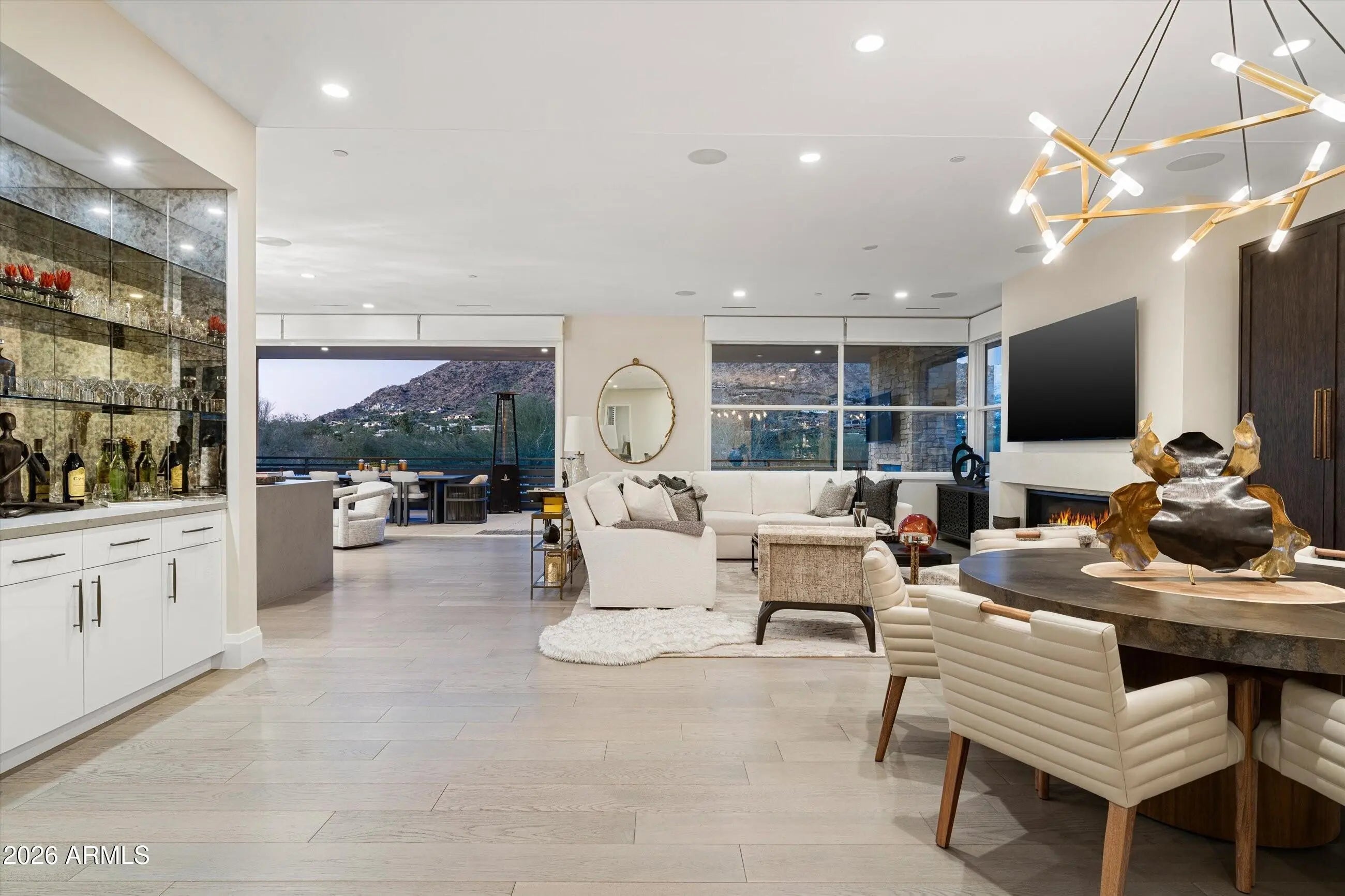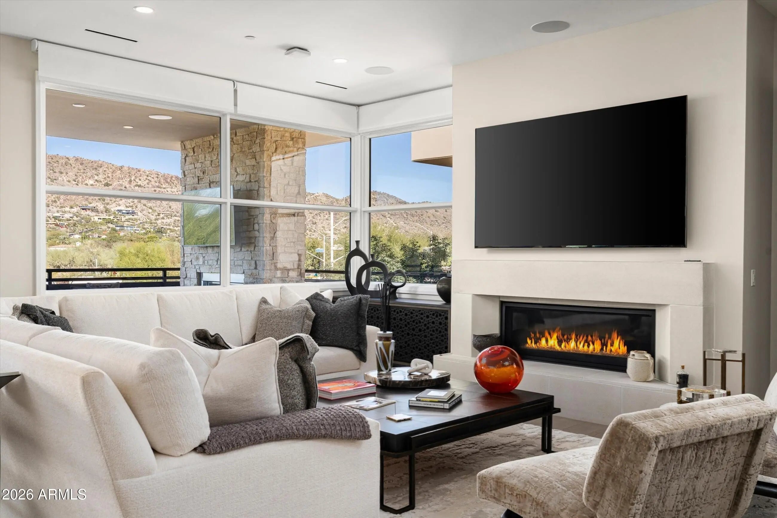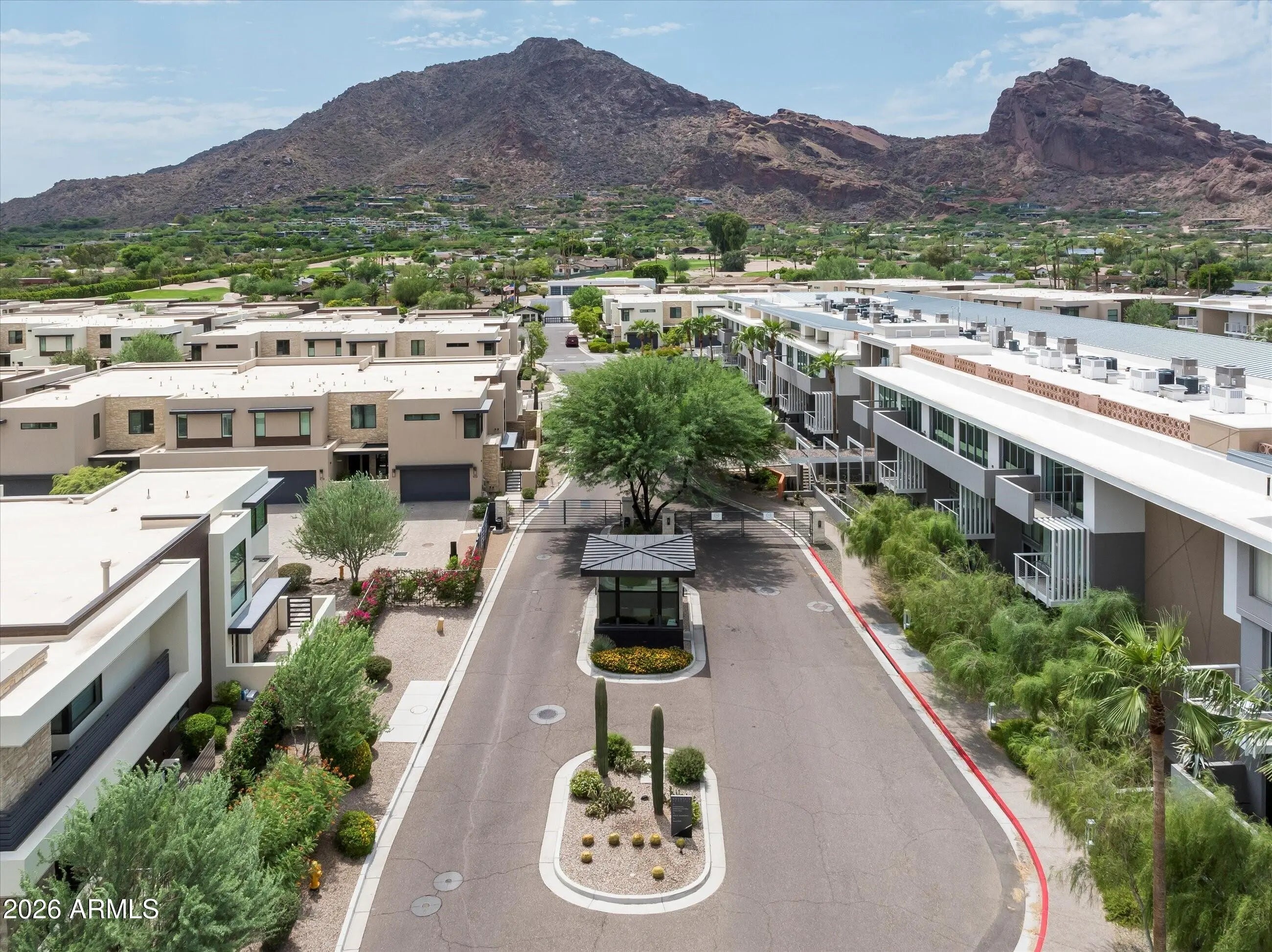 Welcome to this luxury villa located within the exclusive Mountain Shadows Resort community in Paradise Valley. Inside, soaring 10-foot ceilings and rich wood flooring create a refined yet warm atmosphere throughout. The great room is designed for seamless indoor/outdoor living, featuring expansive 9-foot bi-fold doors that open to the outdoors and fill the space with natural light. Both indoor and outdoor gas fireplaces add comfort and ambiance, perfect for entertaining or relaxing year-round. The kitchen is a true showpiece, outfitted with premium designer finishes and top-tier appliances, including a Wolf dual-fuel range, convection microwave, steam oven, a 48-inch Sub-Zero refrigerator, Sub-Zero wine tower, Asko dishwasher, and Zephyr hood. Quartz countertops with a waterfall edge complete the sleek, modern aesthetic. This villa also features Savant home automation, an in-home elevator, motorized shades, and custom wood shutters for ease and convenience. The attached two-car garage includes an epoxy floor, and the home is Energy Star rated for efficiency. Residents enjoy the peace of mind of a 24-hour guard-gated community, along with access to Mountain Shadows Resort and its full suite of amenities, including concierge services, a 4,500-square-foot fitness center with group classes included, a heated resort-style pool, golf, the Sanctuary Spa, tennis, and more.