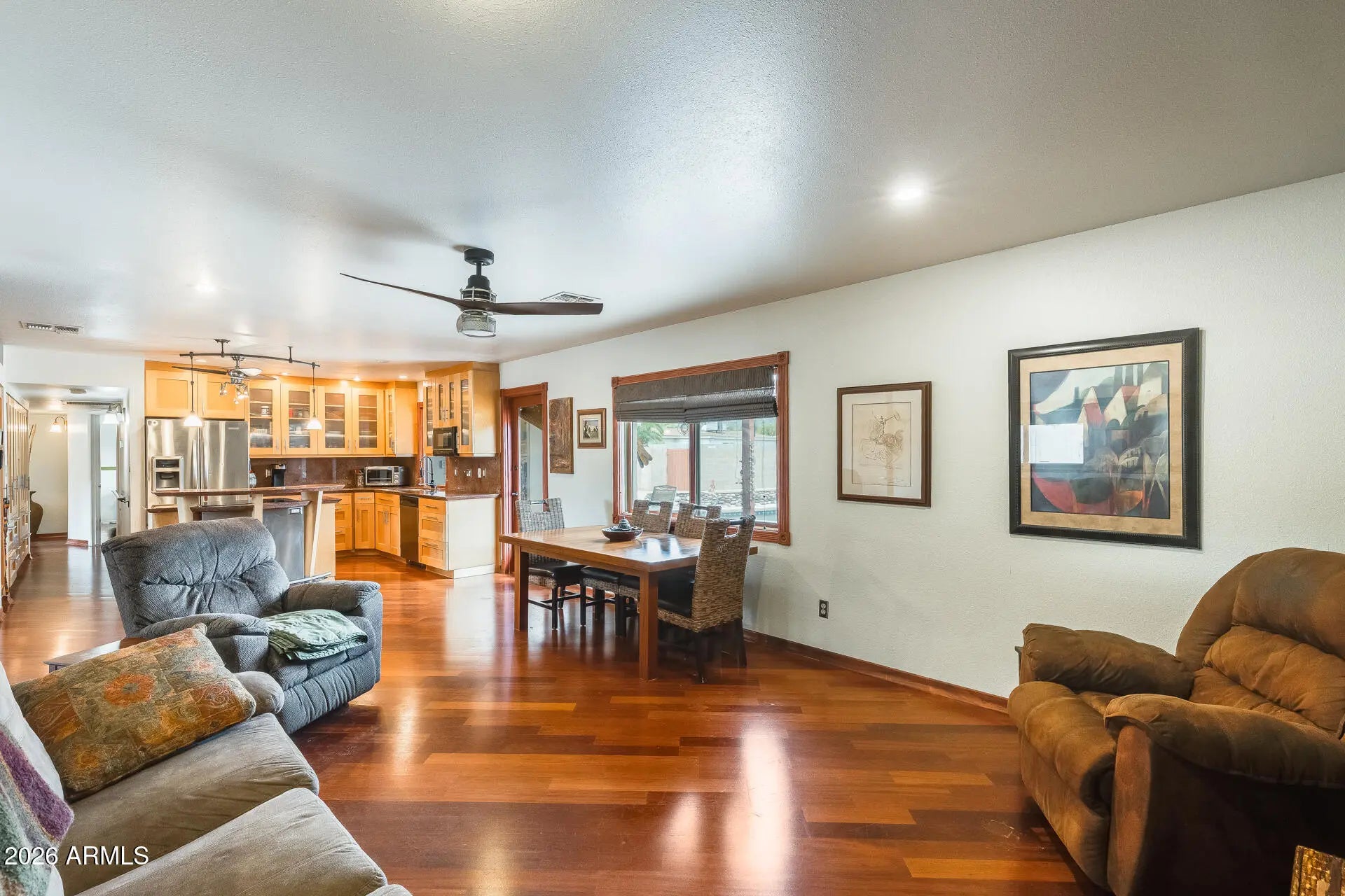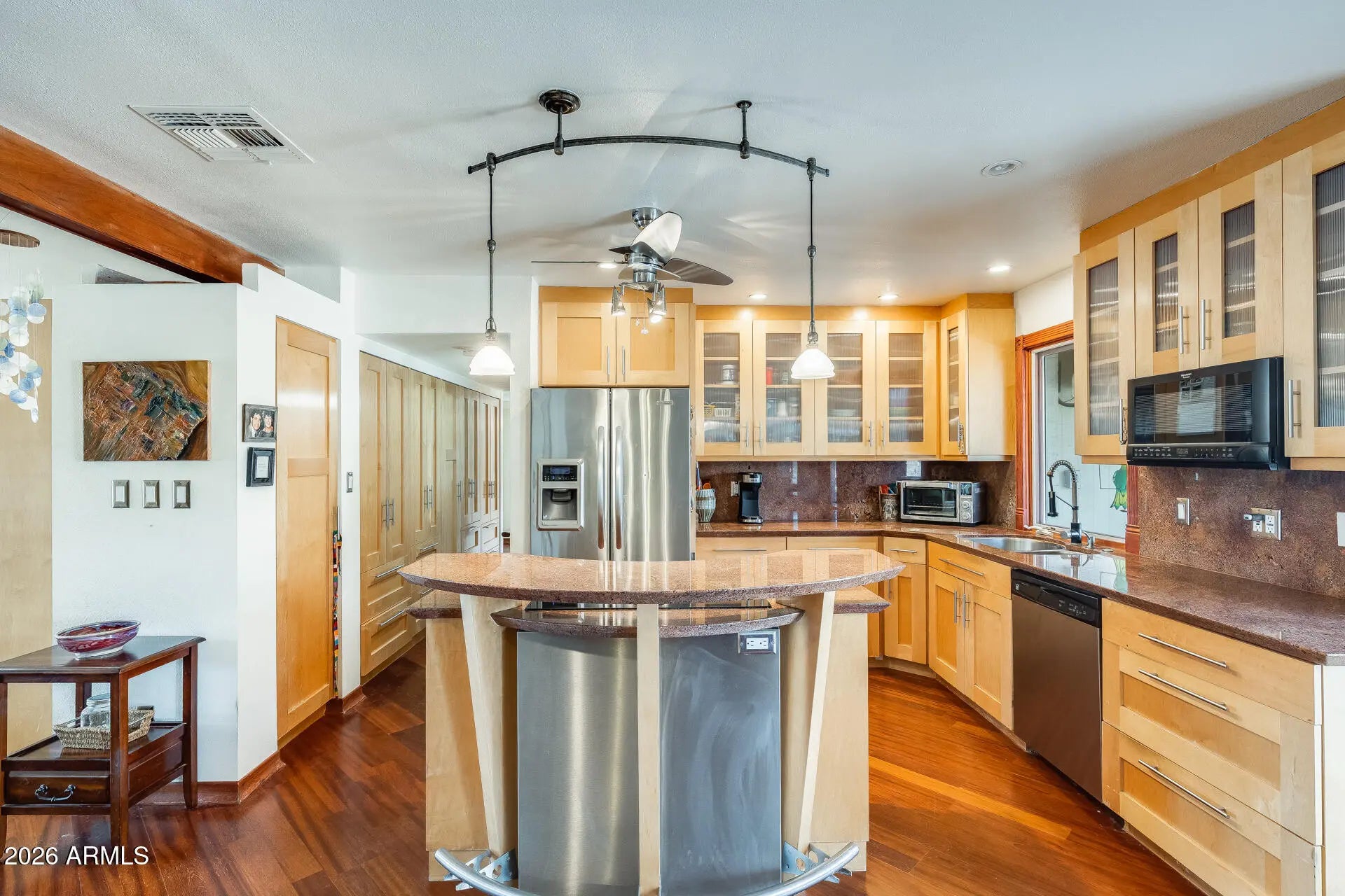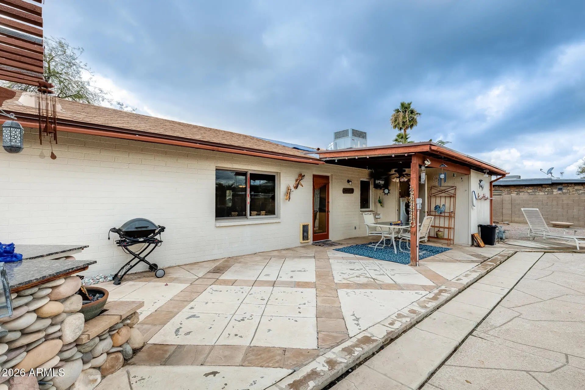 Architect-designed home with stunning mountain views! This thoughtfully customized residence features a beautifully remodeled kitchen with granite countertops, full tile backsplash, custom maple cabinetry, and sleek stainless steel accents. Additional custom maple storage cabinetry enhances the hallway, providing both style and functionality. Hardwood flooring flows throughout the main living areas, complemented by ceiling fans for year-round comfort. The spacious two-car garage offers exceptional organization with an entire wall of built-in shelving and storage cabinets. Designed for outdoor entertaining, the backyard showcases a built-in entertainment center with BBQ connection, granite-topped fire pit, and elegant stone accents—perfect for enjoying Arizona evenings and the magnificent mountain views. Conveniently located just minutes from the SR-51 and Loop 101, this home also offers peace of mind with a newer roof (approximately 5 years old) and a recently replaced hot water heater.