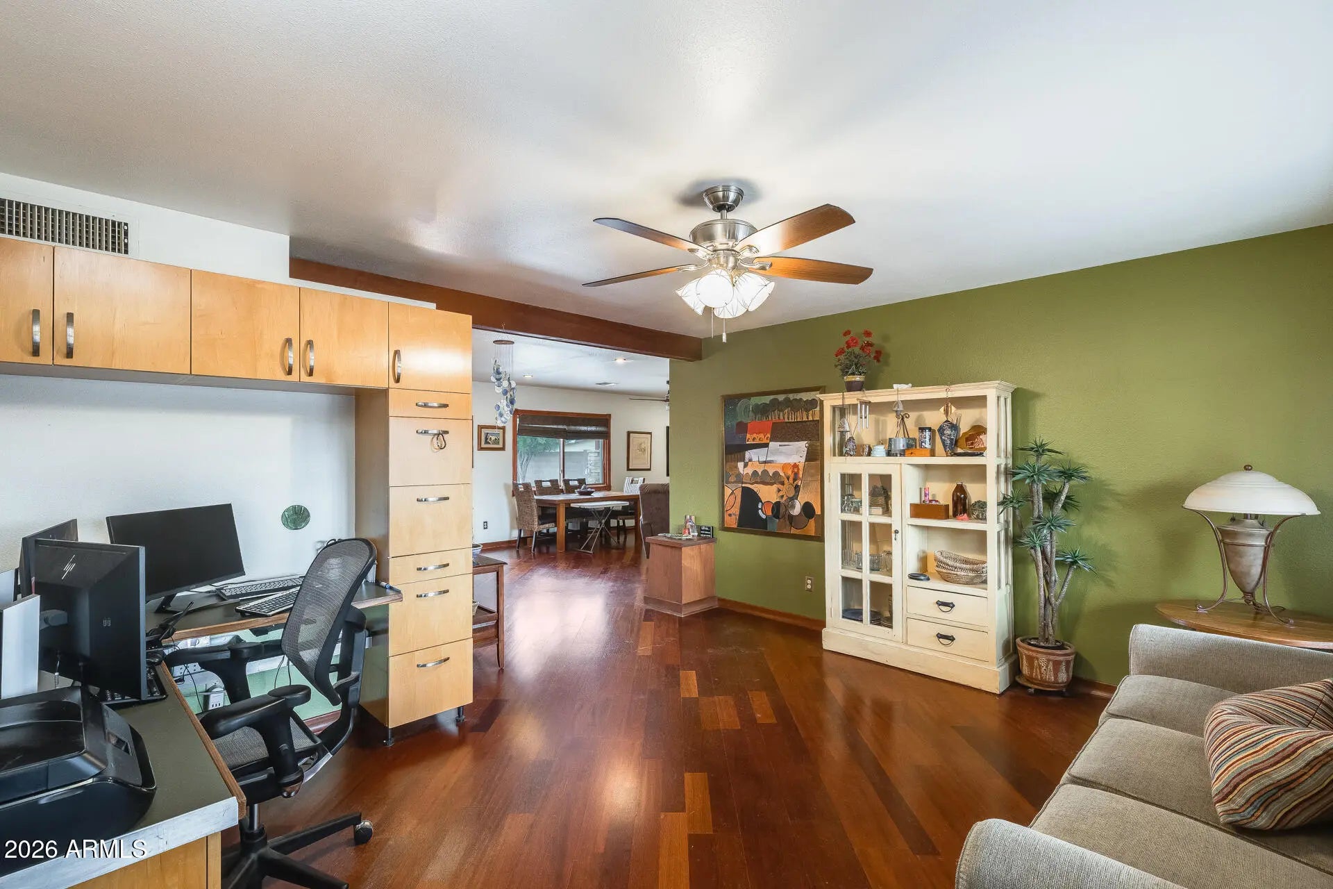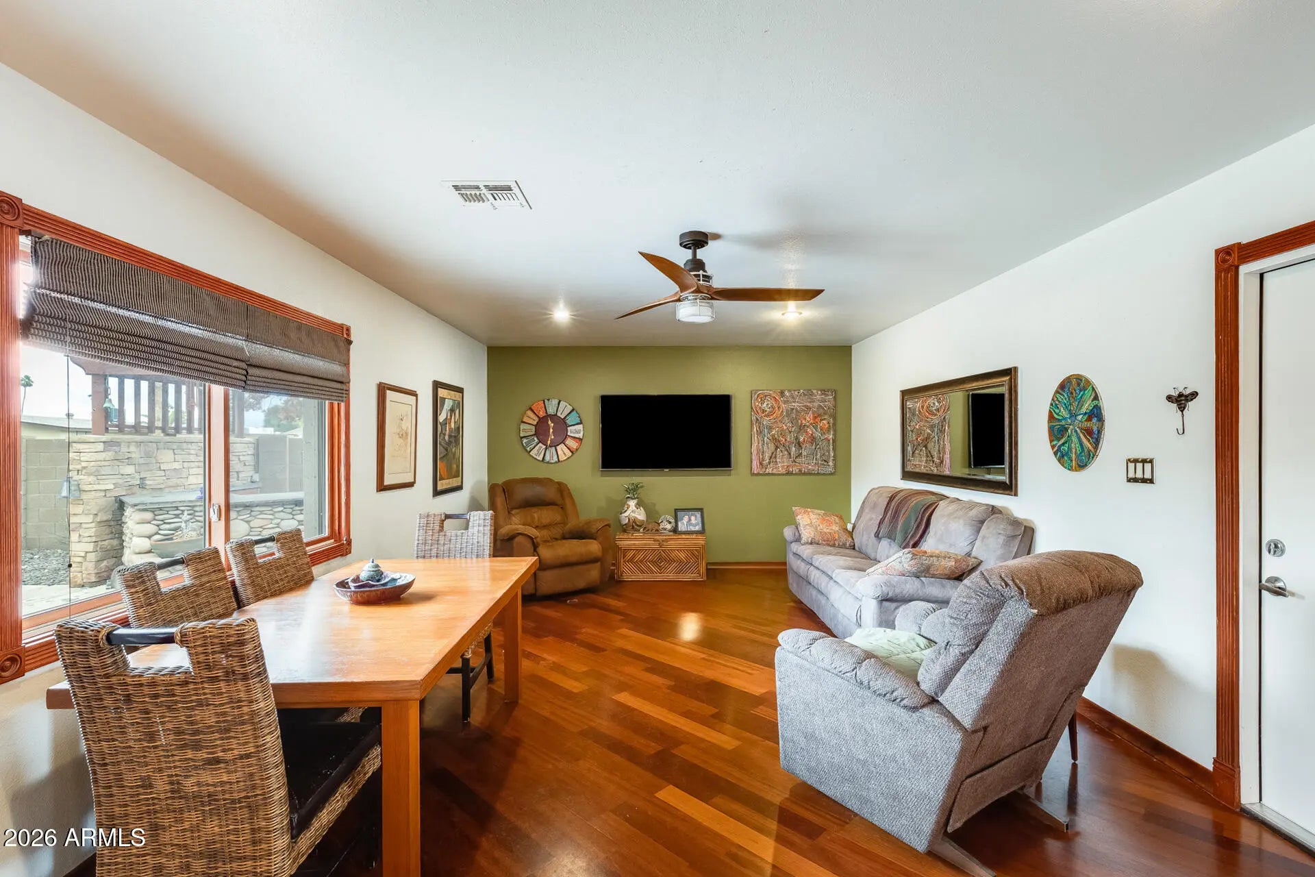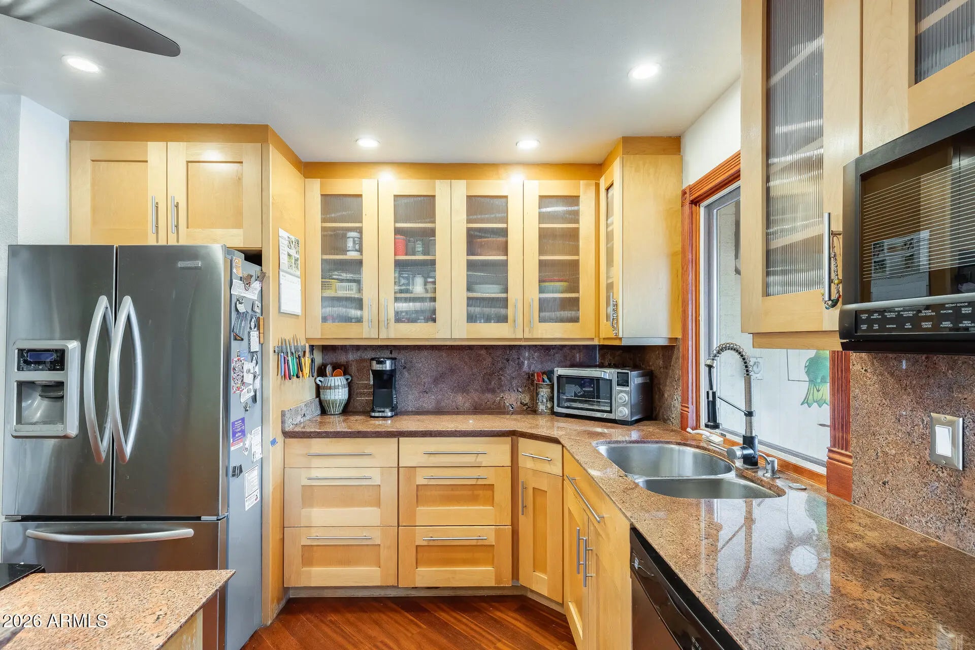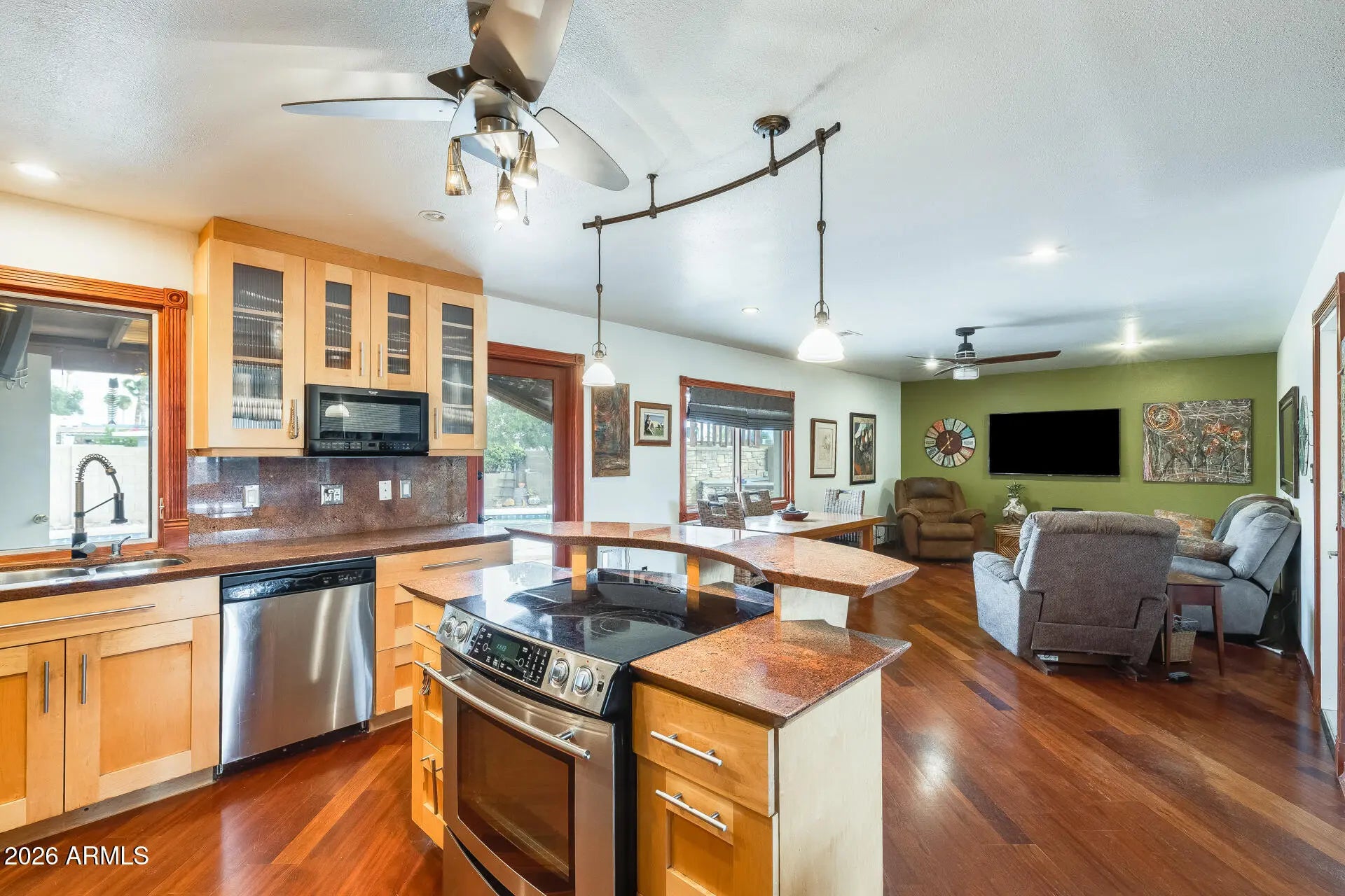 Architect-designed home with stunning mountain views! This thoughtfully customized residence features a beautifully remodeled kitchen with granite countertops, full tile backsplash, custom maple cabinetry, and sleek stainless steel accents. Additional custom maple storage cabinetry enhances the hallway, providing both style and functionality. Hardwood flooring flows throughout the main living areas, complemented by ceiling fans for year-round comfort. The spacious two-car garage offers exceptional organization with an entire wall of built-in shelving and storage cabinets. Designed for outdoor entertaining, the backyard showcases a built-in entertainment center with BBQ connection, granite-topped fire pit, and elegant stone accents—perfect for enjoying Arizona evenings and the magnificent mountain views. Conveniently located just minutes from the SR-51 and Loop 101, this home also offers peace of mind with a newer roof (approximately 5 years old) and a recently replaced hot water heater.