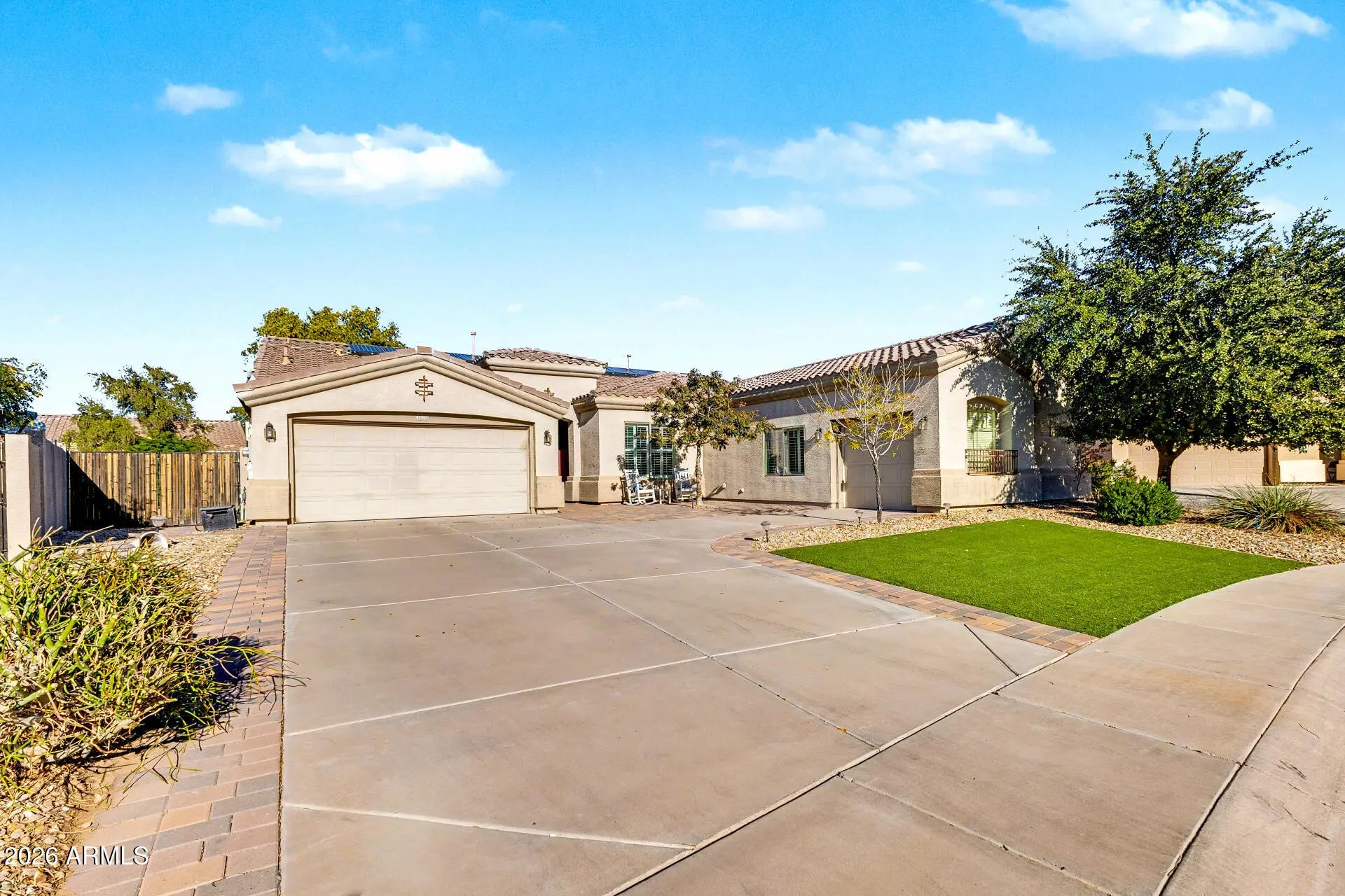 Immaculate 3000sf 1-story home that shows like a model, on a 1/3 acre cul-de-sac lot with POOL! This 2008-built Taylor Morrison gem is being sold by the original owners, who have taken great care of their home. Interior upgrades include vinyl plank flooring, granite counters, gourmet kitchen with double wall ovens, and beautiful cabinetry. Water softener and R/O system convey. The floorplan features 10-foot ceilings throughout, a split master bedroom, office, and a large bonus room that could easily be a 4th bedroom. 3 car garage for lots of storage options, plus an RV gate. The backyard is an entertainer's dream, with a large covered patio, sparkling blue pool surrounded by pavers, and artificial grass. And the solar panels help keep the electric bills at an average of $39/month! The 4th bedroom has direct access to a single-bay garage, ideal for guests. Beyond the interiors, the spacious backyard holds its own charm! Experience resort-style living with a covered patio, well-laid pavers, artificial turf, a fire pit, and a sparkling pool for year-round enjoyment. What's not to like? See it! Love it! Live it!