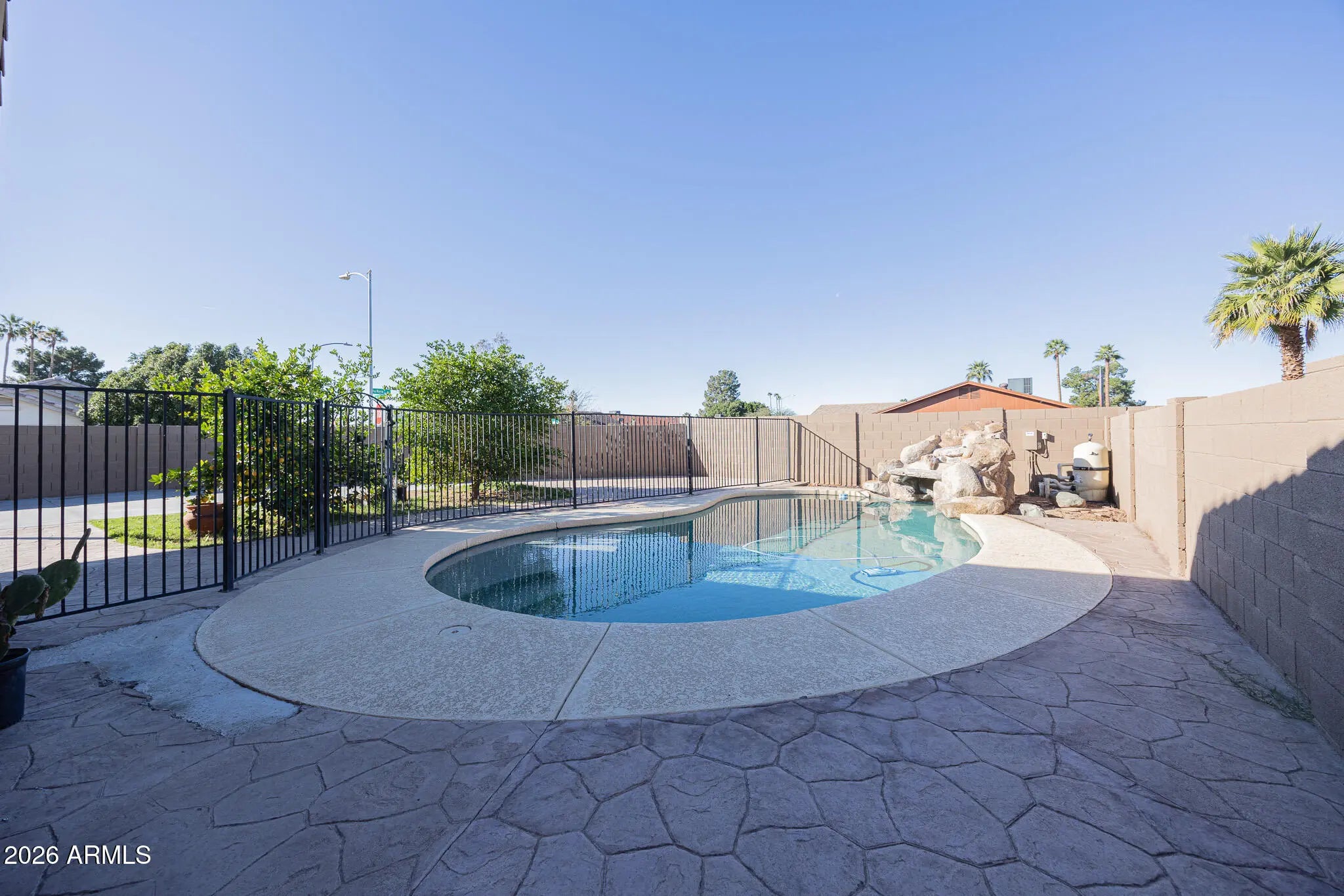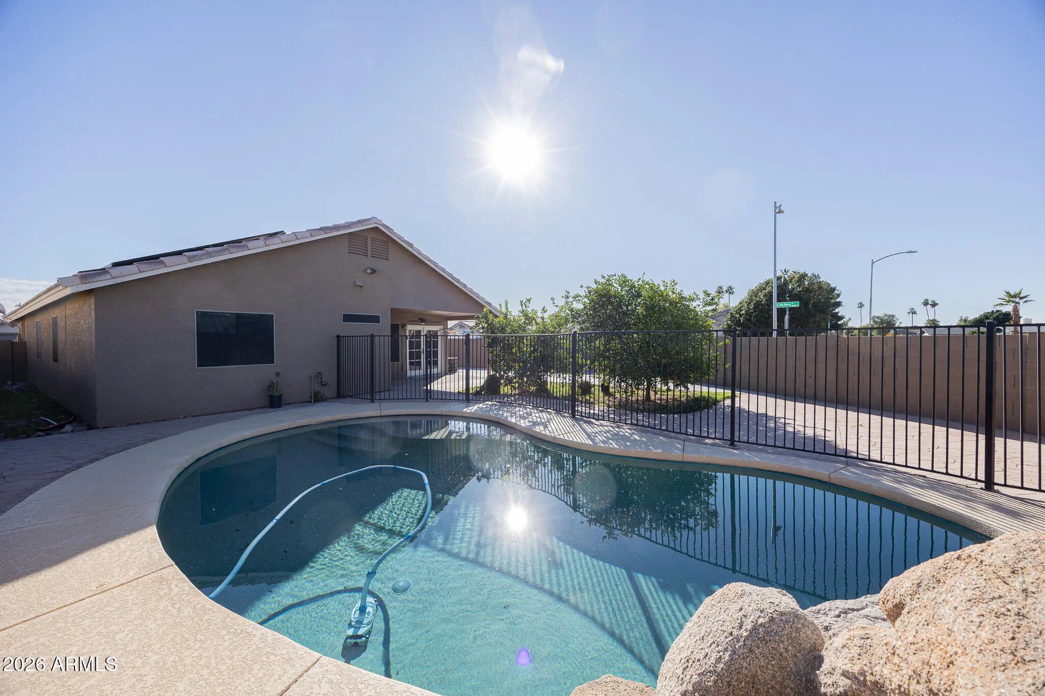 Charming 3/2 Goodyear Home! Discover this inviting 3-bedroom, 2-bath residence on a desirable corner lot . Featuring tile flooring, granite countertops, vaulted ceilings, and abundant natural light, the open layout creates a warm and welcoming atmosphere. The master bedroom has an enclosed bath and a walk in closet with additional cozy rooms. The spacious living area flows into a modern kitchen, perfect for entertaining. Step outside to a private backyard oasis with sparkling pool, RV gate, and ample space for outdoor fun. A 2-car garage and extra parking add convenience. Located near parks, schools, shopping, and easy freeway access, this home offers comfort, style, and prime Goodyear living.