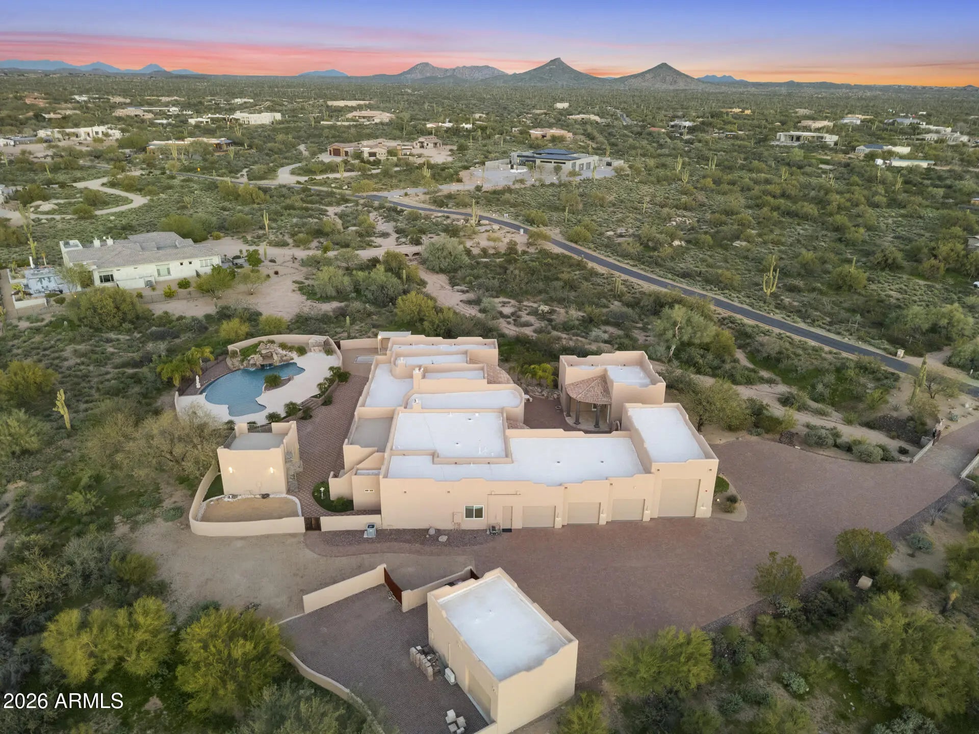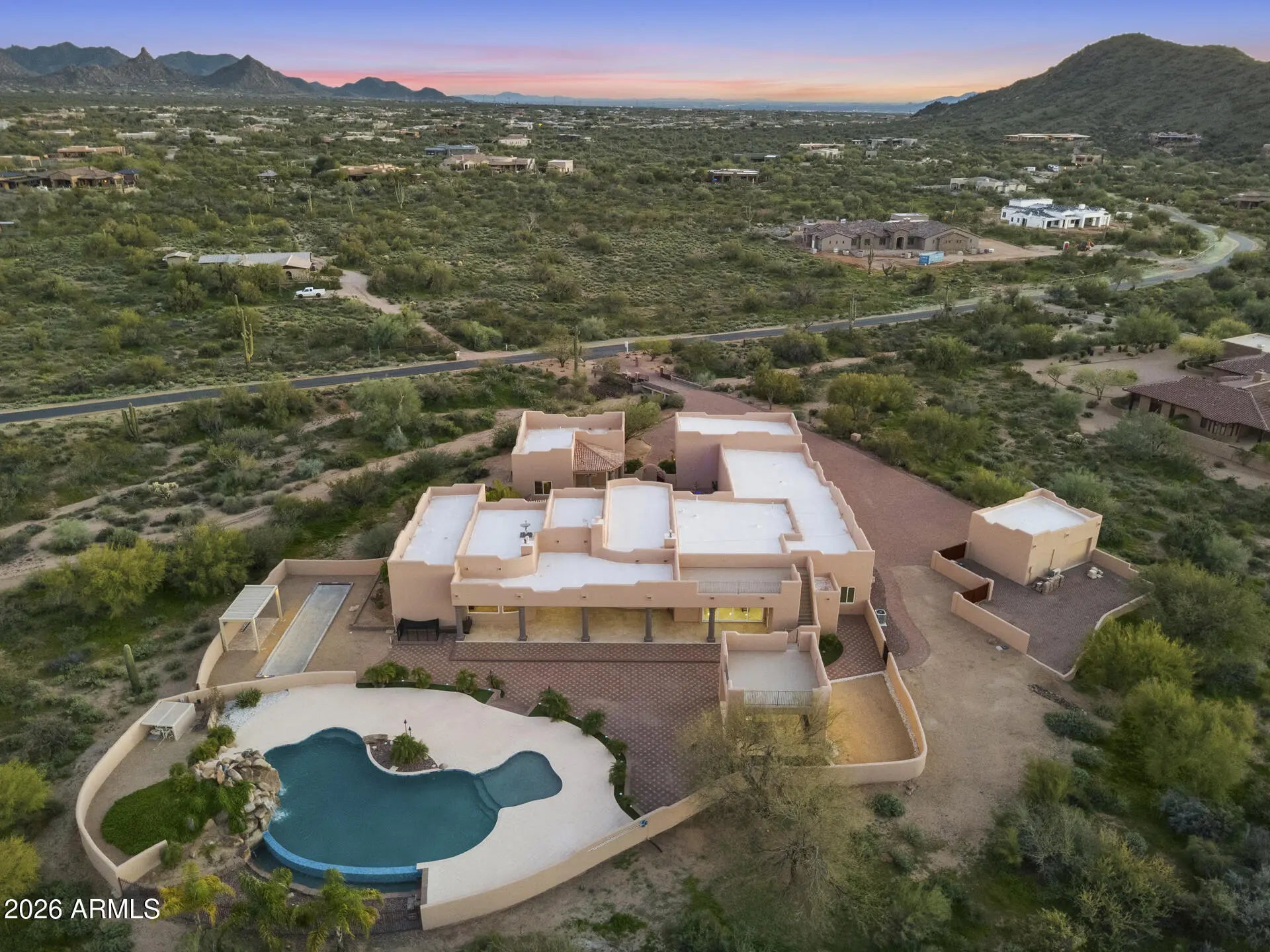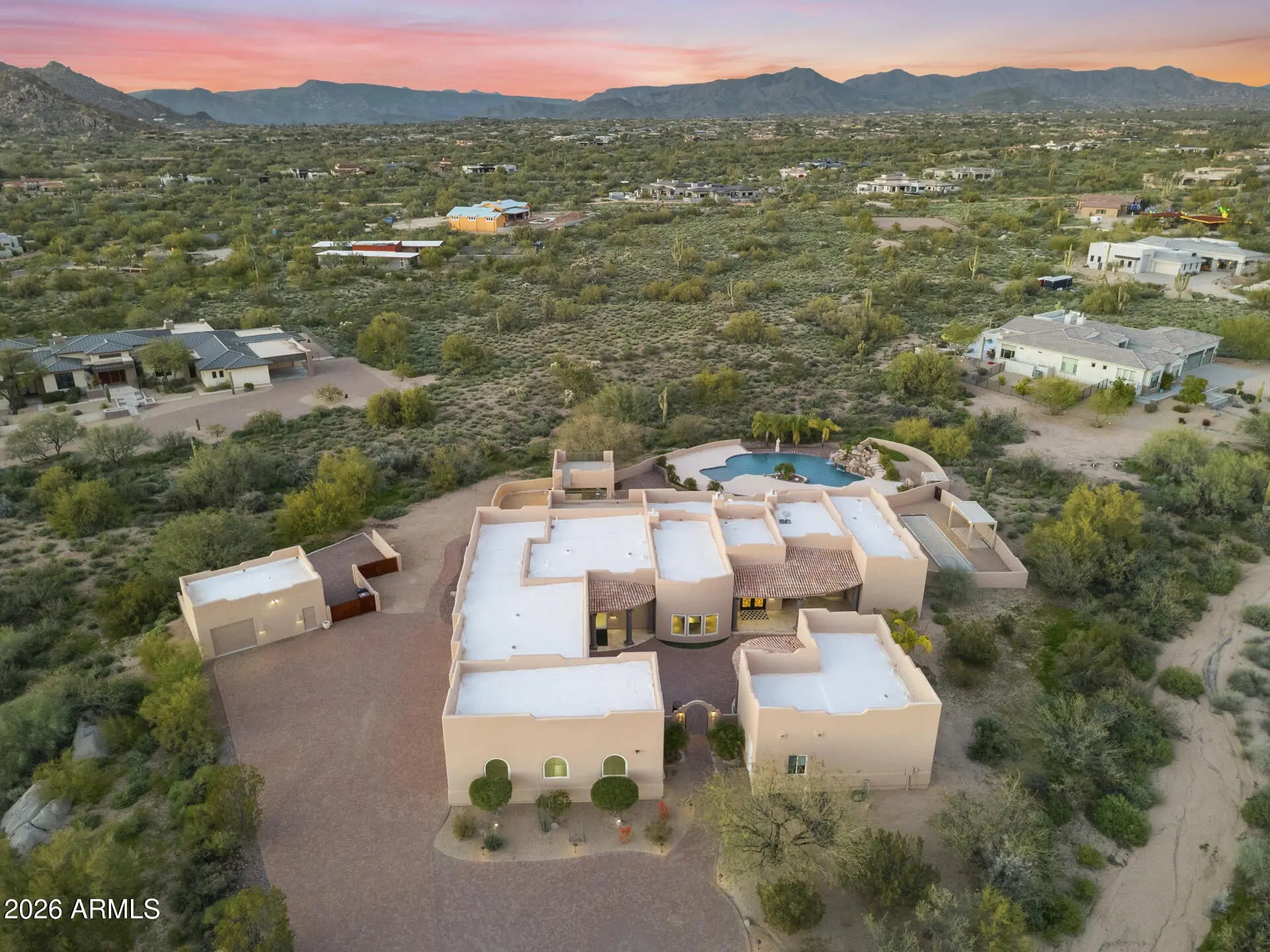 Experience Elevated Desert Living in this Custom Southwestern Estate set on nearly 3 Private acres in a Premier North Scottsdale setting, with stunning Mountain & Sunset Views. The 4,859 sq ft main residence is complemented by a 983 sq ft detached Casita, ideal for guests or extended stays. A Gated Entry leads to an expansive Paver Drive & exceptional Garage amenities including an attached extended-length 3-car Garage + RV Garage + 1 Detached Garage, accommodating up to 8 vehicles. Inside, polished Travertine floors, newer Custom Windows, Illuminated Recessed Ceilings, and a 2-way Fireplace create a Refined Ambiance. Resort-style grounds feature a dramatic Elevated Pool with Waterfall, Grotto, Hidden Slide, Outdoor Kitchen with View Deck, Fireplace, Patios & Bocce Court - perfect for Luxury Entertaining! - Designed for Elevated Living and Grand-Scale Entertaining, this Estate blends timeless Southwestern architecture with Modern Luxury. The Open-Concept layout seamlessly connects Formal and Casual spaces, Enhanced by Abundant Natural Light, Illuminated Recessed Ceilings, and Refined Finishes throughout. The Fully Reimagined Chef's Kitchen is a Showpiece, offering a Large Center Island, Granite Countertops with Full-Height Backsplash, custom Flat-Panel Cabinetry with Integrated Display Niches, Over & Under-Cabinet Lighting, and Premium Sub-Zero and Wolf Appliances including Professional Built-in Refrigerator/Freezer & Wine Storage, Wall Ovens, Convection Cooktop, Prep Sink, and Peninsula Seating. The two bar areas and formal handcrafted built-in dining hutch feature stunning, distinctive quartzite countertops. The Primary Suite is a Private Retreat Featuring a Fireplace, Motorized Blinds, Custom Built-in Wardrobe and Entertainment Unit, and a Spa-Inspired Bath with Soaking Tub, Spacious Walk-in Shower, Dual Vanities, and Expansive Custom His-and-Hers Closet Systems with Island Storage. Secondary Baths reflect the same Elevated Craftsmanship and Design including Marble Counters. Outdoor Living Rivals a Private Resort with an Elevated Pool, Oversized Waterfall, Grotto, and Concealed Slide! A Freestanding Gazebo offers an Upper-Level View Deck and a Fully Equipped Outdoor Kitchen below with Multiple Grills, Range/Oven, Fridge, Bar Seating, Ceiling Fans, and TV. Additional Covered Patios with Travertine Flooring and Fireplace extend the Living Space Outdoors, while a Bocce Ball Court completes this exceptional North Scottsdale offering!
