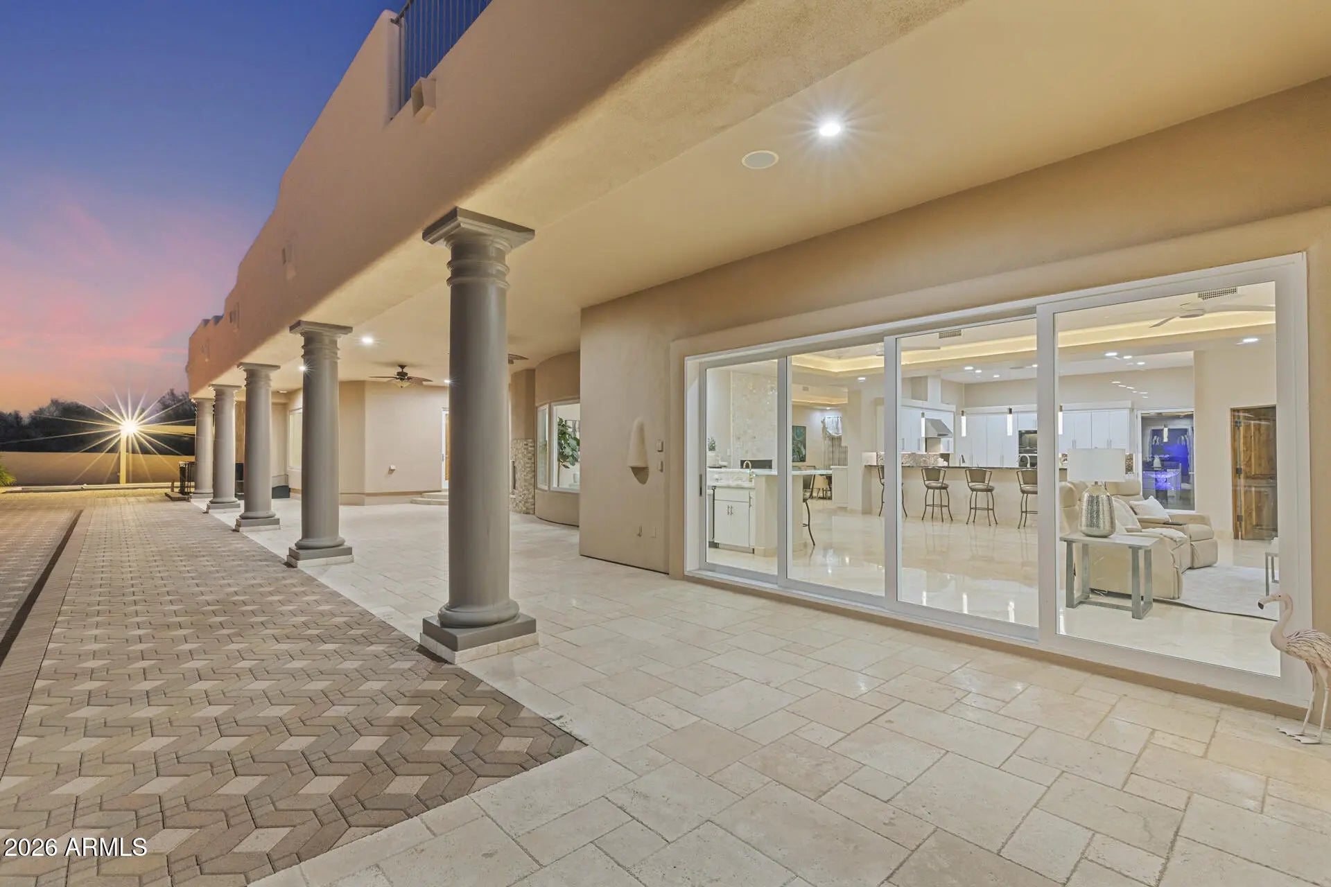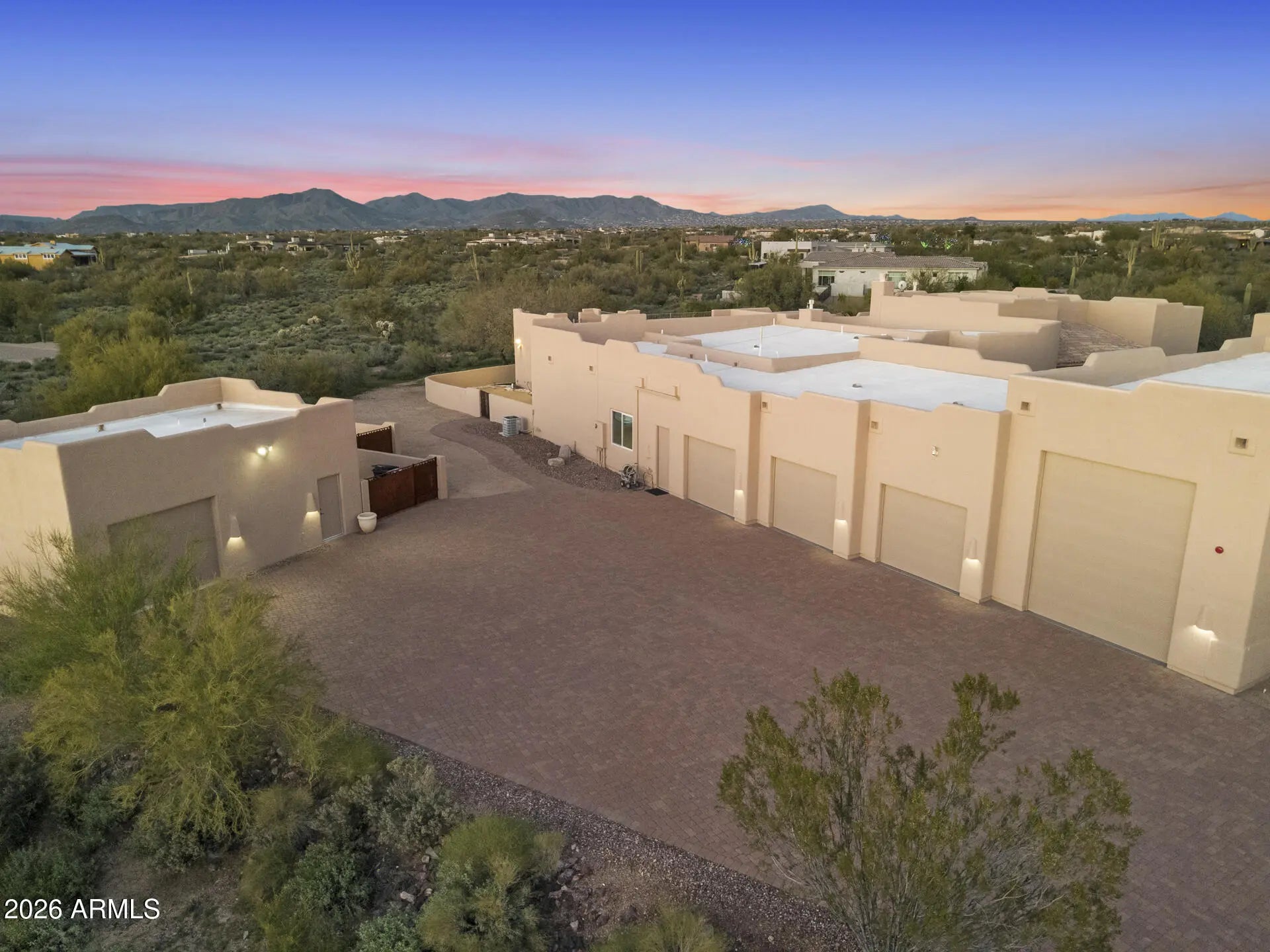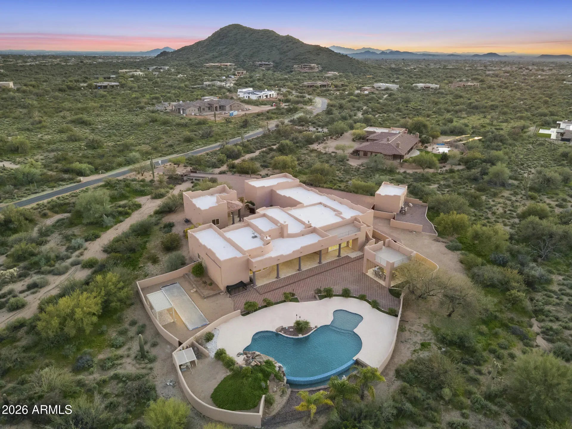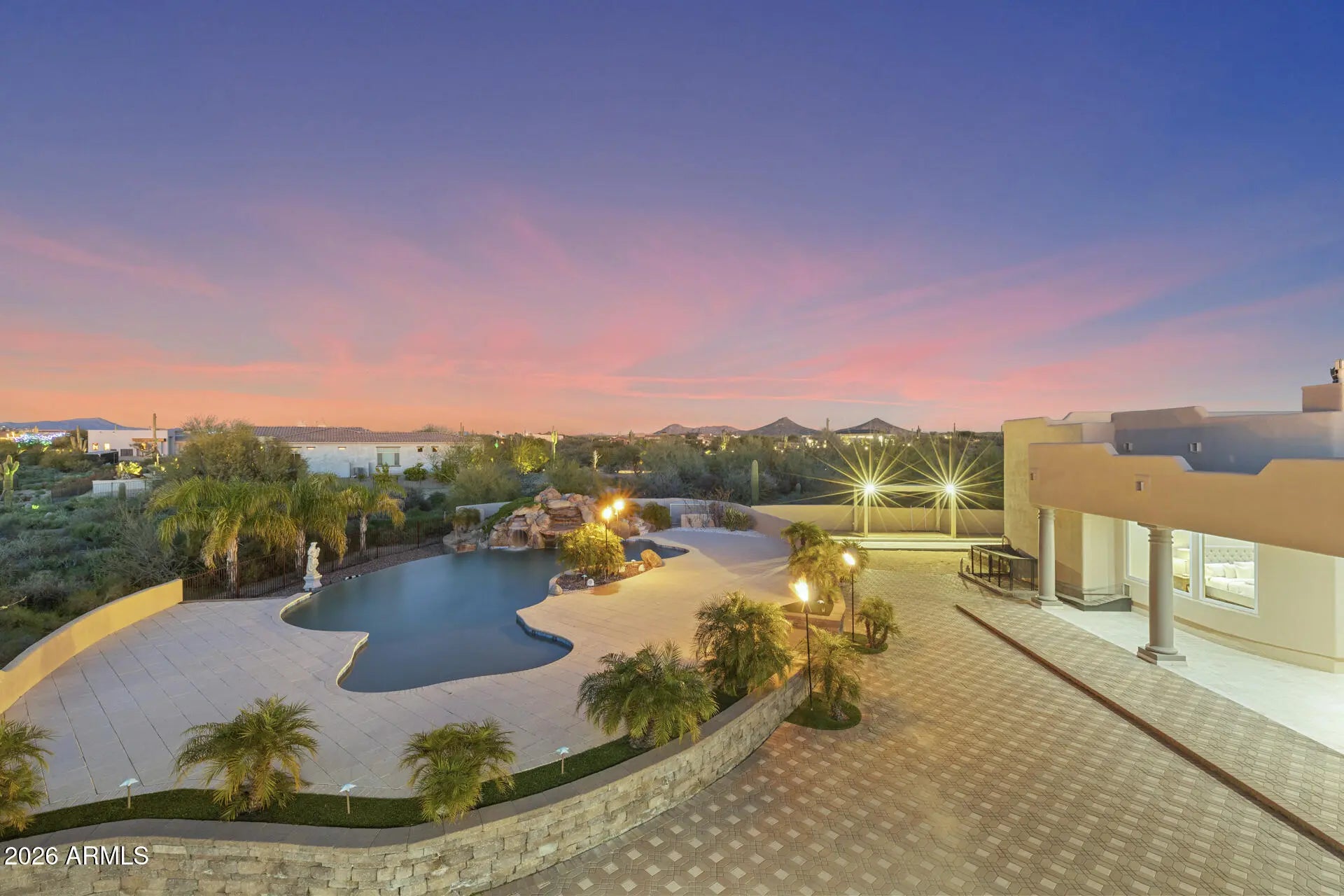 Experience Elevated Desert Living in this Custom Southwestern Estate set on nearly 3 Private acres in a Premier North Scottsdale setting, with stunning Mountain & Sunset Views. The 4,859 sq ft main residence is complemented by a 983 sq ft detached Casita, ideal for guests or extended stays. A Gated Entry leads to an expansive Paver Drive & exceptional Garage amenities including an attached extended-length 3-car Garage + RV Garage + 1 Detached Garage, accommodating up to 8 vehicles. Inside, polished Travertine floors, newer Custom Windows, Illuminated Recessed Ceilings, and a 2-way Fireplace create a Refined Ambiance. Resort-style grounds feature a dramatic Elevated Pool with Waterfall, Grotto, Hidden Slide, Outdoor Kitchen with View Deck, Fireplace, Patios & Bocce Court - perfect for Luxury Entertaining! - Designed for Elevated Living and Grand-Scale Entertaining, this Estate blends timeless Southwestern architecture with Modern Luxury. The Open-Concept layout seamlessly connects Formal and Casual spaces, Enhanced by Abundant Natural Light, Illuminated Recessed Ceilings, and Refined Finishes throughout. The Fully Reimagined Chef's Kitchen is a Showpiece, offering a Large Center Island, Granite Countertops with Full-Height Backsplash, custom Flat-Panel Cabinetry with Integrated Display Niches, Over & Under-Cabinet Lighting, and Premium Sub-Zero and Wolf Appliances including Professional Built-in Refrigerator/Freezer & Wine Storage, Wall Ovens, Convection Cooktop, Prep Sink, and Peninsula Seating. The two bar areas and formal handcrafted built-in dining hutch feature stunning, distinctive quartzite countertops. The Primary Suite is a Private Retreat Featuring a Fireplace, Motorized Blinds, Custom Built-in Wardrobe and Entertainment Unit, and a Spa-Inspired Bath with Soaking Tub, Spacious Walk-in Shower, Dual Vanities, and Expansive Custom His-and-Hers Closet Systems with Island Storage. Secondary Baths reflect the same Elevated Craftsmanship and Design including Marble Counters. Outdoor Living Rivals a Private Resort with an Elevated Pool, Oversized Waterfall, Grotto, and Concealed Slide! A Freestanding Gazebo offers an Upper-Level View Deck and a Fully Equipped Outdoor Kitchen below with Multiple Grills, Range/Oven, Fridge, Bar Seating, Ceiling Fans, and TV. Additional Covered Patios with Travertine Flooring and Fireplace extend the Living Space Outdoors, while a Bocce Ball Court completes this exceptional North Scottsdale offering!