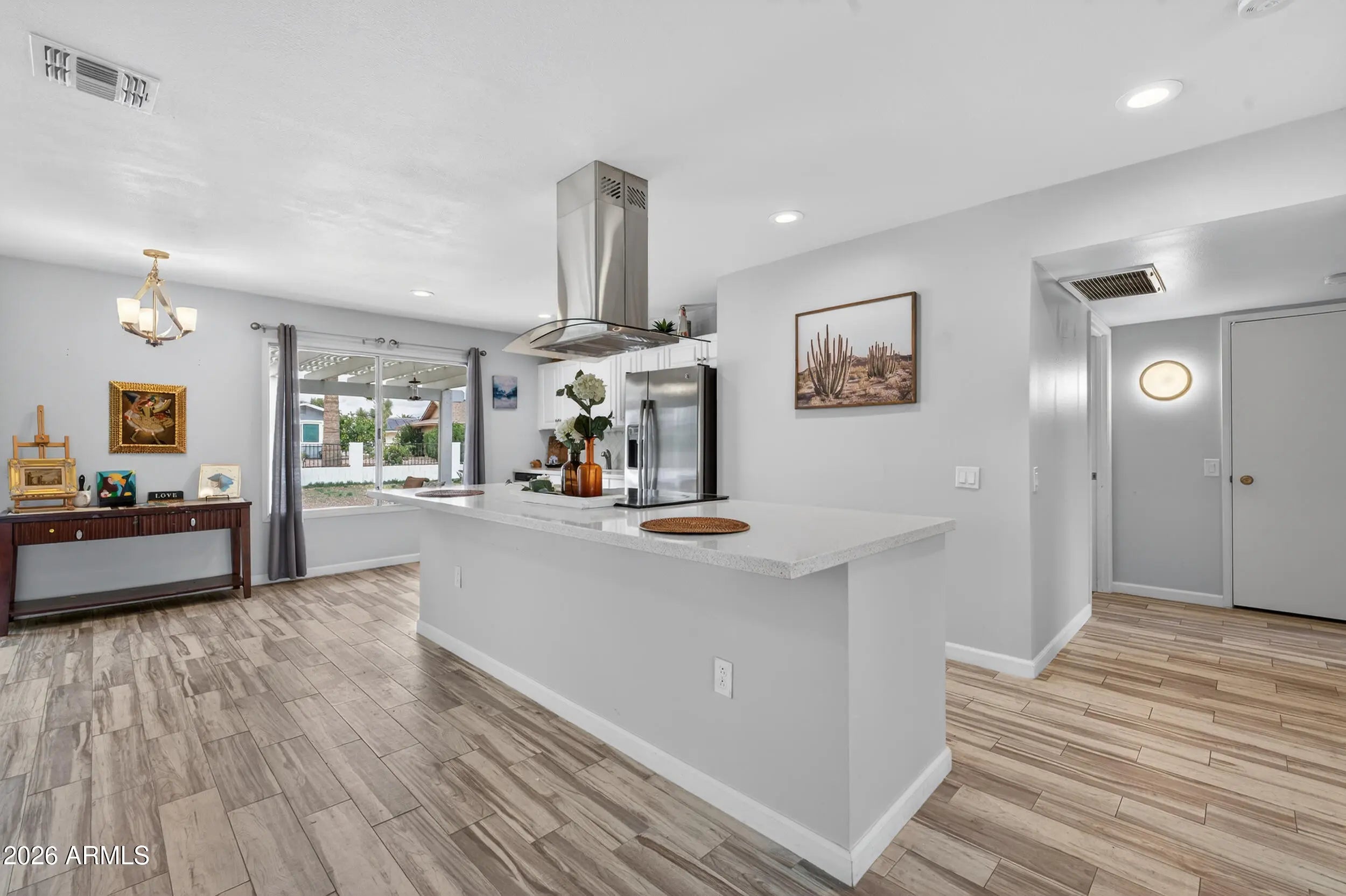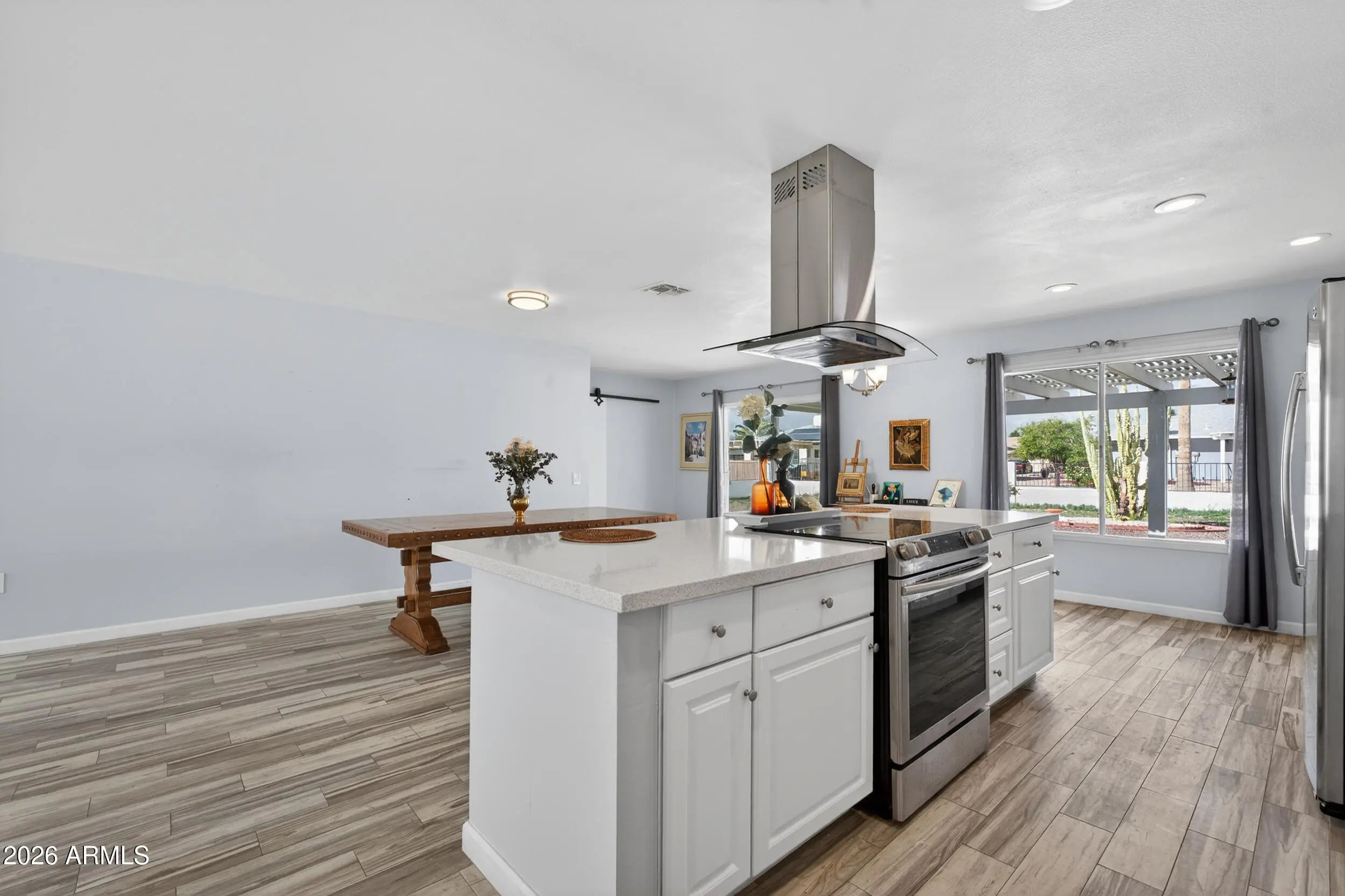 Experience the charm of this beautiful 2 bed, 2 bath home in Sun City West! This home offers an open layout with plank style flooring, neutral paint, and a clean, modern feel. The kitchen features white cabinetry, stainless steel appliances, and a large island that keeps everyone connected to the dining and living spaces. All windows include roller shades! Relax in the spacious primary bedroom and enjoy the updated bathrooms, including a tiled walk in shower. Inside laundry with extra cabinetry adds everyday convenience, plus an attached 2 car garage. Out back, a travertine patio with pergola style shade overlooks an expansive low maintenance yard ready for outdoor seating, garden beds, or your own personal touches. Enjoy nearby recreation centers with pools, golf & community events!