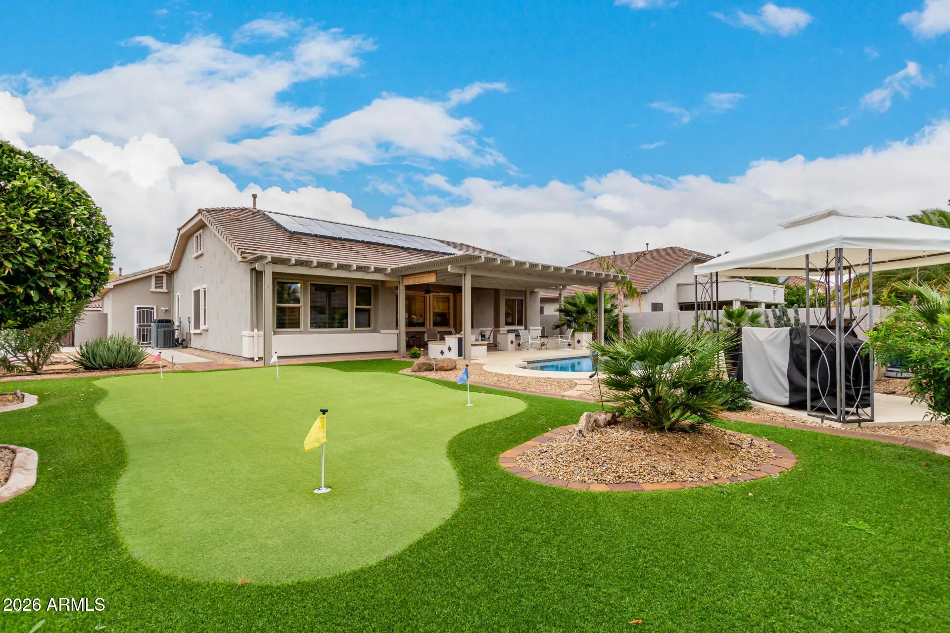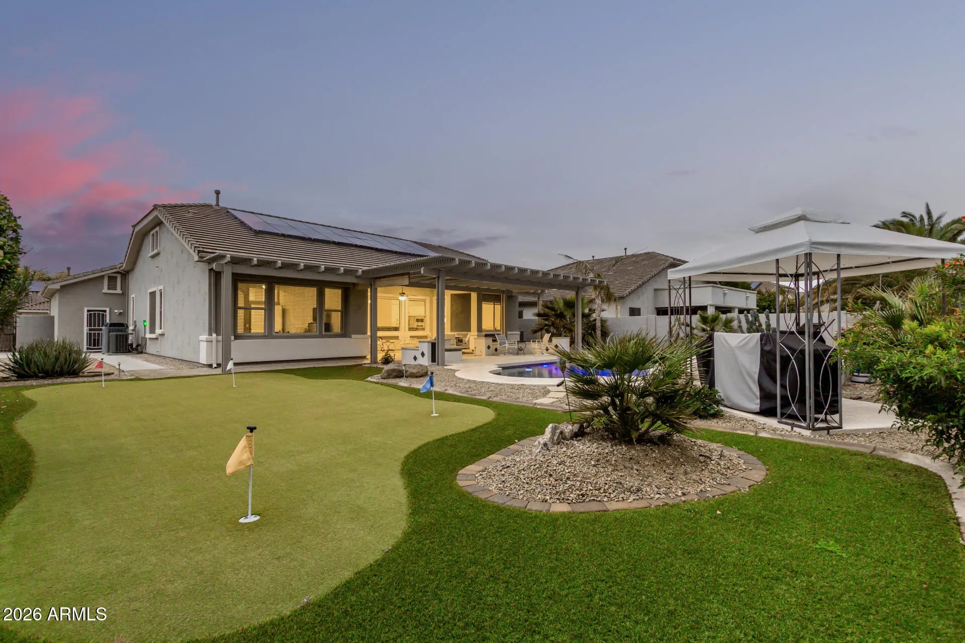 Your dream home is here! This gorgeous 3-bedroom property greets you with a 3-car garage, an RV gate, and a lovely desert landscape for excellent curb appeal. Fall in love with the enchanting open layout with soaring vaulted ceilings, a soothing palette, blinds, stylish wood-look flooring, and an inviting fireplace for intimate moments with loved ones. The stunning kitchen comes with granite counters, crisp white cabinetry with crown moulding, a striking tile backsplash, recessed lighting, stainless steel appliances, and an island with a breakfast bar for casual dining. You'll also find an open den ideal for an office or a cozy lounge. The tranquil primary bedroom boasts convenient backyard access, an ensuite with double sinks, and a practical walk-in closet. Enjoy majestic sunsets in the resort-like backyard, showcasing an extended covered patio, a warm fire pit, a charming gazebo, a putting green for golf enthusiasts, a storage shed, and a refreshing pool for cooling down on hot summer days. Make this incredible gem yours today!
