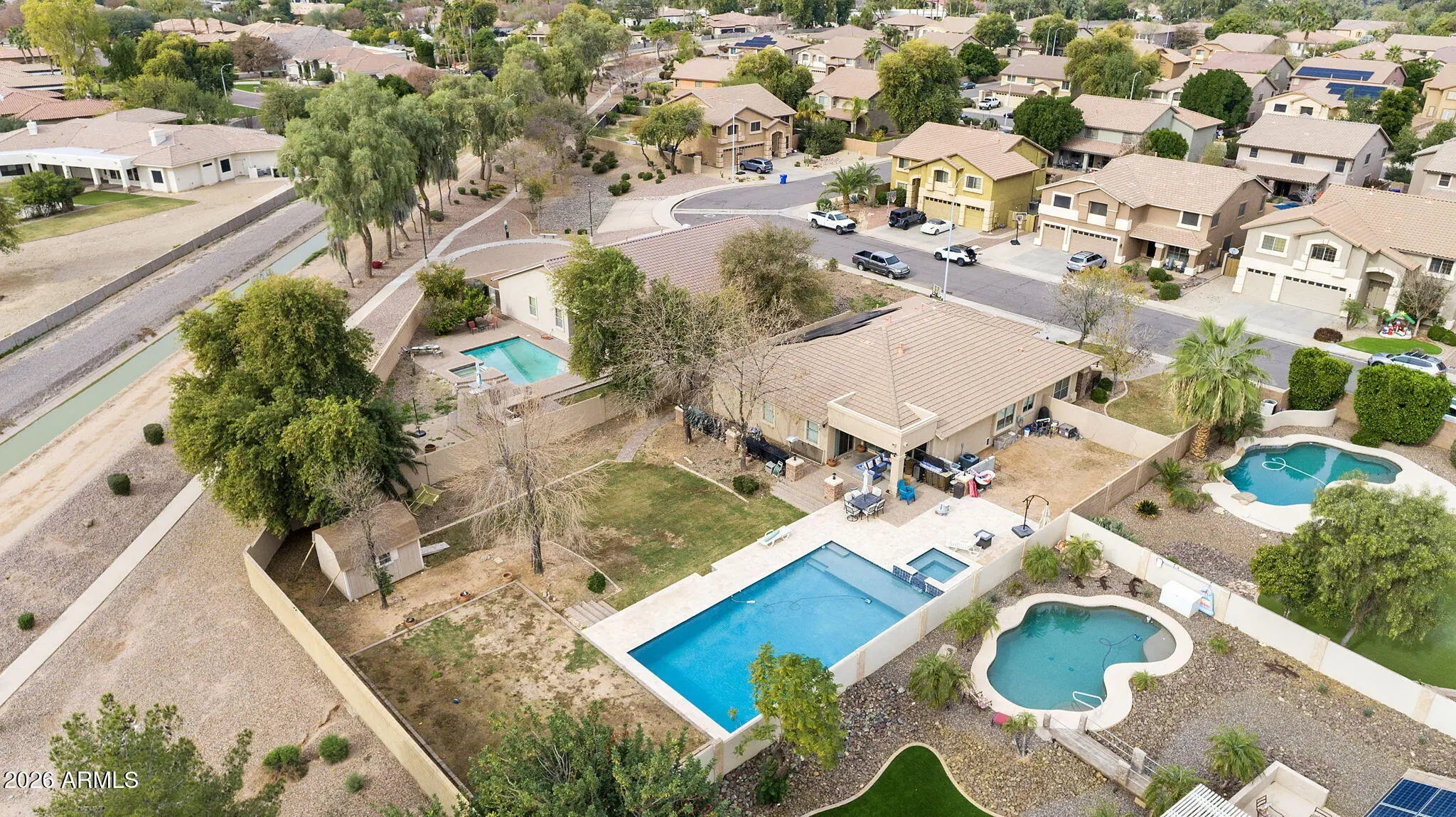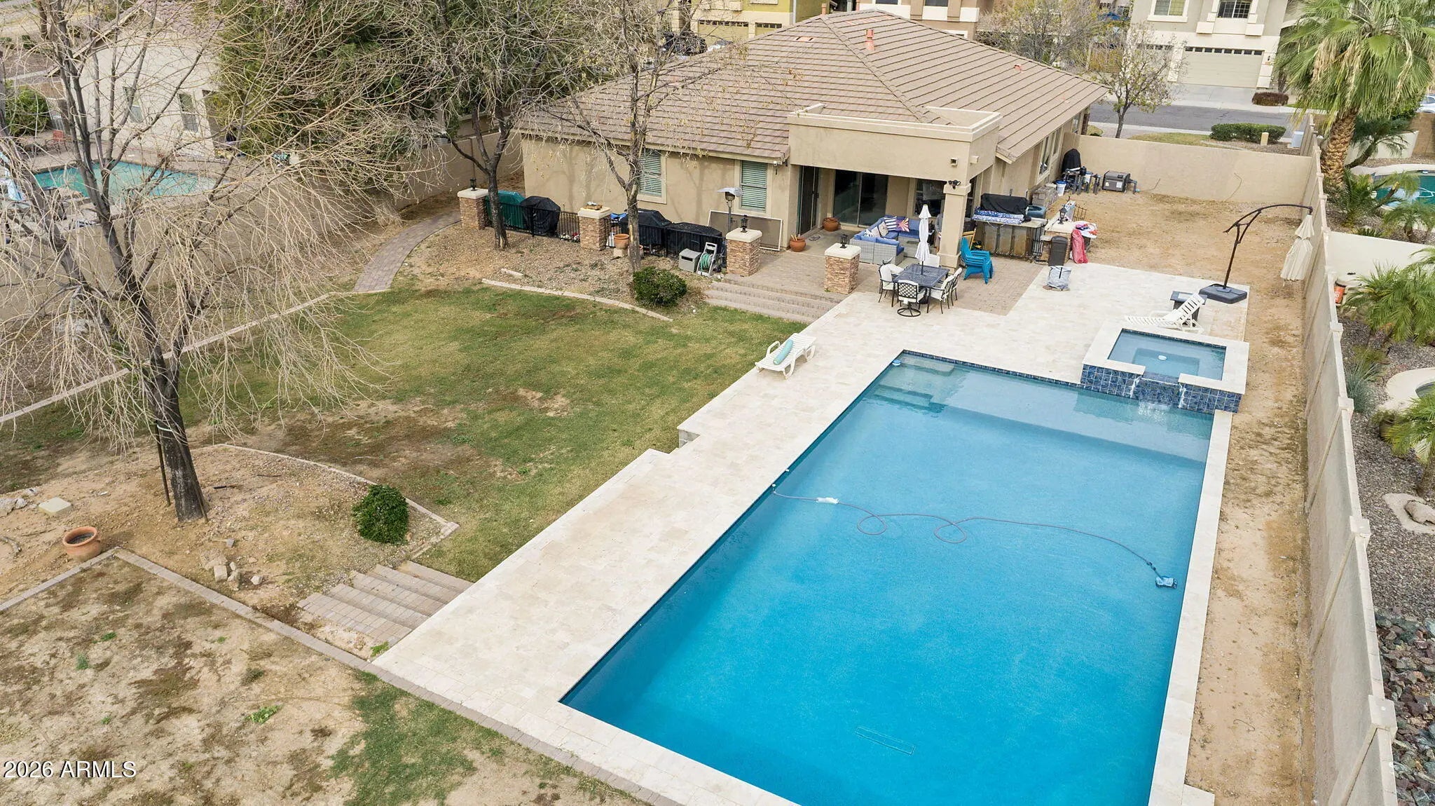 **LOOK NO FURTHER—**this single-level home in Riggs Ranch Meadow sits on one of the largest lots in the neighborhood, offering rare space and privacy. With no neighbors behind, the expansive backyard provides an open setting ideal for Arizona living. The highlight is the BRAND-NEW oversized pool and spa, a rare feature in the subdivision, with ample yard space to personalize or enhance. An RV gate with additional parking adds flexibility and value. Inside are 2,356 sq ft with a split, open floor plan, oversized primary suite with en-suite bath, upgraded kitchen with granite countertops and stainless steel appliances, custom tile flooring, spacious secondary bedrooms, a 3-car garage, great curb appeal, and a walking trail just steps away.