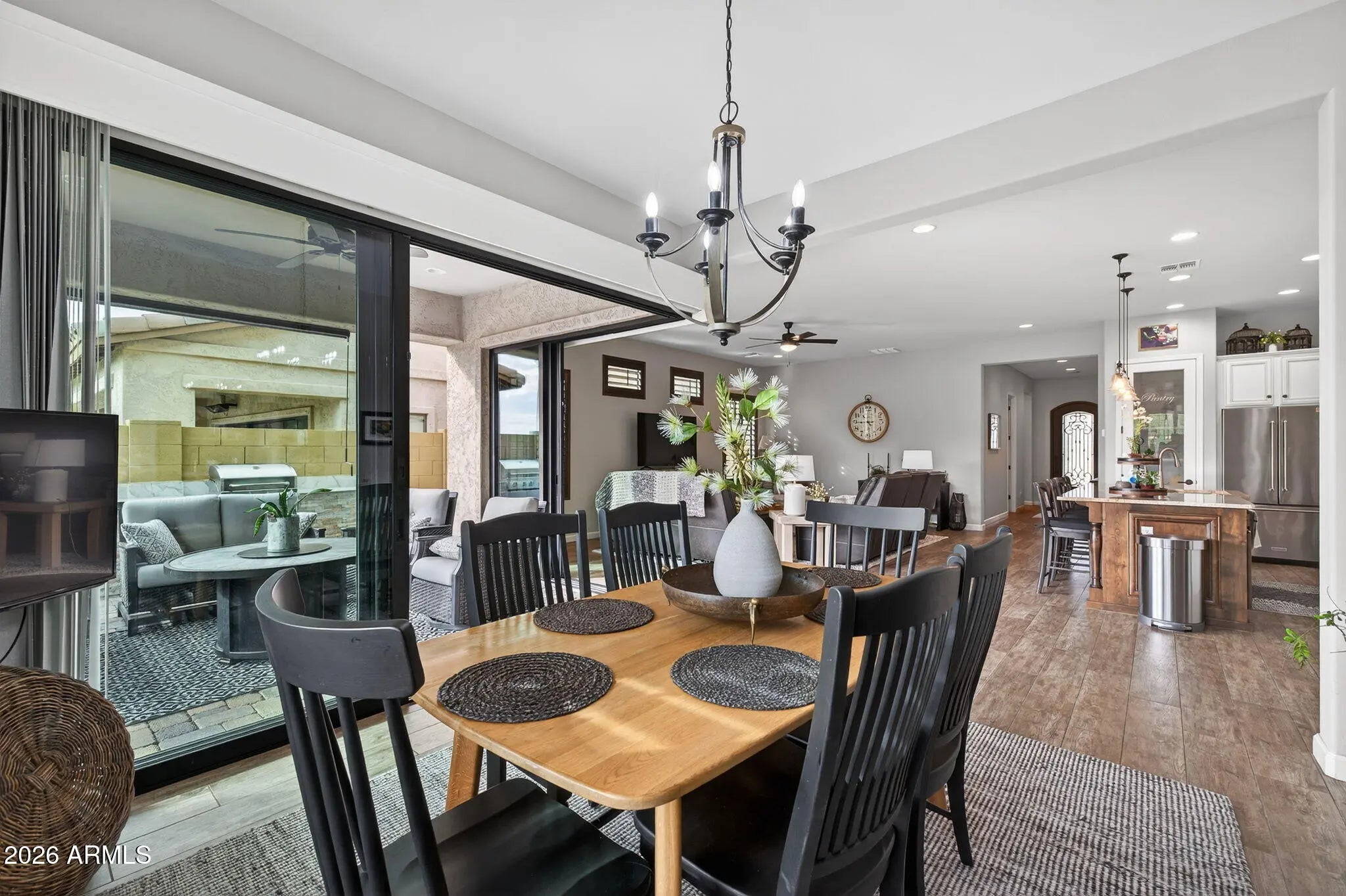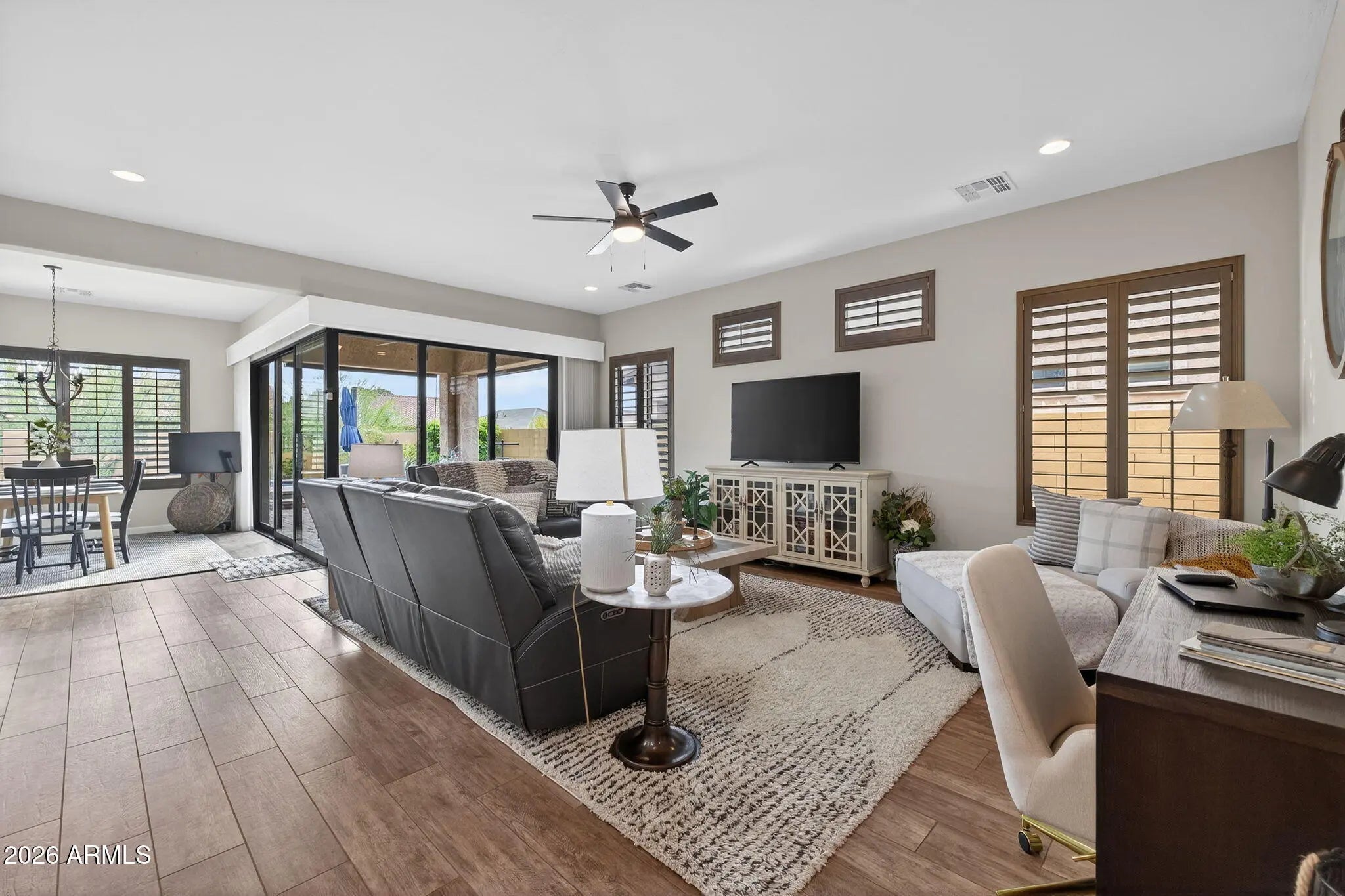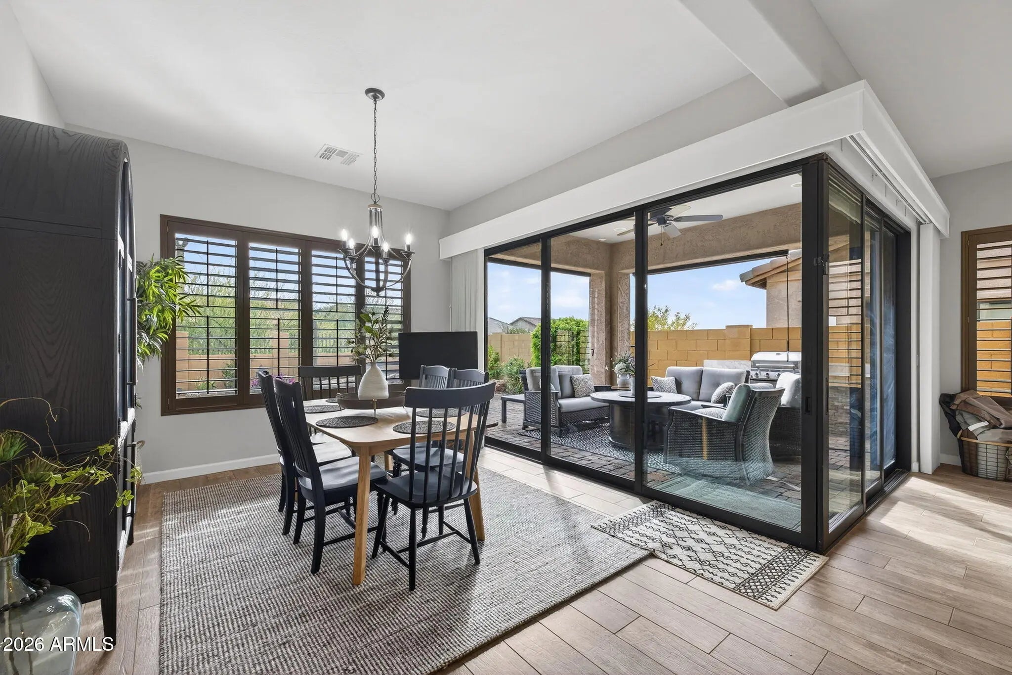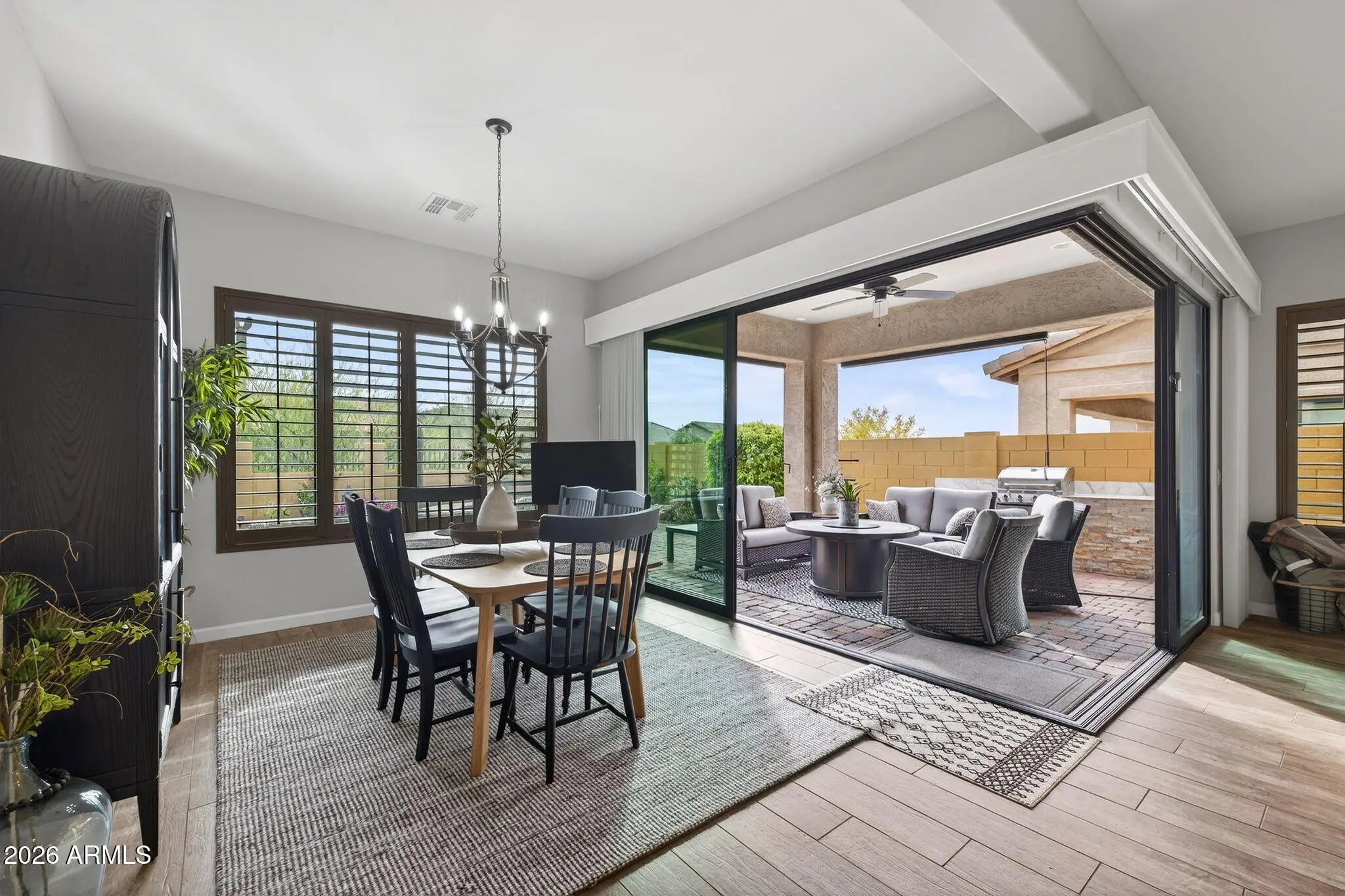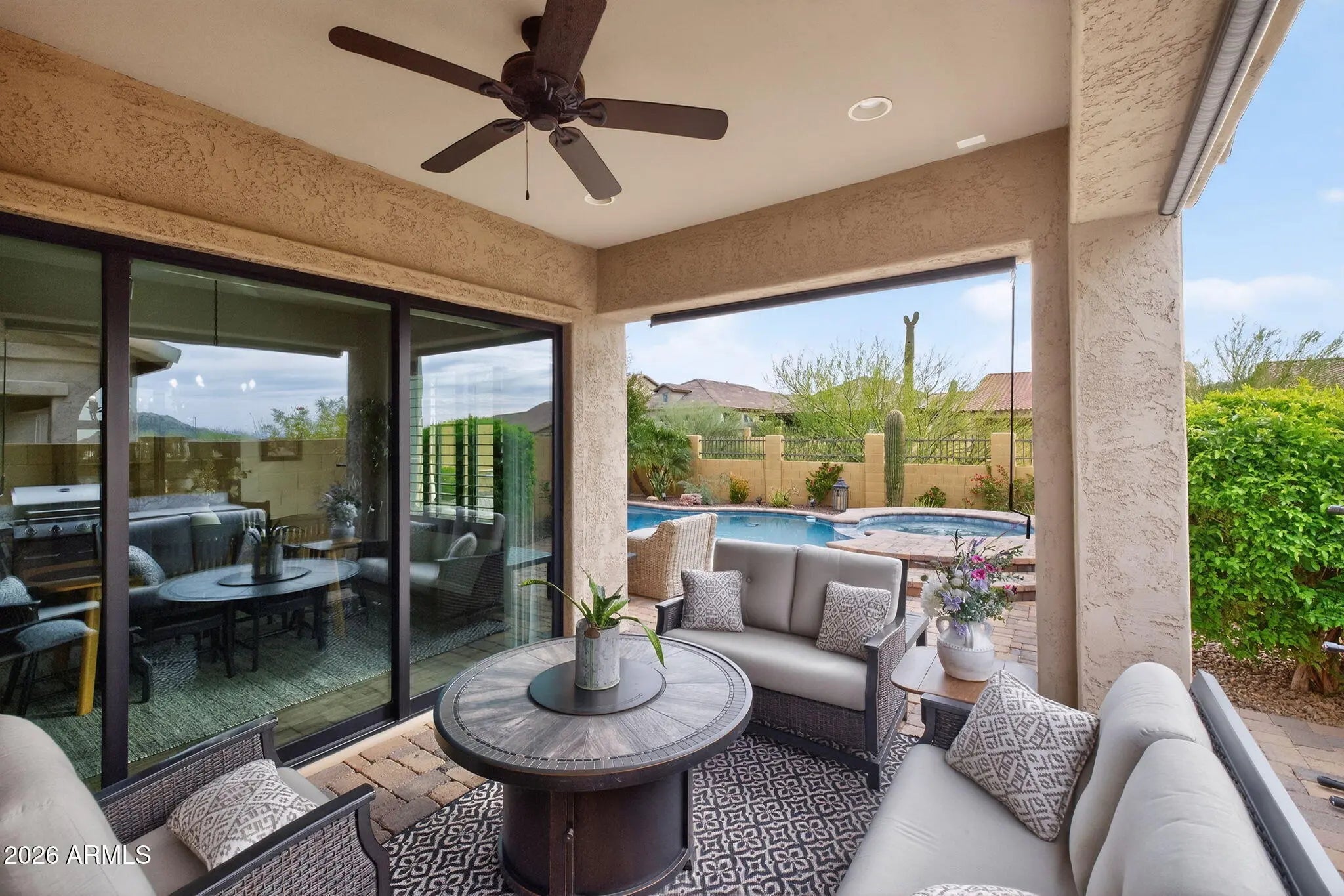 Entertainer's dream 3 bedroom, 2.5 bath home with seamless indoor-outdoor living in Sanctuary at Mountain Bridge. Open-concept design features custom finishes, abundant natural light, upgraded fixtures, and wood-plank tile flooring. Custom corner sliding doors connect living, dining, and backyard spaces. Gourmet kitchen with stainless steel appliances, granite countertops, cream cabinetry, and large island. Private primary suite with ensuite bath. Resort-style backyard with sitting area, built-in BBQ, heated pool and spa, turf, pavers, custom awning, and desert views.