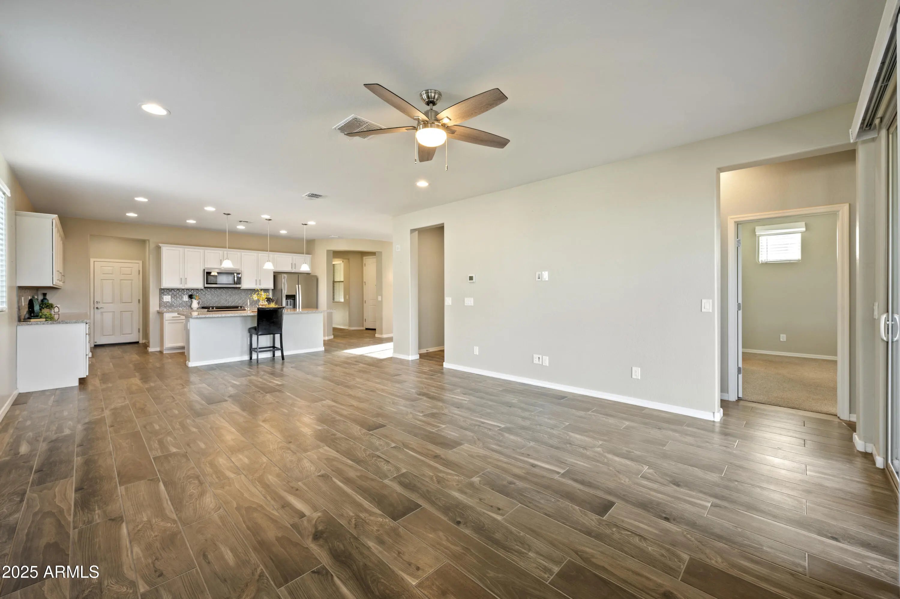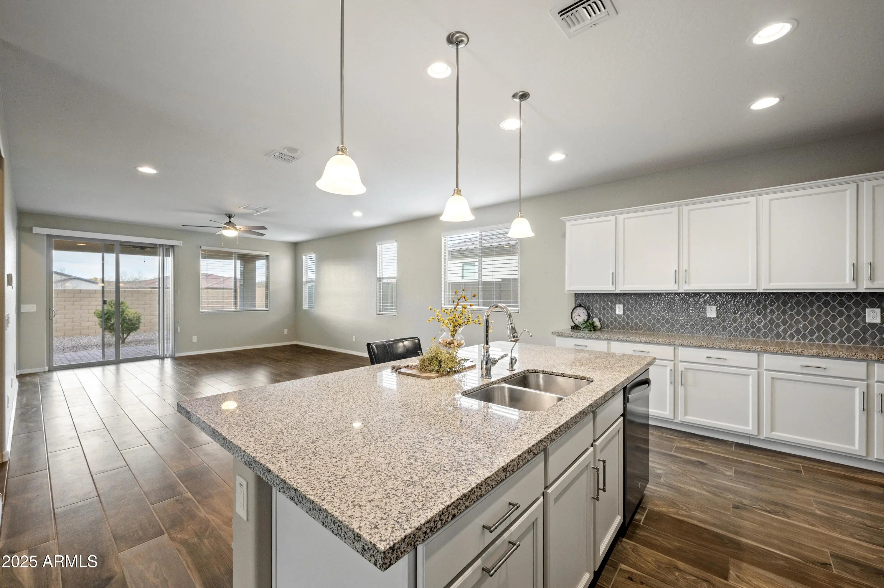 Location, location, location, only blocks from the Encore clubhouse, the popular Waltz plan offers 1,832 sq ft with 2 bdms, 2 bthms, a den, & a dining/flex rm allowing a versatile floor plan. It is a split plan allowing privacy for owner & guest. You will love the wood-look tile T/O except bdms which have upgraded carpet. The primary suite includes a W-I closet, a private water closet, a raised vanity with dble sinks & a tiled W-I shower in the primary bath with a bench. The secondary bath has a tub/shower combination, a raised vanity, & a linen closet. The kitchen boasts white cabinets, granite countertops, decorative tile backsplash, SS appliances including an upgraded gas stove. Home has lots of storage with a lg W-I pantry & extended cabinets at the key drop zone. The dining/flex.... rm has many possible uses. The separate laundry rm also has upper & lower cabinets & drying rack. Dble door storage closet adds to the functionality of the house. The garage also offers a wall of storage cabinets & epoxy floor. This home is move-in ready, waiting for your truck to move. Encore at Eastmark is an award-winning Active Adult community, offers living at its best. The community center offers a wealth of amenities, including a workout facility, a meeting rm, a card rm, a ping-pong rm with 2 kilns, a billiard rm, & the Proving Ground Café. Encore also features pickle ball, tennis, bocci ball & lots of green space with walking trails. Encore has something for everyone with its many year-round clubs & activities.