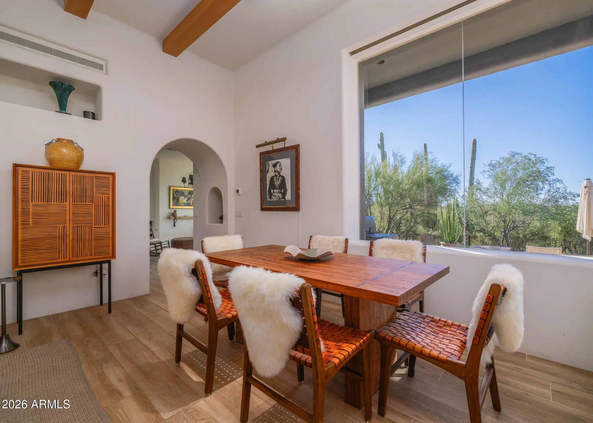 Set on nearly 2 acres in a gated Carefree enclave, this Bill Tull designed adobe-inspired contemporary home offers 12' Pueblo ceilings, kiva fireplace, and expansive windows framing Black Mountain. Split-plan primary suite with spa bath and Japanese soaking tub; guest casita; farm-style kitchen with hand-crafted maple cabinetry; infinity-edge pool, Baja shelf spa, pergola with fire pit; botanical-quality desert landscaping. Light-filled interiors, hand-crafted details, and high-efficiency windows blend authentic Southwestern inspiration with modern comfort. Rare, private, and timeless. Turn-Key perfect and priced to sell! New to market! Hacienda Escondido de los Saguaros 5943 E. Carefree Mountain Road | Carefree, Arizona Quietly sited among a cathedral of mature saguaros, Hacienda Escondido de los Saguaros is a rare, late-career work by William "Bill" Tull. This adobe-inspired Contemporary Pueblo residence merges sculptural form, hand-crafted detail, and a deep connection to the Sonoran Desert. From nearly two acres of pristine desert, the home offers intimate Black Mountain views and sweeping sunsets within a preservation-forward gated enclave. The great room, with soaring 12-foot Pueblo ceilings and kiva fireplace, is the heart of the home. Expansive windows frame the desert landscape, while light-filled interiors and hand-crafted details convey warmth and timeless character. The split-plan primary suite is a serene retreat with spa-inspired bath and Japanese soaking tub, while a screened garden walkway leads to a flexible guest casita for privacy or creative use. Outdoors, the home functions as a private desert resort. Infinity-edge pool, Baja shelf spa, pergola with fire pit, and botanical-quality landscaping blend comfort with nature. Thoughtful touches such as a screened gardening patio, mature saguaros, and high-efficiency architectural windows reinforce the home's connection to the land. A rare Bill Tull adobe-inspired residence, this home embodies desert modernism at its most elegant. Key Features Coming Soon Bill Tull Architectural Designer Modern Adobe-inspired design Gated Carefree enclave on 2+ Acres 12' gallery-style beam ceilings Kiva fireplace & hand-crafted details Split-plan primary suite with soaking tub Guest casita retreat Infinity-edge pool & Baja shelf Spa and Patios Pergola with fire pit Botanical- Garden quality desert landscaping