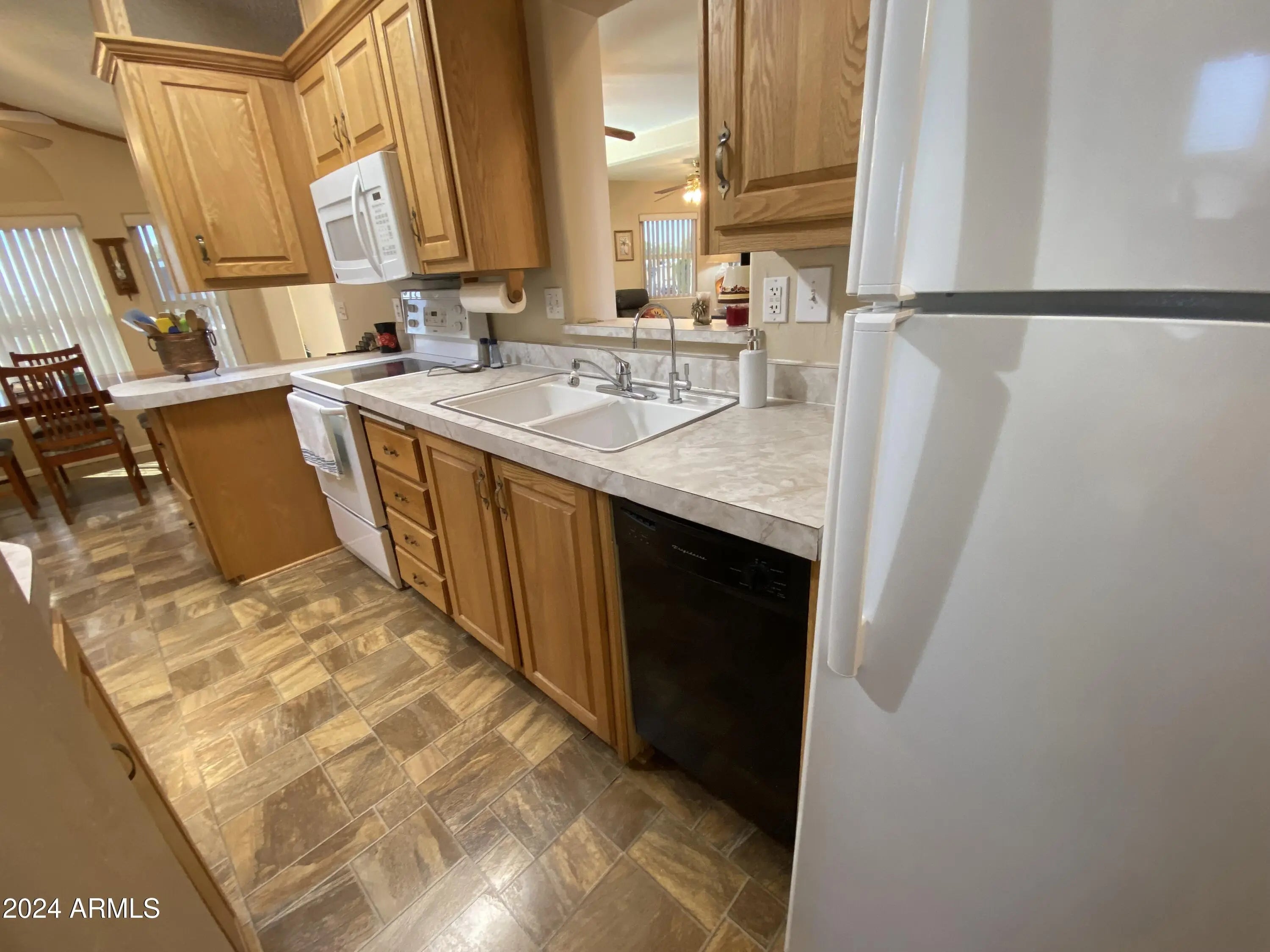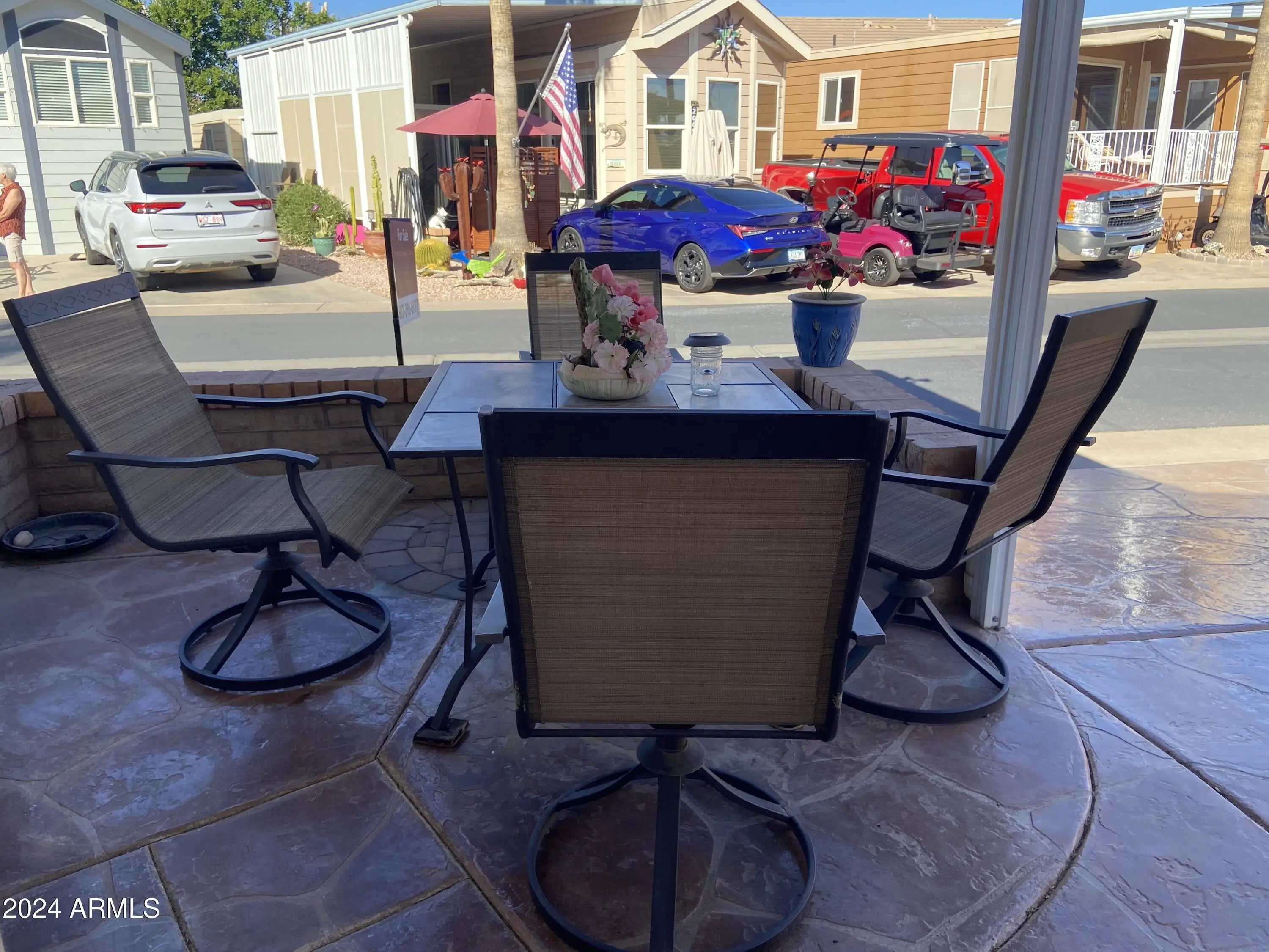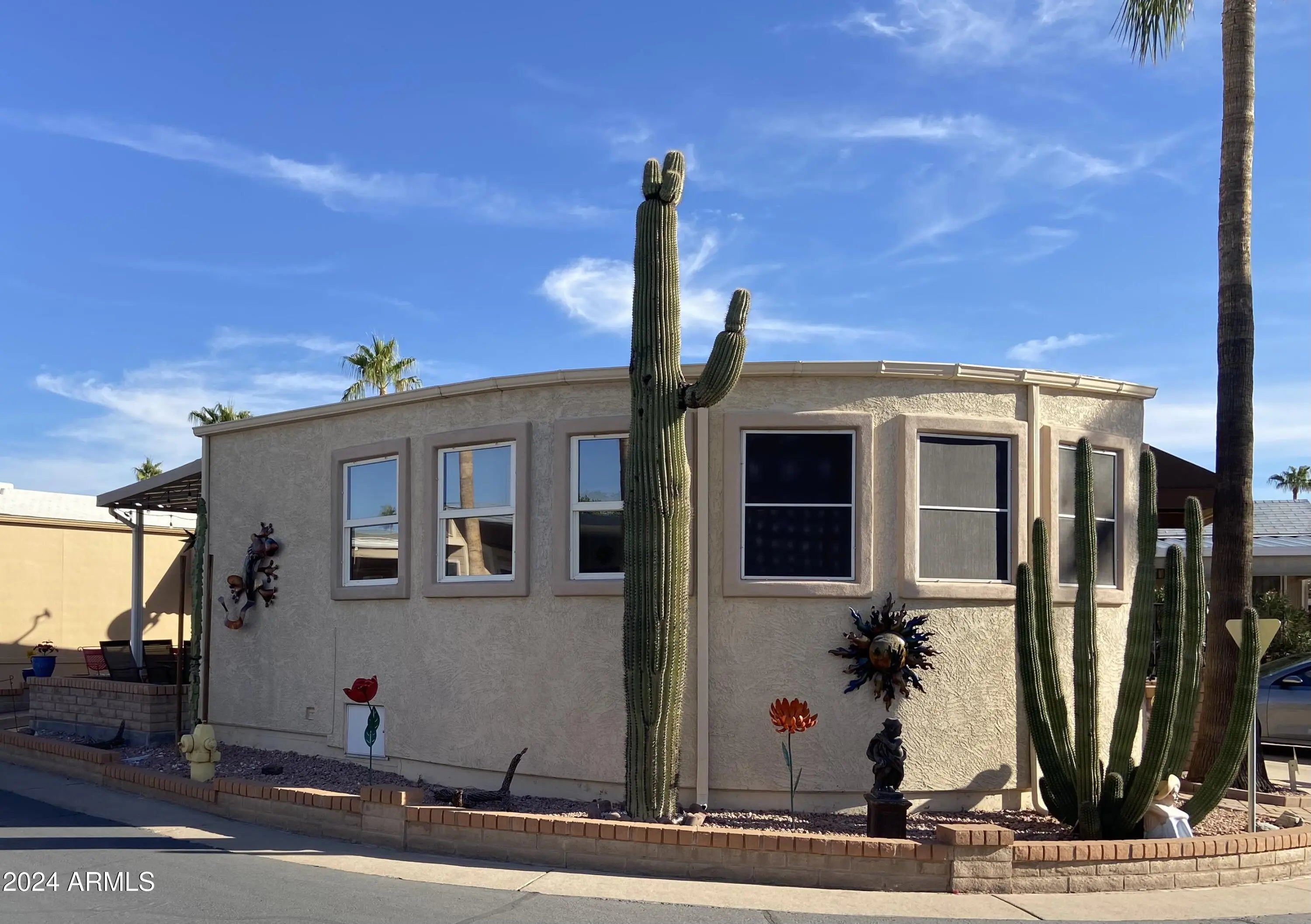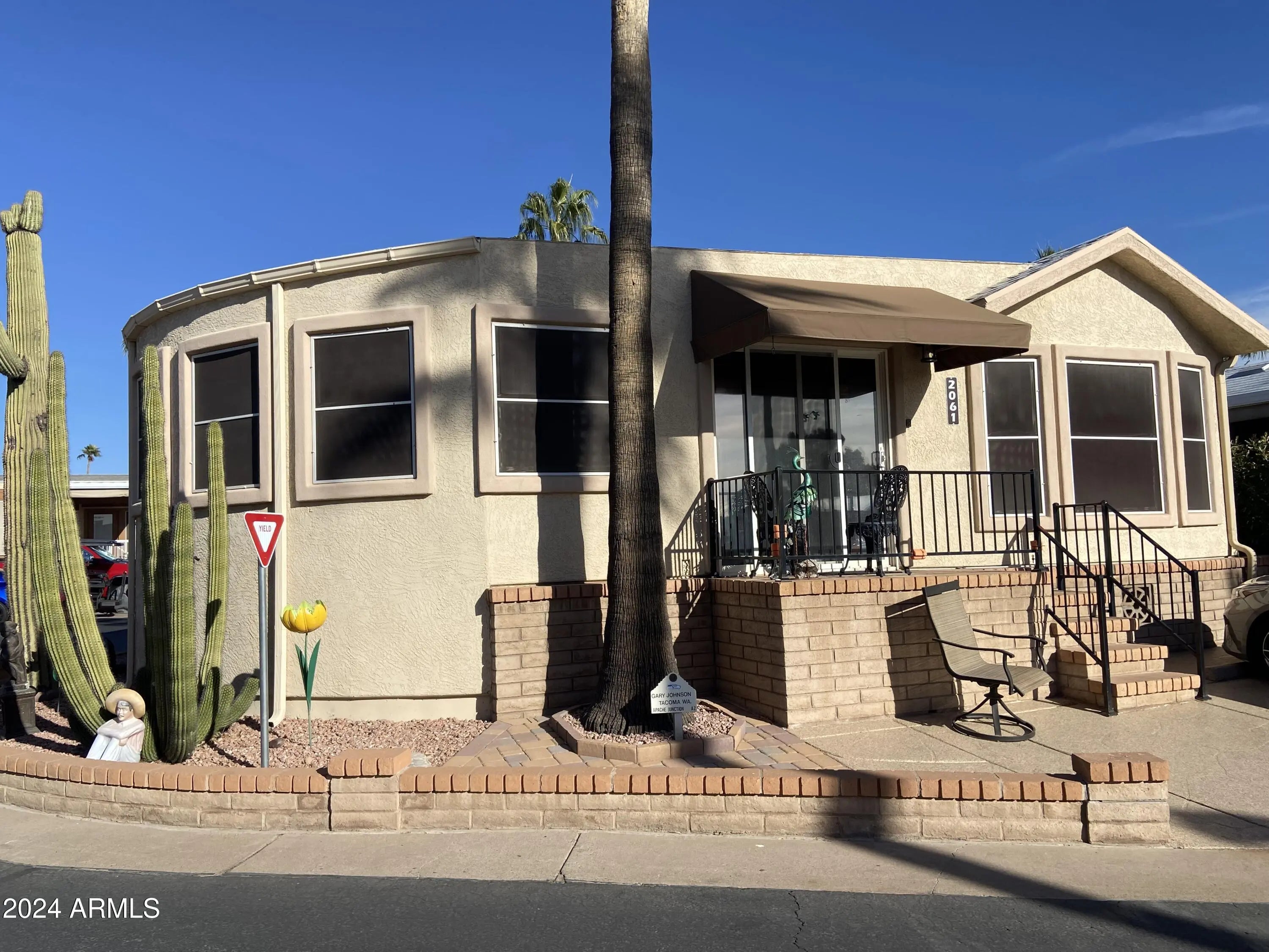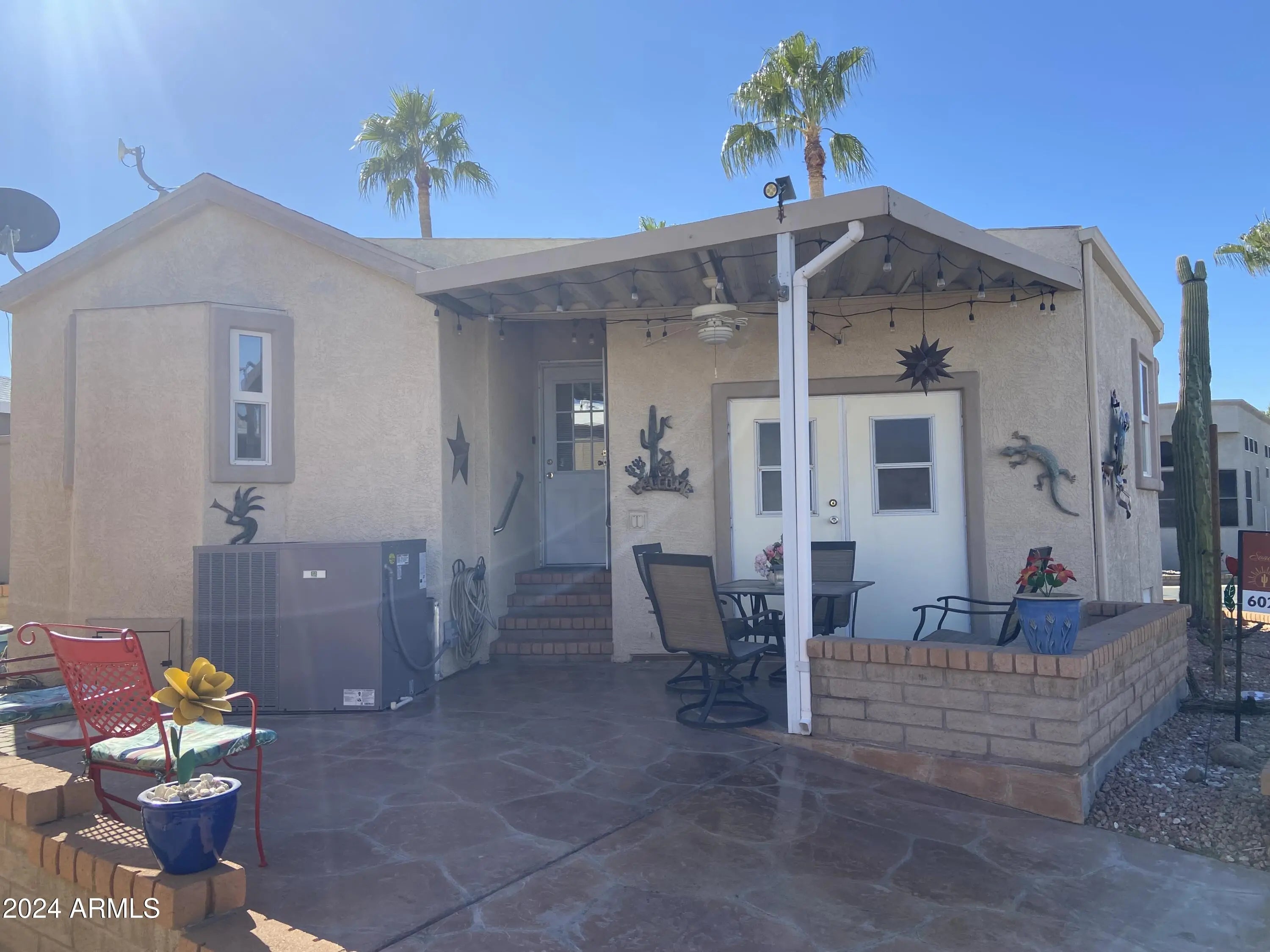 These don't come on the market often! Stucco exterior and a corner lot location with mountain views from the back patio! Inside laundry, spacious Arizona room and a second bedroom/office. Sunrise and sunset views, everything is on one level (no interior steps) Room to park multiple vehicles and outdoor storage. Retirement living at it's very best in this 55+ golf course resort with endless amenities including an onsite restaurant, lap pool, play pool, and therapy pool, up to date exercise center, 2 spas, pickleball, tennis, bocce ball ... the list goes on. Free park tours daily.