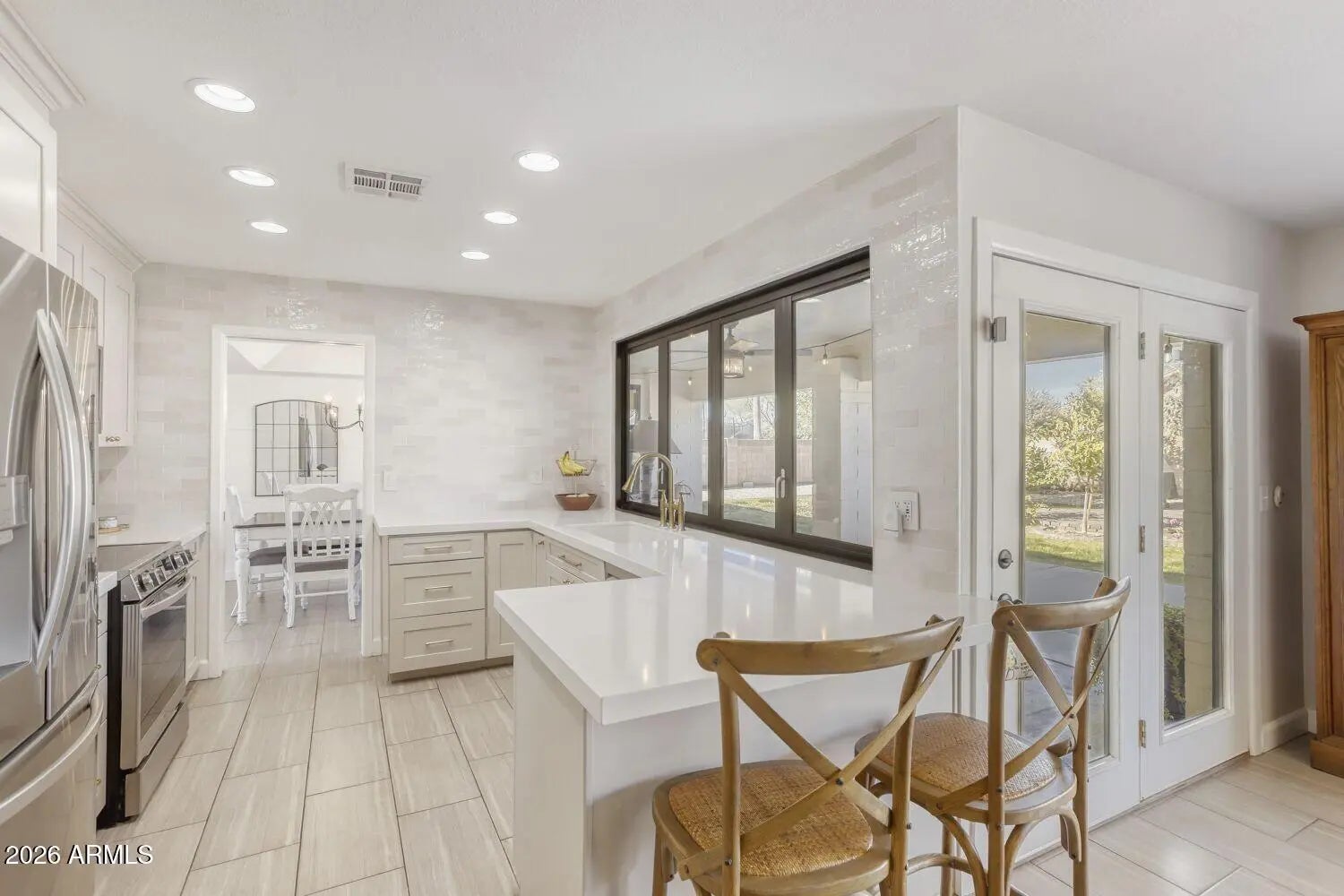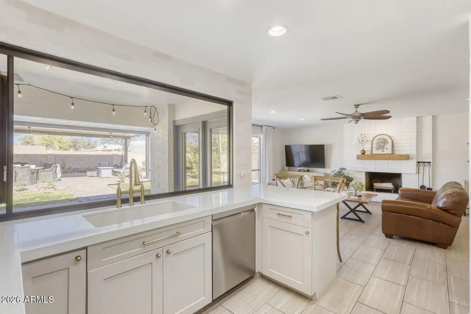 Beautifully remodeled 3-bedroom, 2-bath block home built in 1977, ideally located in the highly sought-after community of Litchfield Park, just minutes from the iconic Wigwam Resort. A true West Valley gem, this 1,755 sq ft residence sits on an expansive 11,185 sq ft (¼-acre) lot and blends timeless character with modern upgrades throughout. The fully remodeled kitchen is a standout, featuring updated finishes, a peninsula, an induction range, and a rare gliding window that fully opens to the backyard—perfect for indoor/outdoor living and entertaining. The kitchen flows into a cozy family room anchored by a classic brick fireplace. Large picture windows throughout fill the home with natural light, creating a bright and inviting feel. No carpettile and luxury vinyl plank flooring throughout provide both style and easy maintenance. The primary suite offers a completely renovated bathroom with a tiled shower, new tile flooring, vanity, mirror, fixtures, window, and toilet. The secondary bathroom has also been fully remodeled with a tile shower, new vanity, mirror, and toilet. The backyard is thoughtfully designed for both relaxation and entertaining, featuring a huge pergola, lush lawn, rose bushes, and paversideal for BBQs and gatherings. Additional recent upgrades include new attic insulation (2025) and new backyard irrigation lines (2025). Enjoy a walkable lifestyle with easy access to local restaurants, markets, the library, elementary school, and the newly developed Litchfield Square. Litchfield Park is known for its no-HOA lifestyle and low property taxes, offering long-term value and flexibility. This move-in-ready home delivers an exceptional combination of location, charm, and modern comfort.
