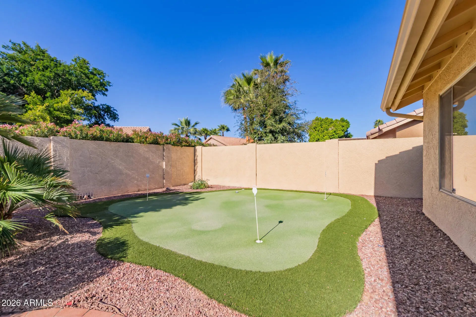 *20k BELOW RECENT APPRAISAL* docs tab 'APPRAISED IN CURRENT CONDITION- FOR CURRENT MARKET.' FREE 10k FOR REMODEL MONEY!* FREE 10k for Closing costs! Or take it all off the price! FREE Home Warranty with the purchase! *BRAND NEW ROOF *12-2025! Will have FRESH PAINT inside on 03-01-26 All Stainless applinaces stay! And in the garage, wait till you see the ''mud sink'' and all the TON extra cabinets in there! WOW!! Granite counters with upgraded beveled edges. Drinking water system under the sink, awesome decorative Pot Shelves. The front bath was remodeled 2020 with a Step In Shower, The master bath offers double sinks, and a HUGE Walk in Closet!! Of course all Dual pane windows with ''Levelor Blinds''. NEEDS Paint & Carpet but priced accodingly. (see mo **BUT WAIT! THERES MORE!* Your own PUTTING GREEN! YES, THATS RIGHT....YOUR OWN PRIVATE PUTTING GREEN IN BACK! All desert Landscaping design, NO MOWING! AC tuned up last month, running great! The most delicious organiic Orange and Tangelo trees. All are on a custom designed watering system, no muss-no fuss. Seriously, you gotta come and see! This comunity is GORGEOUS, and walking distance to the Golf Course. check out the website for this home! -