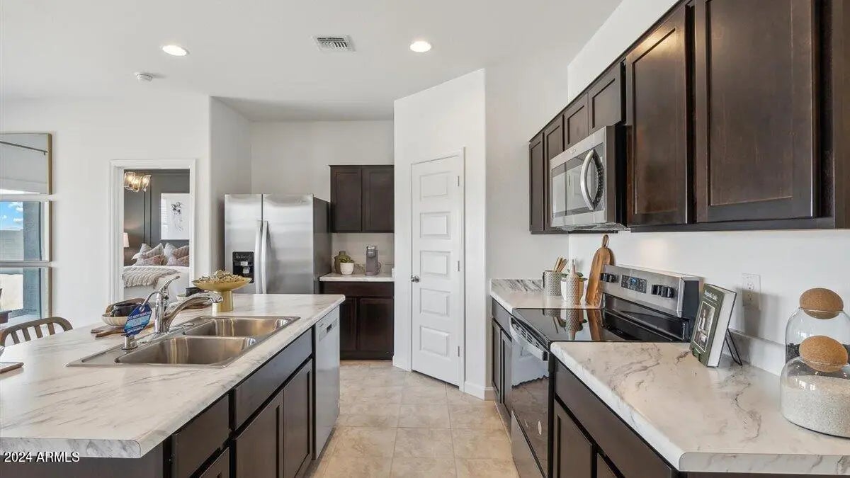BRAND NEW | Home Ready Now | N/S Corner Lot! | Just imagine... A 3-bedroom plan that feels spacious. It just feels right... Like home. That is the Denton plan. This is one you WILL want to see in person. Interior finishes include granite kitchen & bathroom counter tops, espresso cabinets, and tile flooring throughout, except the bedrooms. Smart home technology is included along with a 14 seer HVAC and energy saving features. Also, this home includes stainless steel appliances, 220v pre-wire in the garage, 2'' window blinds, garage door opener, rain gutters, plus front yard desert landscape. Come see this home in the desert's most sought after hidden gem, Magma Ranch Vistas!