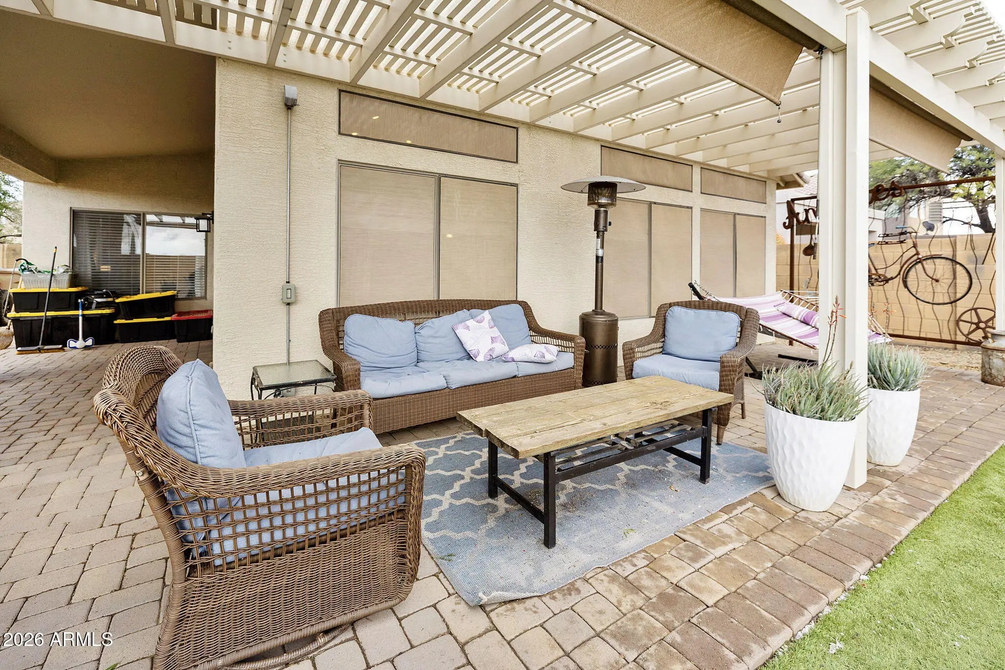 Designed for the Arizona lifestyle, this inviting home blends comfort, style, & effortless indoor-outdoor living with a custom pergola. Large windows & high ceilings fill the space with natural light, creating an open atmosphere perfect for everyday living and entertaining. Enjoy serene backyard views from inside or unwind on the covered patio—ideal for morning coffee or evening sunsets. Tile flooring and upgraded cabinetry add both beauty and durability. The spacious bathroom features dual sinks, elegant fixtures, and a relaxing tub/shower combo. Generously sized bedrooms with abundant natural light. New A/C 3 yrs. ago. New water heater 2 yrs. Added mini split.Perfectly located & move-in ready, this home delivers relaxed desert living at its best. Come See!
