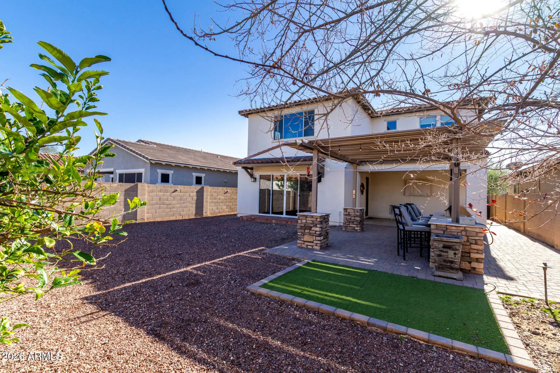 Beautiful two-story home in the highly desirable Verrado community featuring 5 bedrooms, 3.5 baths, and an upstairs laundry room. Thoughtfully designed floor plan includes a main-level bedroom and bath, ideal for guests, multigenerational living, or flexible use. Open living areas offer abundant natural light and flow seamlessly into a functional kitchen perfect for everyday living and entertaining. The home features solar and a whole-home water filtration system for added efficiency and comfort. The backyard is designed for entertaining with a built-in barbecue grill, bar, and pergola, creating an inviting outdoor living space. Upstairs features a spacious primary suite and additional bedrooms conveniently located near the laundry room. Enjoy all that Verrado has to offer including parks, pools, trails, golf, dining, and community events. An exceptional rental opportunity in one of Buckeye's most sought-after master-planned communities.