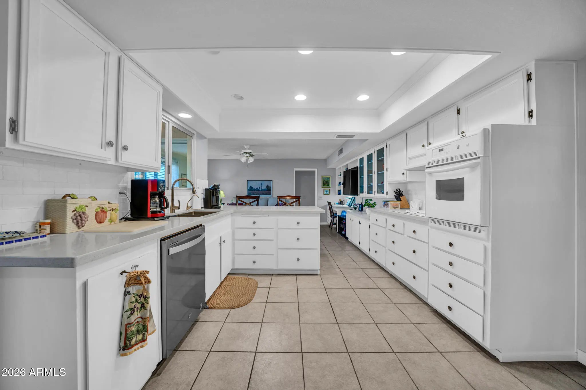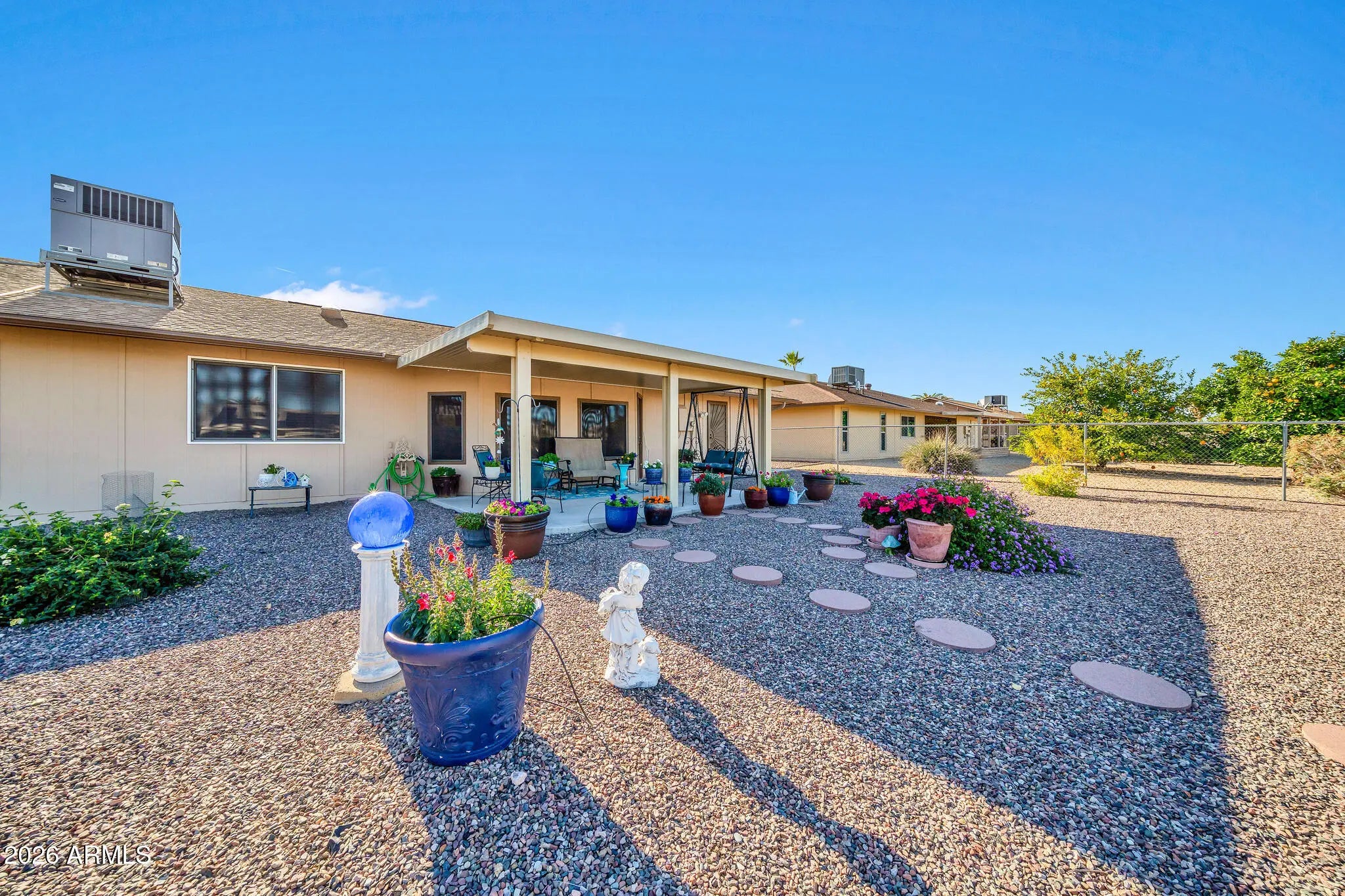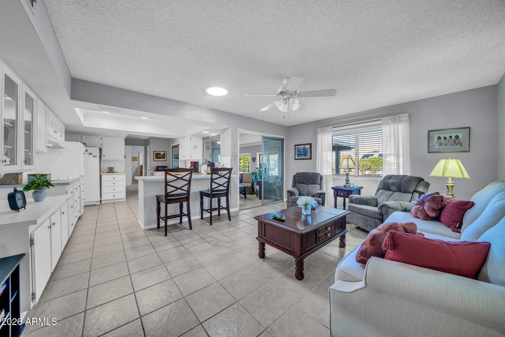 Welcome to this stunning and highly sought-after Annapolis model in Sun City,featuring 2 bedrooms and 2 baths. This wonderful home offers beautiful laminate flooring throughout the living areas and bedrooms, complemented by tile flooring in the kitchen, den, and bathrooms. The spacious kitchen boasts an abundance of cabinetry, solid stone countertops, stainless steel appliances, and a designer subway tile backsplash. Both bedrooms are generously sized and include walk-in closets. The large laundry room provides excellent storage and functionality, while the Arizona room adds valuable flexible living space. Step outside to an open and spacious backyard designed for easy maintenance with desert landscaping-allowing you to relax and enjoy carefree Arizona living!