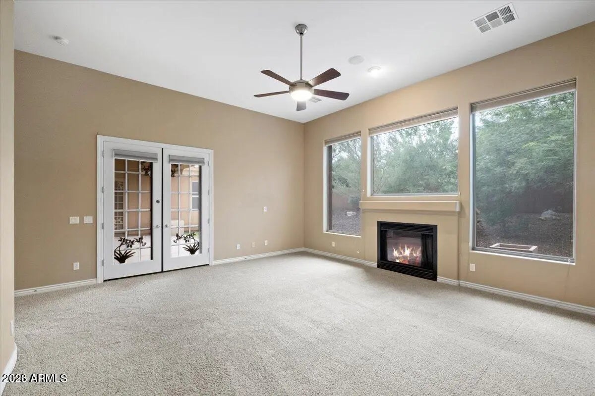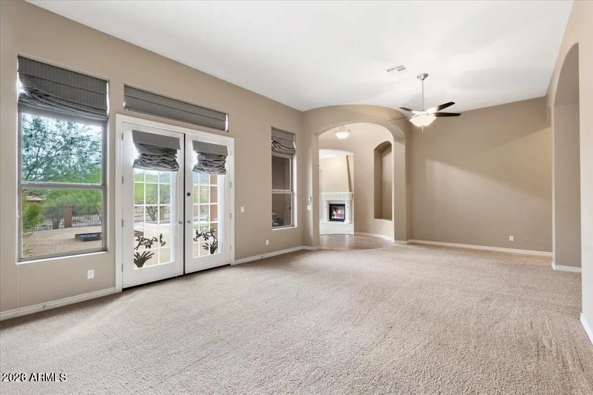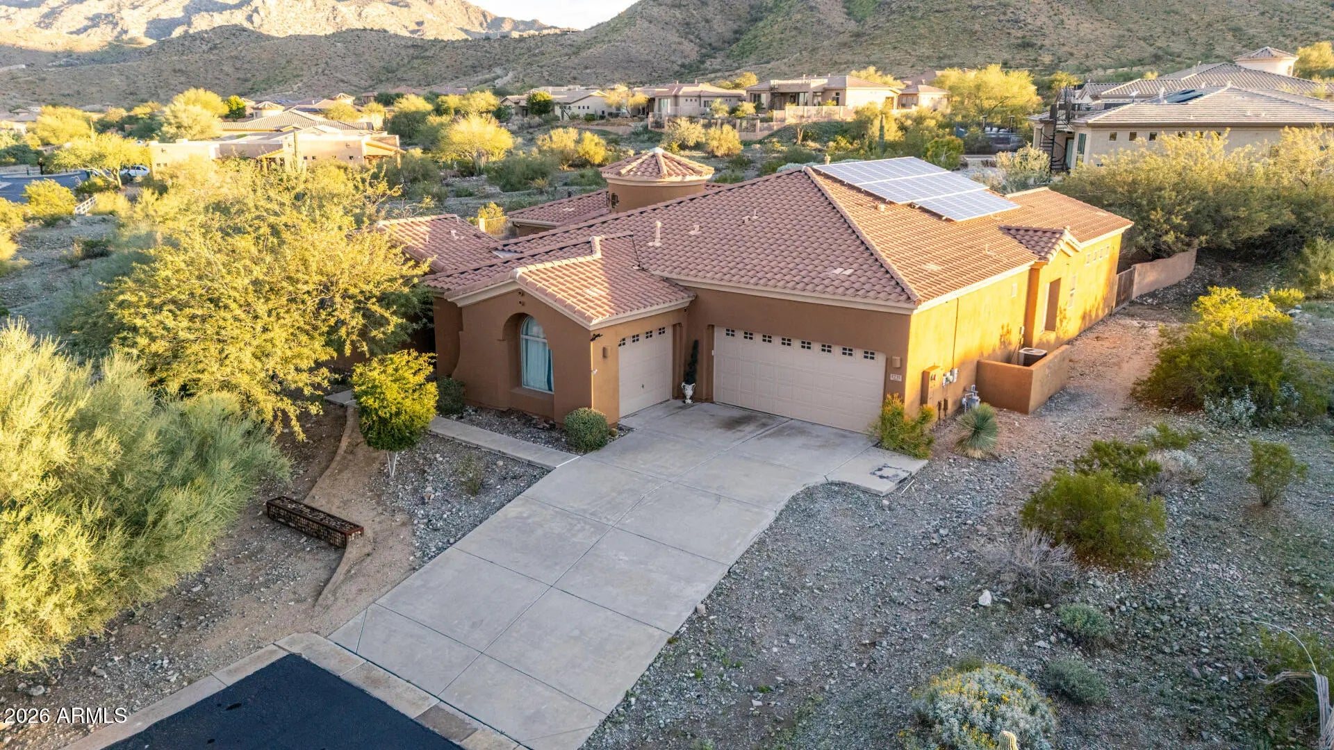 This stunning executive luxury single-story home commands breathtaking panoramic views of the entire Phoenix valley and majestic mountains from its prime hillside perch—a true entertainer's dream and private retreat!Arrive through a charming courtyard entry framed by low-maintenance desert landscaping that welcomes you with effortless elegance. Owned solar panels dramatically reduce your energy costs (cutting your power bill in half!), while the 3-car garage and RV gate provide ample space for vehicles and toys.Step inside to a dramatic rotunda foyer that flows seamlessly into spacious, cozy living areas bathed in natural light. Multiple fireplaces create inviting warmth and ambiance. A convenient powder room adds everyday ease, and the generously sized bedrooms offer comfort, privacy, and retreat-like serenity. The well-equipped kitchen is a chef's delight, designed for both daily meals and effortless entertaining. Don't miss the standout feature: a detached casita/guest house (approximately 270 sq ft) with its own bathroomperfect as a separate office, in-law suite, or private getaway. Outside, your spacious backyard oasis awaits: dive into the sparkling blue lap pool, relax on synthetic grass that's always green and carefree, and savor the dramatic mountain and valley vistas framed by a view fence. Shaded and manicured, this resort-style backyard is ideal for year-round Arizona living and unforgettable gatherings. This beautifully upgraded, executive-style residence blends luxury, functionality, and unobstructed views like no other. Seller may carry financingmaking this must-see gem even more attainable! Make your private tour todaythis hillside masterpiece won't last long!