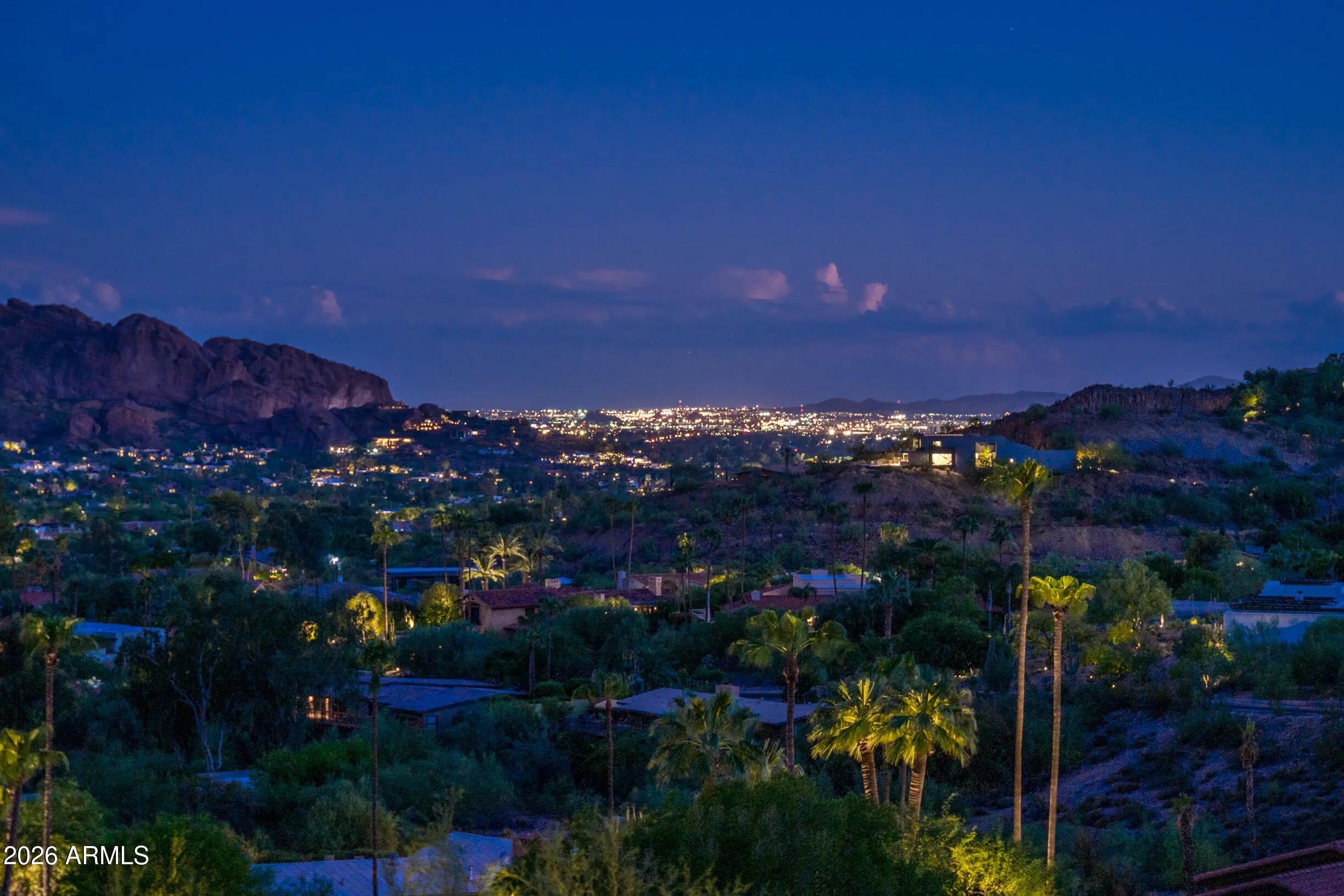 Welcome to the quintessential lock-and-leave second home in Arizona's WEALTHIEST Zip code, located within the prestigious GUARD-GATED Clearwater Hills community. This mid-century residence offers epic Camelback Mountain and city light views with primarily single-level living and guest accommodations below. Reconstructed in 2007 by award-winning builder Greg Hunt, the home blends iconic architecture with modern luxury. The main level features walnut hardwood floors, Hope wrought iron windows and doors, formal living and dining spaces, and a gourmet kitchen with Russian marble, dual islands, and Sub-Zero/Wolf appliances. Below, a bonus family room and guest bedrooms create the perfect retreat for visitors. A timeless hillside sanctuary that defines Paradise Valley living at its finest.