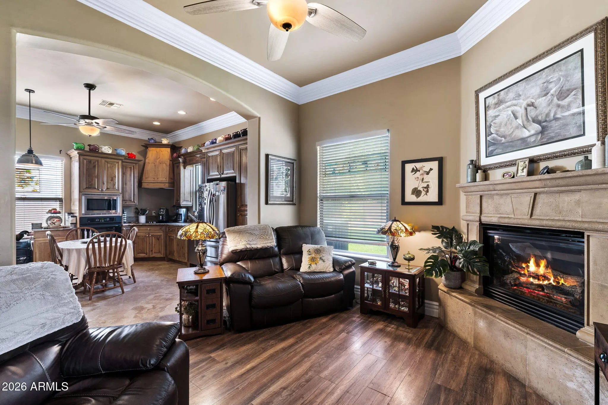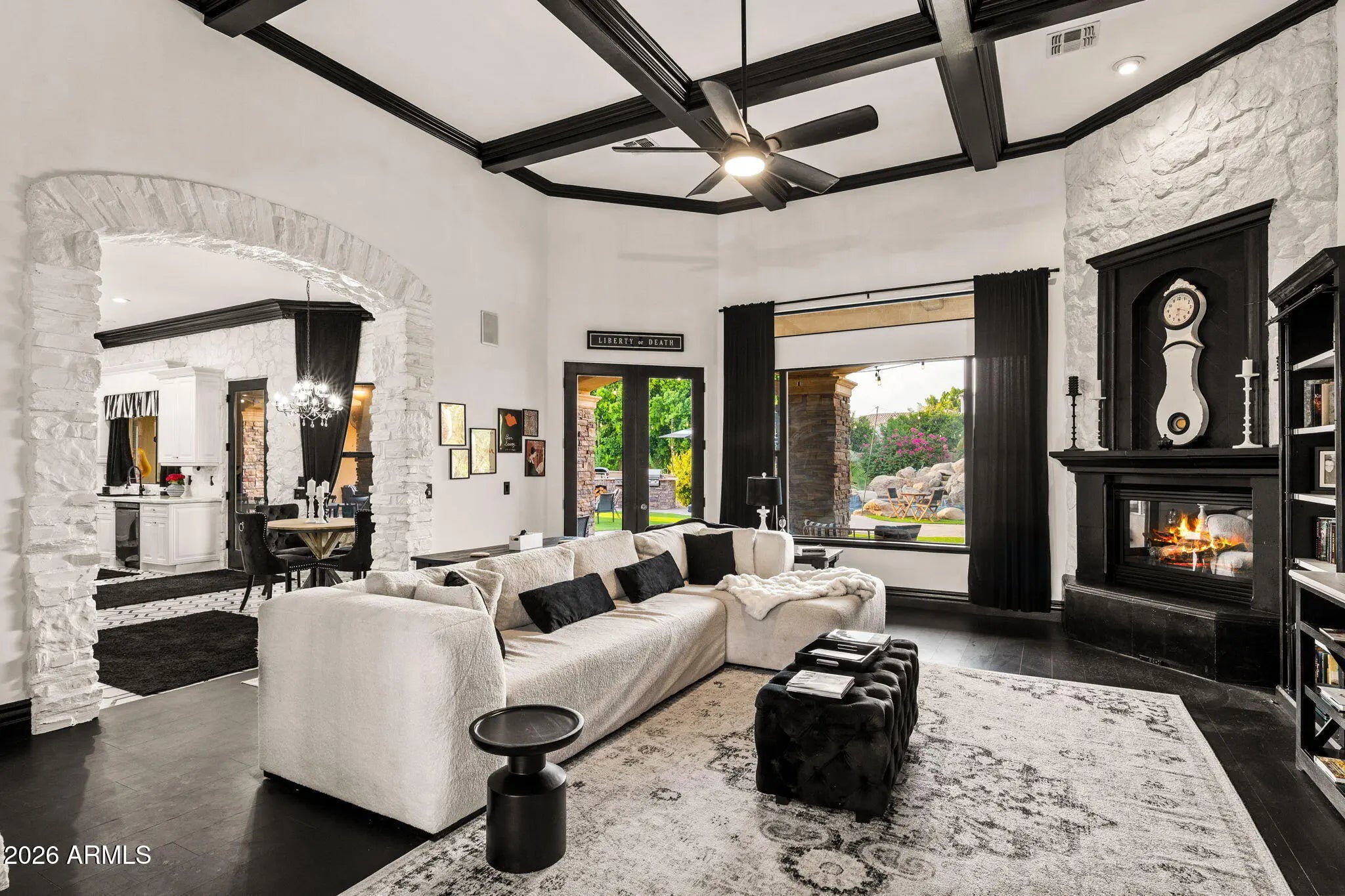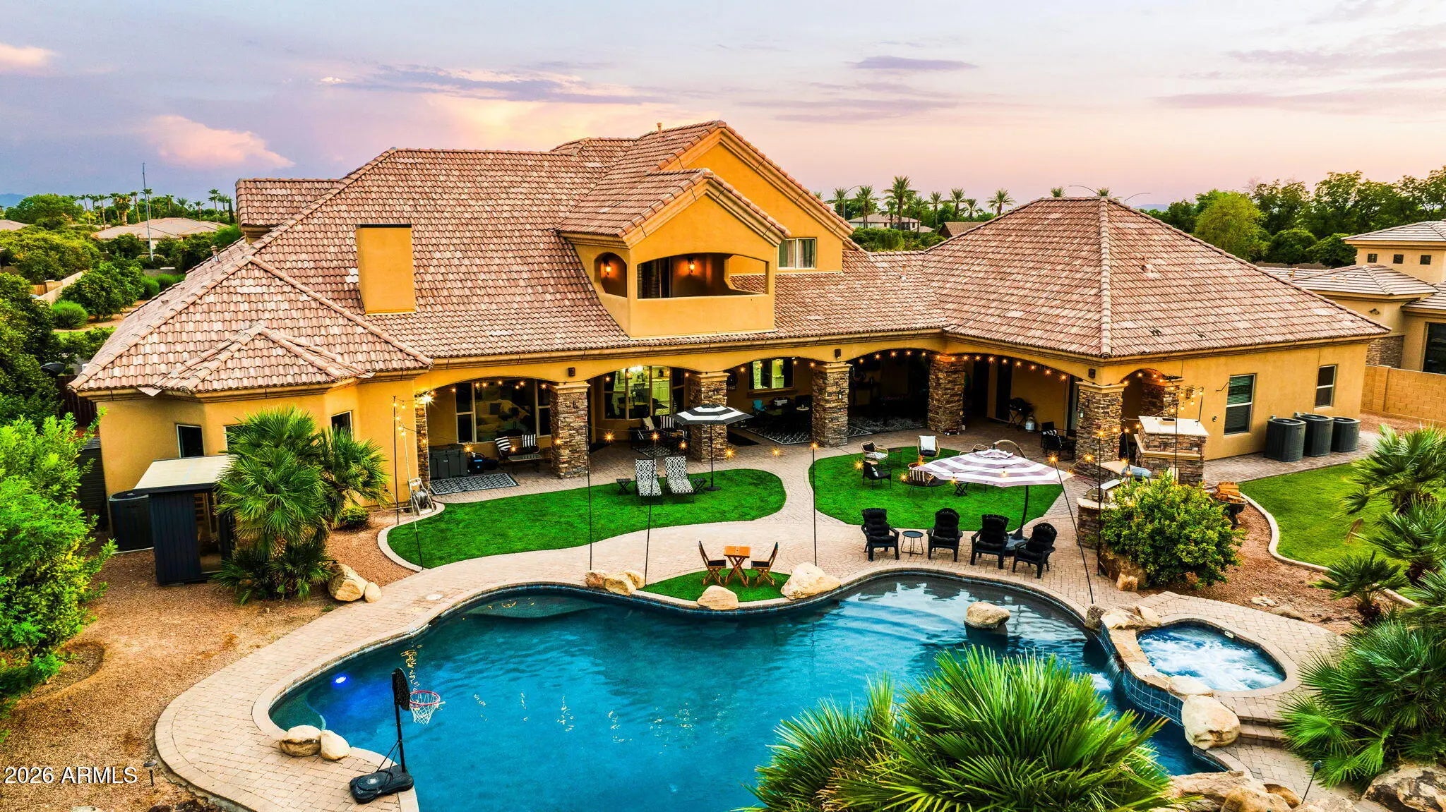 Located in the gated enclave of Hermosa Groves South, this exceptional Northeast Mesa estate offers rare scale, privacy, and resort-style living on a lush 0.66-acre greenbelt lot with no neighbors in front. A fully autonomous guest casita, complete with its own kitchen, private entry, and two-car garage providing ideal accommodations for multigenerational living or extended guests. The main residence features spacious bedrooms, multiple offices and flex spaces, soaring vaulted ceilings, and an open, flowing layout designed for both daily comfort and elegant entertaining. Recently refreshed in a striking black-and-white designer palette, the home boasts new interior paint, high-end flooring throughout, premium carpet in the primary suite and on the stairs, fully renovated bathrooms,and... ...a stunning marble primary bath with custom built-in closets. Additional upgrades include a built-in wine and liquor bar, updated electrical with new fixtures, outlets, and switches, and a newer smart HVAC system. Functional highlights include a generous laundry room, walk-in pantry, and a bedroom with private exterior access ,ideal for a home office or guest suite. Outdoors, the property becomes a private resort with a massive pool featuring waterfalls and a waterslide, spa, sauna, fire features, built-in BBQ, covered patios, misting system, and newly installed artificial turf, all surrounded by mature landscaping. A five-car garage and RV gate complete this exceptional offering. Ideally located near top Mesa schools and premier Northeast Mesa amenities, this statement home delivers luxury, versatility, and timeless appeal in a secure, gated setting. Outdoors, the property transforms into a private resort with a massive pool featuring waterfalls and a waterslide, spa, sauna, fire features, built-in BBQ, covered patios, misting system, and newly installed artificial turf, all surrounded by mature landscaping. A five-car garage plus RV gate completes this exceptional offering. Located near top Mesa schools and premier Northeast Mesa amenities, this is a statement home for buyers seeking luxury, versatility, and timeless appeal in a secure, gated setting.