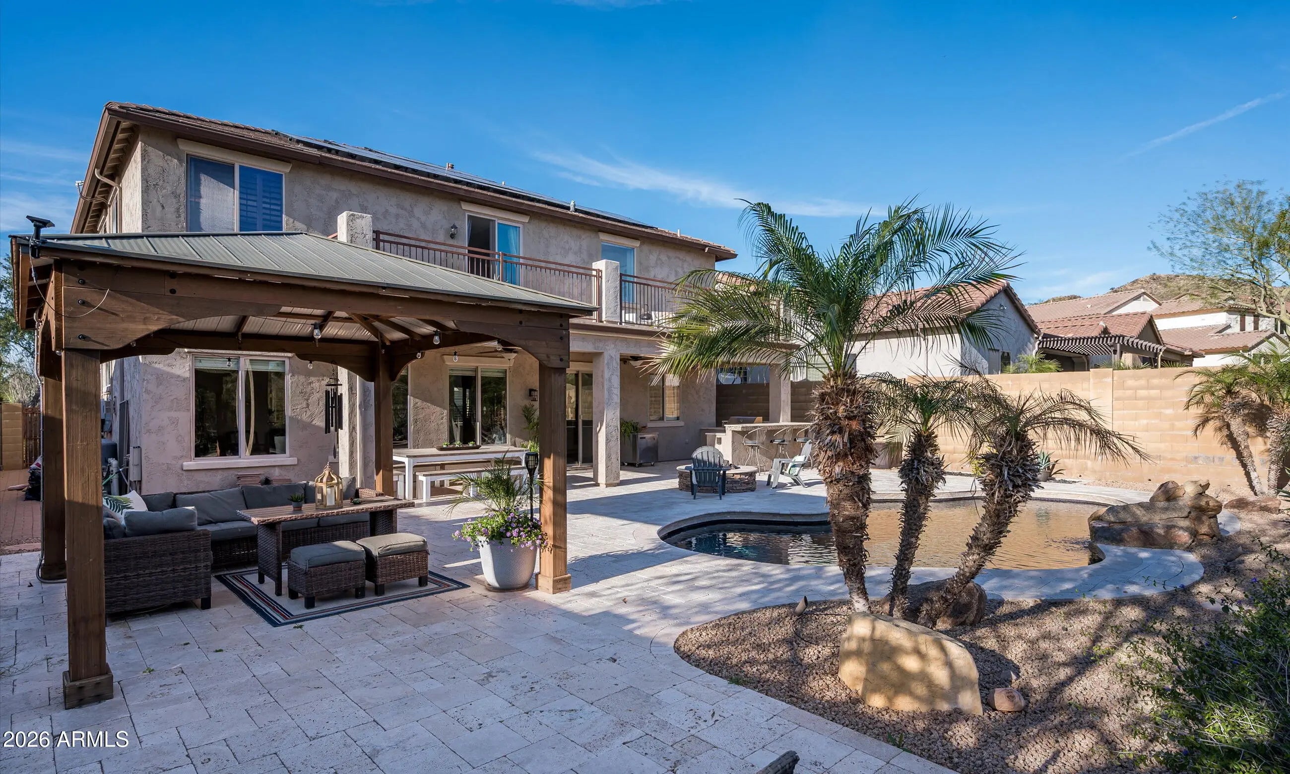 Welcome to one of the most desirable lots in Fireside at Norterra, where panoramic mountain views, privacy, and resort-style outdoor living come together. Perfectly positioned with no homes directly behind, this residence sits on a generously sized lot that delivers both space and serenity. The expansive backyard is designed for year-round Arizona living, featuring a sparkling pool, built-in BBQ, and a custom ramada that provides the ideal shaded retreat for entertaining or unwinding while taking in the surrounding desert landscape. Inside, the home offers a bright, refreshed aesthetic with a newly updated kitchen, including white-painted cabinetry complements the open great-room layout, perfect for gatherings large or small. 2 newer HVAC systems adds comfort and efficiency, while the paid-in-full solar system ($40,000 value) delivers long-term energy savings with no lease or payments. At Fireside at Norterra, residents enjoy access to award-winning amenities including community pools, fitness center, clubhouse, tennis and basketball courts, playgrounds, parks, and miles of scenic walking and biking trails, all set against the stunning Sonoran Desert backdrop. This is more than a home, it's a lifestyle upgrade combining privacy, views, energy efficiency, and one of North Phoenix's most sought-after communities.