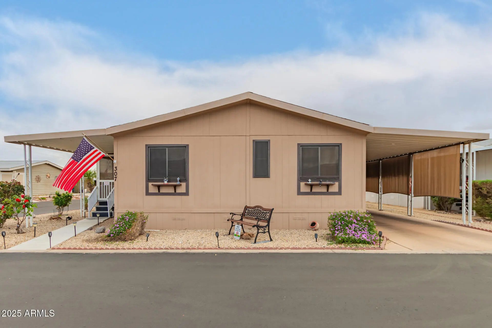 Welcome to this lovely single-story residence situated on a desirable corner lot in Surprise! Upon arrival, you will immediately notice a carport parking & a welcoming front porch that hints at the charm within. Enjoy the large great room featuring wood flooring, custom paint, and vaulted ceilings that add to the airy feel. The kitchen comes with plenty of cabinets, matching appliances, and a convenient breakfast bar. Have a good night's sleep in the perfectly sized primary bedroom, which provides a private bathroom with dual sinks. Secondary bedrooms include well-sized closets. A cozy back patio invites you to unwind under the stars. This unit also has a LARGE workshop/storage area. What are you waiting for? BRAND SPANKIN NEW ROOF!