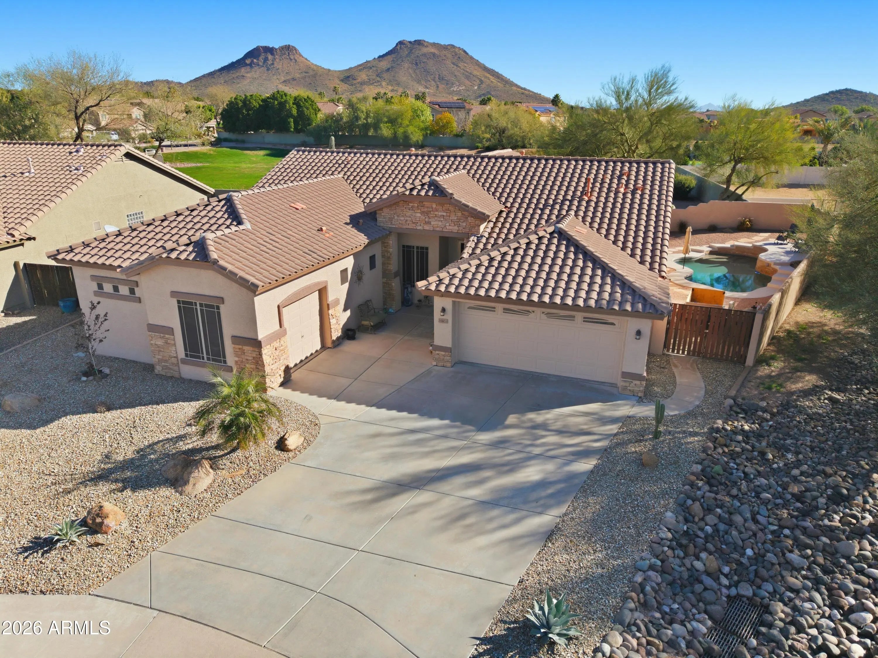 Simply GORGEOUS, This home has it all!!! Great curb appeal w/easy maintenance desert landscaping, RV Gate, Split 3 car garage, Pool. Interior offers an open floor plan, neutral wood-look tile flooring & plush carpet in all the right places, Media niche, electric fire place & surround sound. Kitchen boasts ss appliances, stove is gas, ample wood cabinetry, pantry, granite counters, recessed lighting, 2 Islands one featuring a breakfast bar. Master bedroom features an ensuite with separate tub/shower, dual granite sinks & walk-in closet. If you search for privacy while enjoying the comforts of your backyard oasis, this corner home backs to an open grass common area ( no one behind you). Pool backs to another common area wash. Oh! and let's not forget the built-in Bar BQ & Pizza Oven. This home is a MUST see NOW!!!