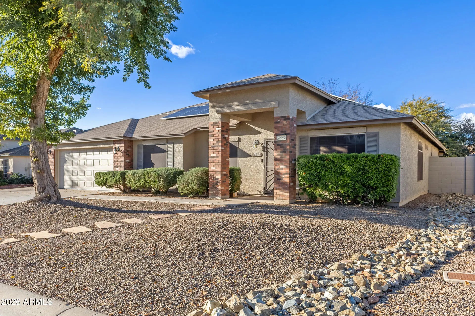 ***SO MANY UPGRADES*** Beautifully upgraded single-story home featuring 5 bedrooms and 3 full bathrooms with a desirable split floor plan. The spacious kitchen offers granite countertops, abundant cabinetry, center island, walk-in pantry, and RO system. Primary suite includes a private bath with separate tub and shower. Recent upgrades include new roof, owned solar panels, whole-home water filtration, upgraded electrical with new breaker panel, surge protector, and new outlets throughout. HVAC is 4 years old with sealed ductwork, and hot water heater is 1 year old. Enjoy the large covered patio, expansive paver pad, and epoxy-coated garage and patio. Three-car garage, double RV gates, and RV parking allowed.