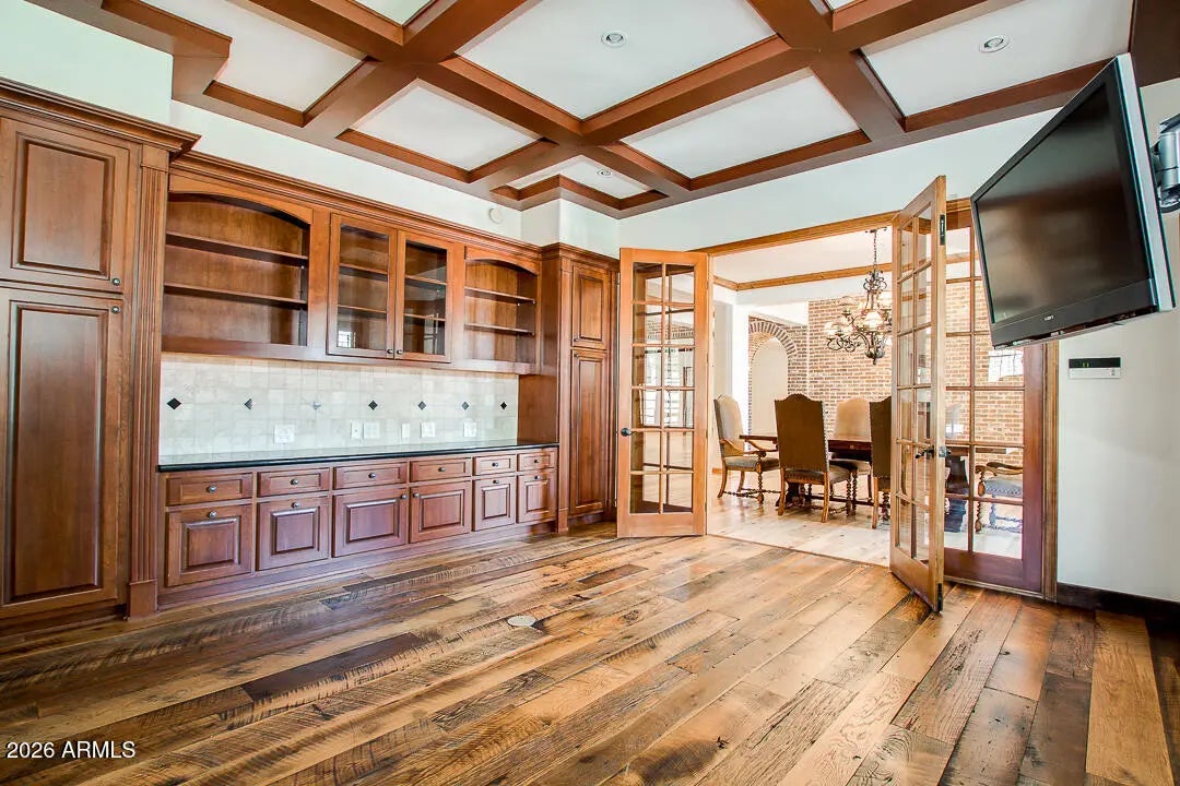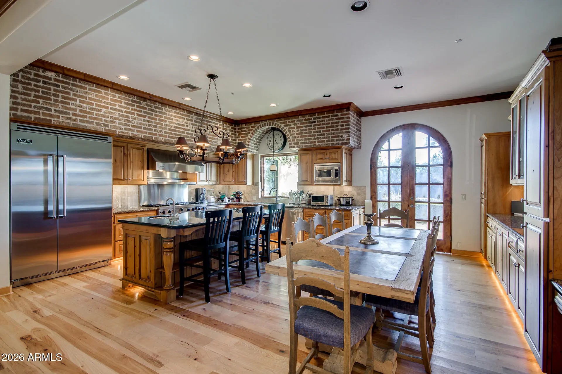 Private and Tranquil sprawling on a 51,762 square foot lot, gated estate through mangrove like drive. Spanish, Santa Barbara custom home architecture. Open and extremely functional floorplan with kitchen and larger and main living spaces all open to each other. The home features historically restored oak wood floors with floor to ceiling brick accent walls and expansive ceiling heights with polished wood and white crown molding and wood panel framing which add character and warmth to the home. The gourmet kitchen overlooking the home's front courtyard features a high-end commercial restaurant-style Viking appliance package with a gas cooktop, vent hood, and stainless steel fridge and freezer. A large kitchen island separates one of two eating and dining areas. Walk-in pantry off of the the kitchen and plenty of custom cabinets for storage with under-mount lighting. Secondary formal dining room, along with two different spaces that could be used for living or great rooms. Off of dining room flooring plan features a large den, executive office that could also be used for guest quarters or yoga room or game and media room. Master bedroom with floor to ceiling brickwork and crown moldings overlooks the massive backyard through large windows and has its own fireplace. French doors lead out of the bedroom to the backyard of the home. The master bathroom features, walk-in shower, soaking tub, private toilet stall, and two custom upgraded walk-in closets from California closets. The exterior and expansive and private outdoor living area features a resort-style pool and spa, an outdoor fireplace, barbecue area, and putting green and lush sprawling grass and trees for shade. The expansive wrap-around driveway takes you into a three-car epoxy garage with wood polished garage doors and windows in the garage doors for natural light.