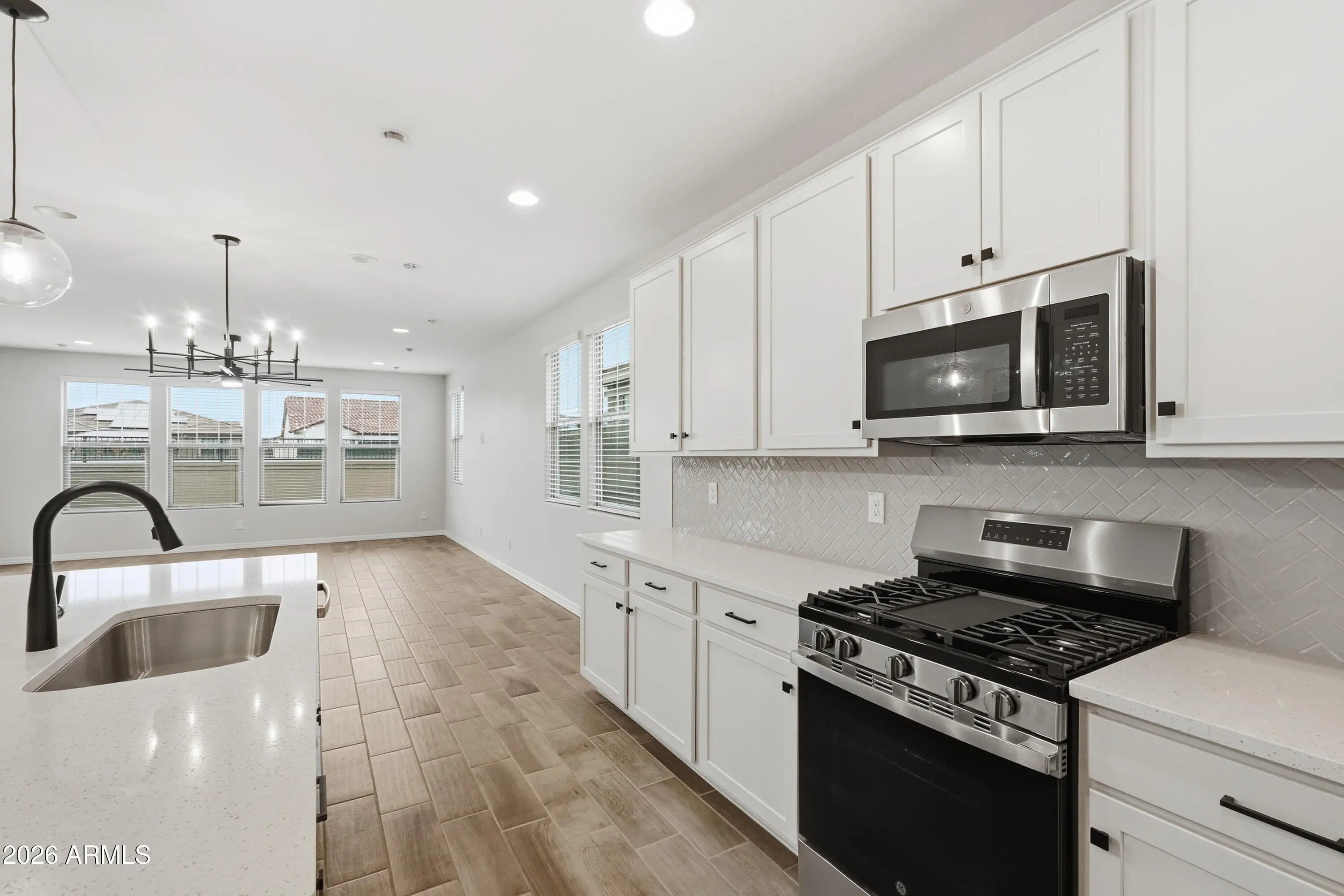 No Application Fees! Beautiful 4 bedroom, 2.5 bathroom San Tan Valley home located in the newer North Creek community. This spacious open floor plan features wood plank style tile flooring throughout all living and high traffic areas, two-tone neutral paint, upgraded doors and fixtures, and 2-inch faux wood window blinds throughout, with neutral carpeting in each bedroom. The large open living room flows seamlessly into the formal dining area and additional workspace, offering flexible living options. The upgraded kitchen is a standout, featuring granite countertops, dark tile backsplash, extended cabinet and countertop space, a large island with breakfast bar, separate walk-in pantry, gas range, and stainless steel appliances. The split floor plan includes a spacious primary suite with an oversized walk-in closet, separate linen storage, and a large step-in shower. Washing machine and dryer are included. The professionally landscaped backyard offers easy-to-maintain desert landscaping, synthetic grass, and no rear neighbors for added privacy. North Creek offers outstanding community amenities including a large resort-style pool, children's playground, pickleball courts, basketball courts, and expansive green spaces. Conveniently located near Hunt Highway, this home provides easy access to shopping, dining, schools, and outdoor recreation throughout San Tan Valley and Queen Creek. Enjoy a newer community feel with modern amenities and wide open desert surroundings. All Denali Real Estate residents are automatically enrolled in the Resident Benefits Package (RBP) for $55.00/month which includes Renter's Liability Insurance, Credit Building to help boost the resident's credit scores with timely rent payments, up to $1M Identity Theft Protection, HVAC air filter delivery (for applicable properties), our best-in-class resident rewards program, and much more!