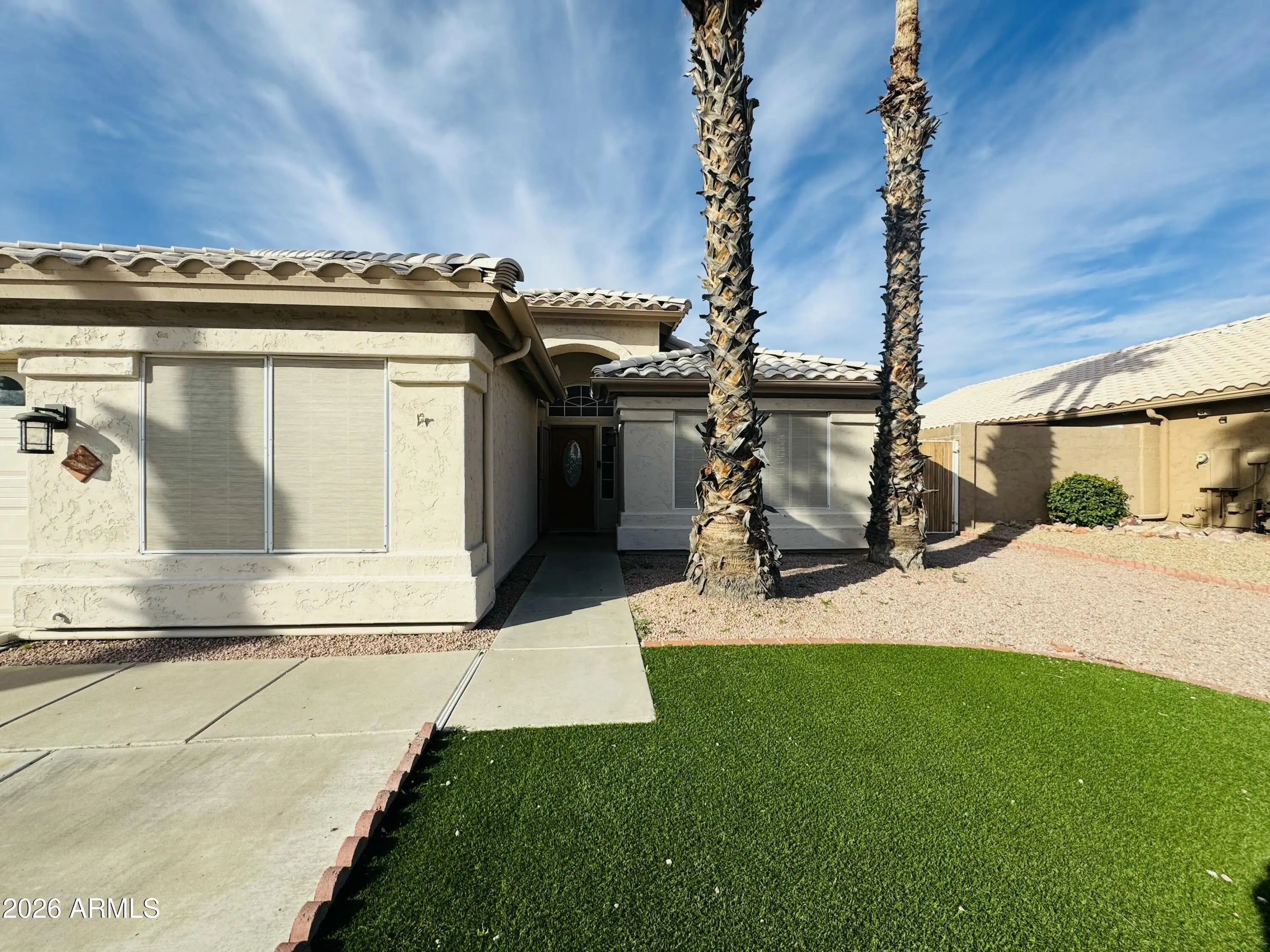 Owned solar panels!!! Beautiful Arrowhead Ranch home offering 2079 square feet of thoughtfully designed living space with soaring vaulted ceiling, 3 bedrooms and 2 full bathrooms with beautiful upgrades throughout. Enjoy a light-filled formal living and dining room plus a separate family room ideal for entertaining. The luxurious kitchen features new cabinetry, quartz countertops, a stunning waterfall island, stainless steel appliances, walk-in pantry, and stylish LVT flooring that flows throughout the home. Bathroom are finished with elegant porcelain tiles for a clean and modern look. The spacious primary suite includes marble vanity tops with dual sinks, separate soaking tub, walk-in shower and a generous walk in closet. A double-door den provides the perfect home office, along with a bonus room that can serve as a fourth bedroom, playroom, or flexible living space. Step outside to your private backyard complete with a sparkling pool, low maintenance synthetic grass, and BBQ space for outdoor entertaining. Excellent location with 2 car garage, attractive low-maintenance synthetic grass in the front yard and mature palm trees enhancing curve appeal. Conveniently located with easy access to Loop 101, making commuting a breeze. Easy to show.