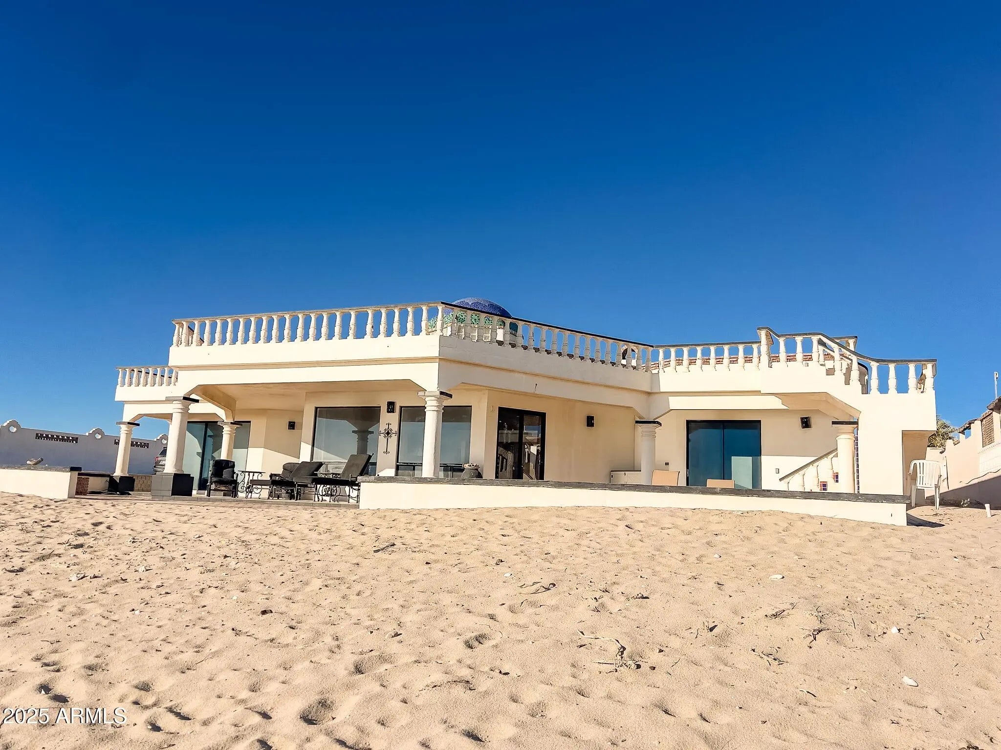 Discover one of Playa Encanto's most impressive beachfront opportunities, set directly beside the iconic Sand Castle House and positioned on an exceptionally large oceanfront lot that offers remarkable space, privacy, and flexibility for future additions or construction. This 5-bed, 5.5-bath residence showcases sweeping Sea of Cortez views, a generous kitchen with a large island that opens to the living area, and stunning boveda ceilings that enhance the home's character. A private courtyard leads to the main entrance and includes an additional bedroom with its own access, plus a 2-car garage for secure parking and storage. This rare property combines incredible land size, expansive coastal frontage, and unlimited potential Discover one of Playa Encanto's most impressive beachfront opportunities, set directly beside the iconic Sand Castle House and positioned on an exceptionally large oceanfront lot that offers remarkable space, privacy, and flexibility for future additions or construction. This 5-bed, 5.5-bath residence showcases sweeping Sea of Cortez views, a generous kitchen with a large island that opens to the living area, and stunning boveda ceilings that enhance the home's character. A private courtyard leads to the main entrance and includes an additional bedroom with its own access, plus a 2-car garage for secure parking and storage. This rare property combines incredible land size, expansive coastal frontage, and unlimited potential. This remarkable property offering blends coastal living, privacy, and versatility with a thoughtful layout designed for comfort and hosting. It offers a welcoming gated courtyard that creates a secure, private transition into the home and provides additional outdoor space for relaxing or entertaining. The 2-car garage offers excellent storage for vehicles, side-by-sides, beach gear, or tools, an essential asset in this location. Inside, the home centers around a large kitchen with a generous island, opening directly into the living and dining areas. High ceilings and natural light make the space feel open and inviting, while the home's beautiful boveda ceilings add architectural detail and authentic coastal character, including a beehive fireplace. One of the most impressive attributes of this property is its direct beachfront position. With the Sea of Cortez just steps away, you can enjoy panoramic ocean views, sea breezes, and effortless beach access for kayaking, fishing, paddleboarding, or simply relaxing by the water. The property sits on a huge oceanfront lot, offering a level of space rarely found in Playa Encanto. Whether you envision expanding outdoor living areas, adding more garage space, building a guest casita, creating a pool area, or even constructing an additional home, the potential here is extraordinary. In addition to its size and location, the home offers a significant advantage: it is fully off the grid, powered by its own efficient solar power system designed to meet the property's daily electrical needs. A robust backup battery bank ensures uninterrupted operation, and a Generac generator provides an additional emergency power source, ideal for peace of mind and reliability in this coastal environment. This combination delivers energy independence and lower operating costs while maintaining all the comforts of modern living. Whether used as a full-time residence, vacation home, or investment property, this beachfront estate offers flexibility, privacy, and unmatched room to grow. With its expansive lot, ocean frontage, architectural charm, guest accommodations, and complete off-grid power system, this is a one-of-a-kind opportunity in Playa Encanto's most desirable section of beach.