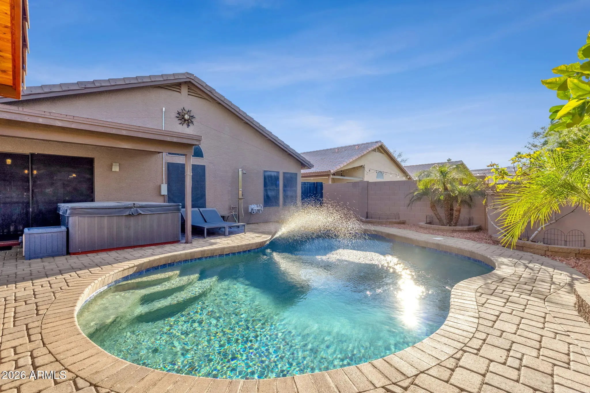 Arizona living at its finest with this backyard oasis. Spend your weekends outside with a covered Gazebo, featuring a mini drink fridge, Grill, misters and beautiful outdoor furniture. Hang a TV on the preinstalled outdoor Wall Mount. Backyard features a pool, hot tub and large childrens play house or small studio. Home features faulted ceilings, neutral paint throughout, front formal living and dining, back open kitchen to family room and fire place. Garage has Epoxy flooring and plenty of storage. Unlimited fresh and yummy drinking water brought to you by a high end Reverse Osmosis and salt water system. Rent includes pool and landscaping maintenance!