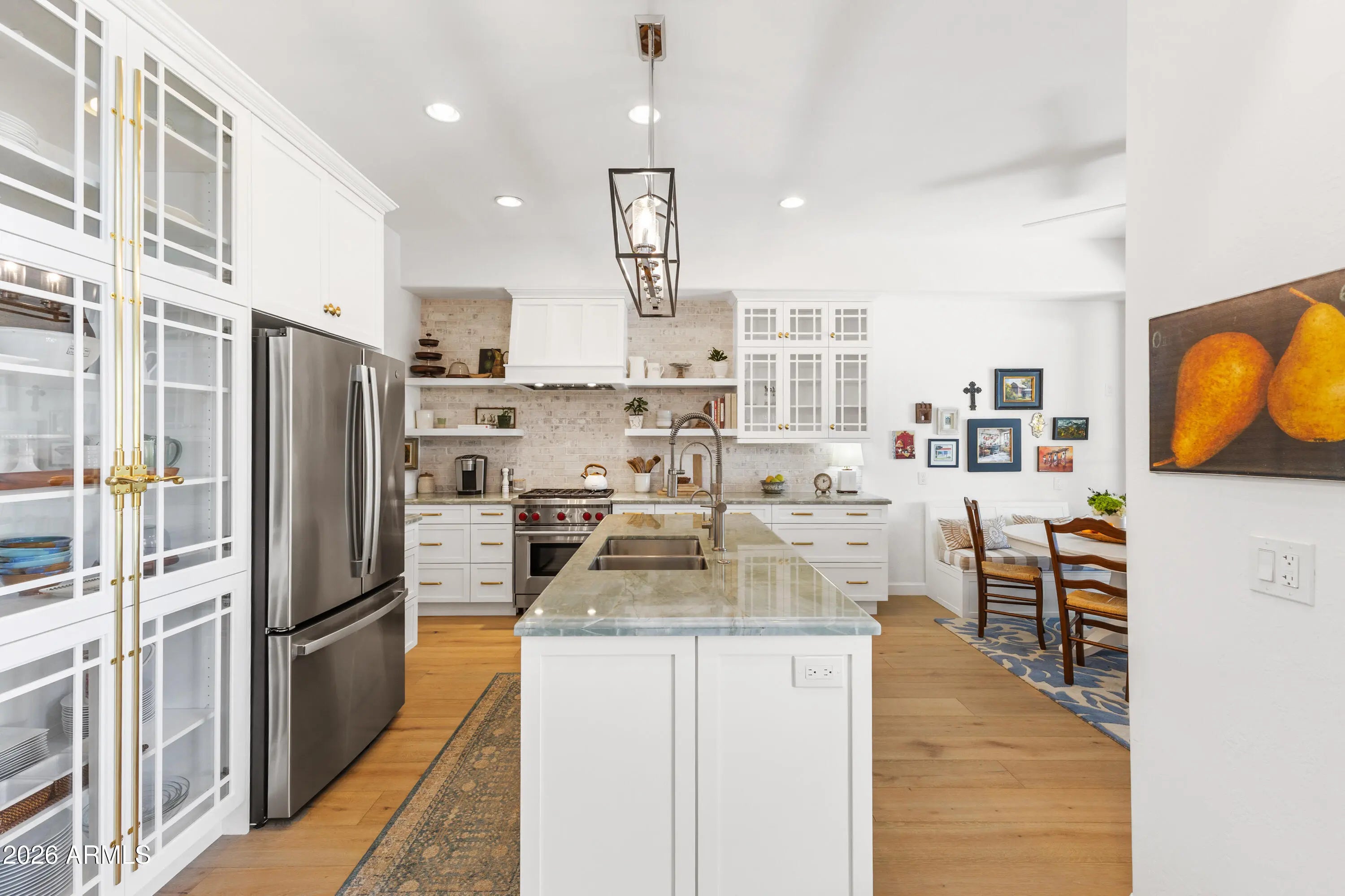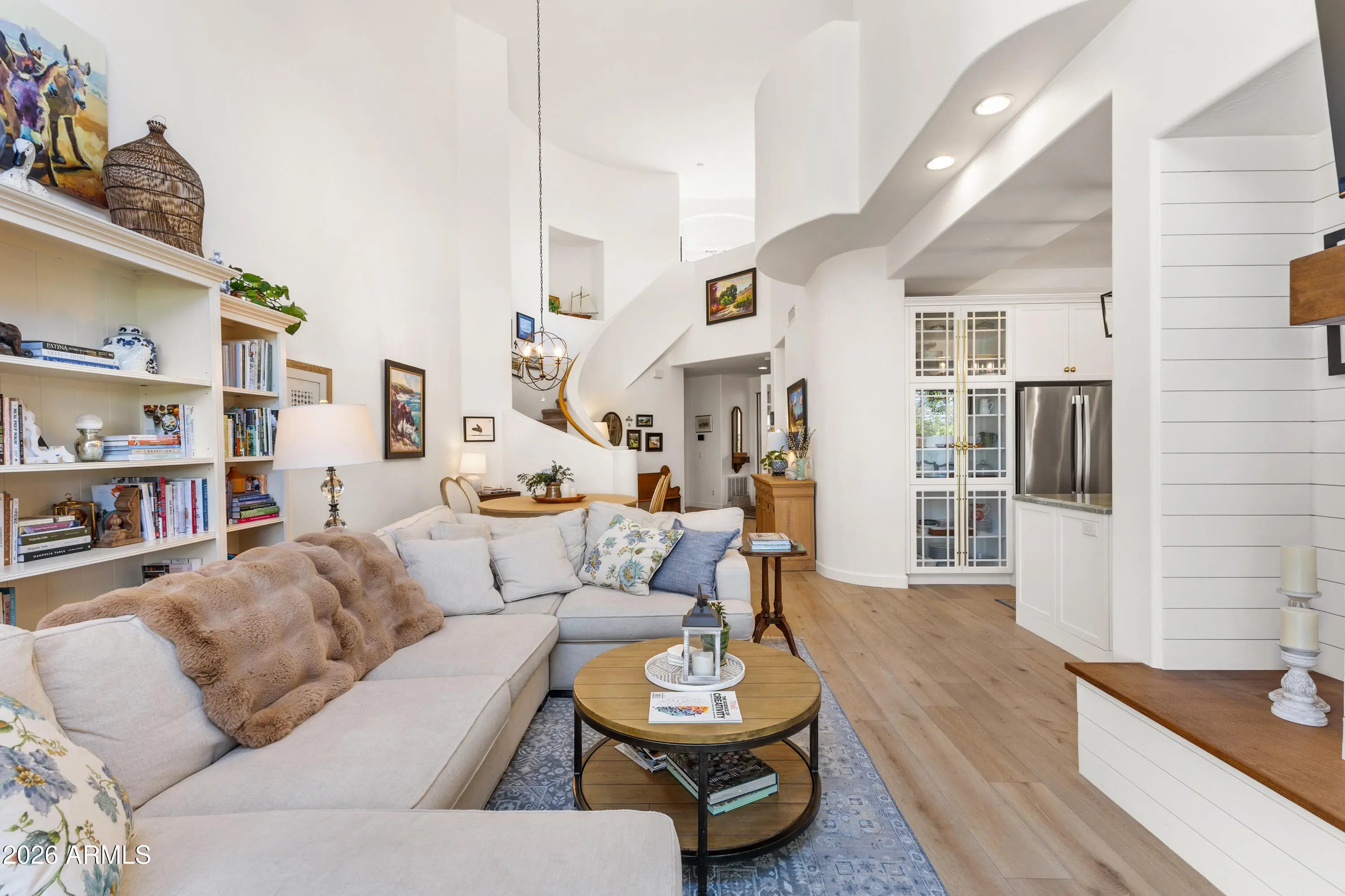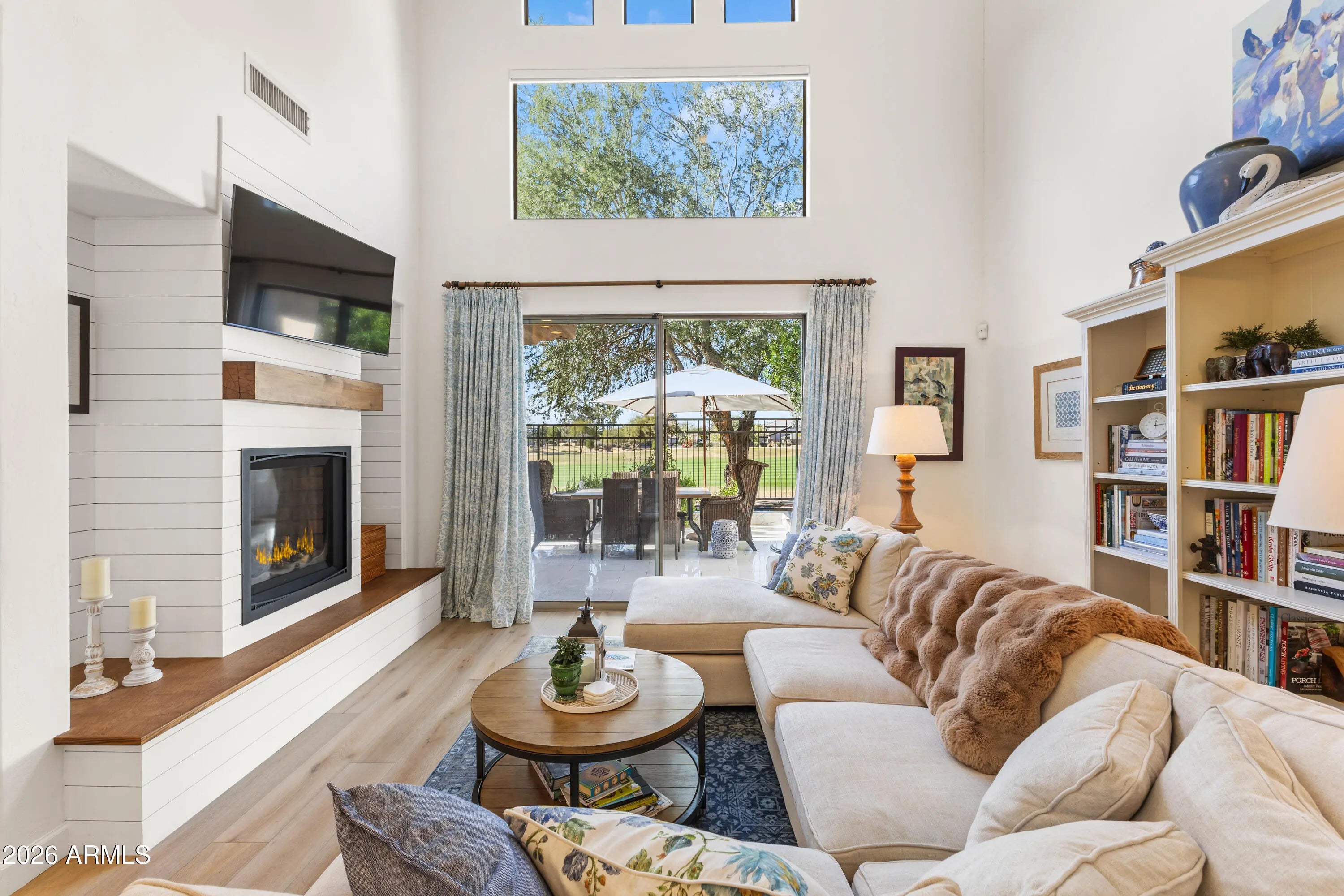 Situated on the golf course in the coveted Kierland Heritage community, this extensively updated home offers an open, light-filled floor plan with soaring ceilings throughout. The completely remodeled kitchen is a true centerpiece, featuring custom white cabinetry with glass-front uppers, an oversized island with quartzite countertops, open shelving, upgraded appliances, and refined finishes throughout—perfectly blending timeless design with modern convenience. French grey wood flooring runs through the main living areas, adding warmth and continuity to the space. The great room is anchored by a gas fireplace with a reclaimed wood mantel, creating a cozy yet sophisticated focal point, while expansive sliders open to the fully remodeled back patio—an inviting outdoor retreat with sweeping golf course views, ideal for relaxing or hosting guests. The spacious primary suite offers a peaceful escape with a private balcony overlooking the fairway, generous closet space enhanced by custom Classy Closets systems, and a well-appointed bath. Washer/dryer hookups are located in the primary closet for added convenience. Additional improvements include Hunter Douglas electronic blinds, a whole-house water softener, a new vanity in the downstairs bathroom, and an updated downstairs shower. Residents enjoy access to a community heated pool, spa, and BBQ area, all just moments from the Westin Kierland Resort, championship golf, and the premier shopping and dining destinations of Kierland Commons and Scottsdale Quarter. A true blend of resort-style living and urban convenience in one of Scottsdale's most desirable locations.