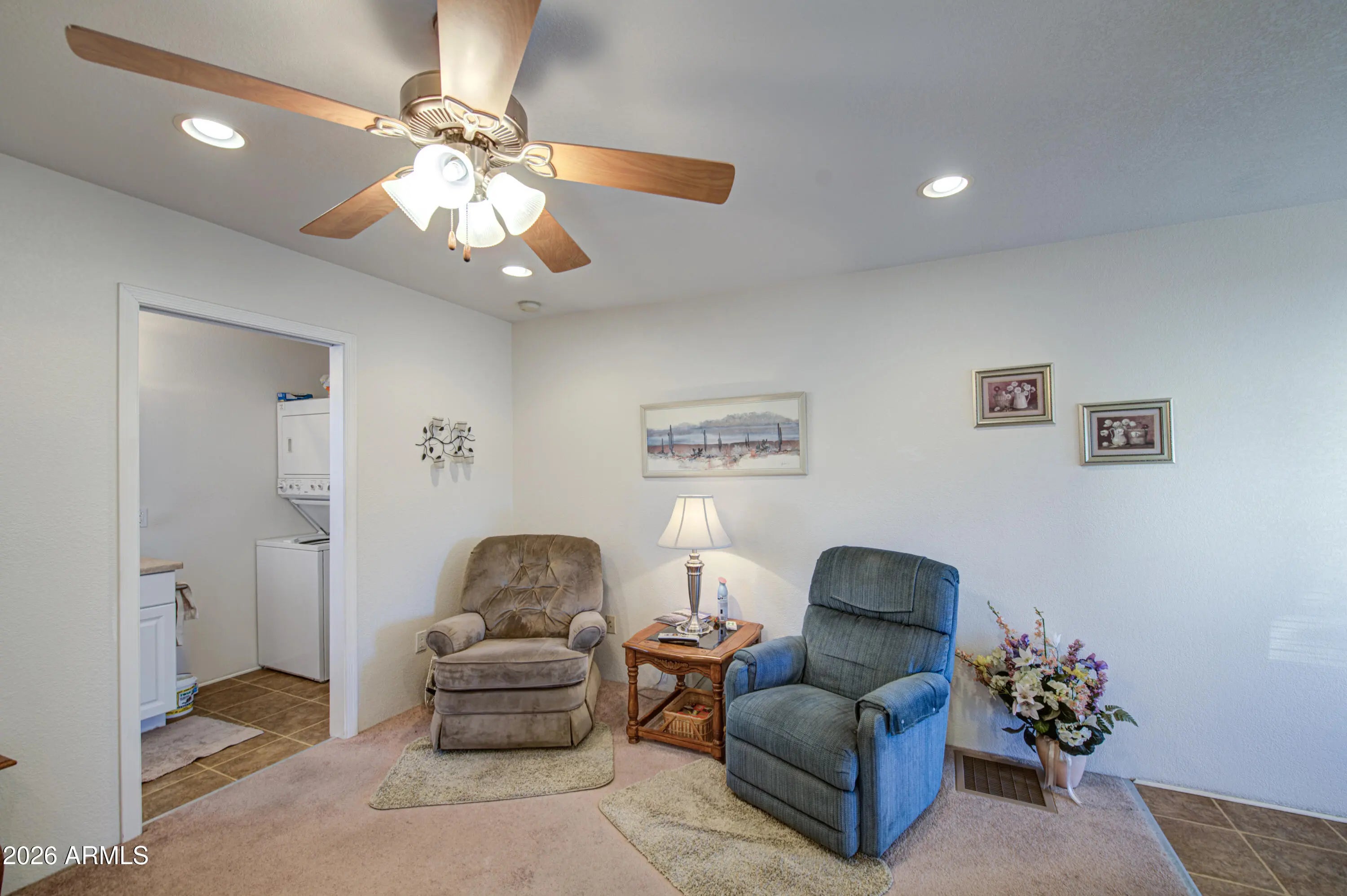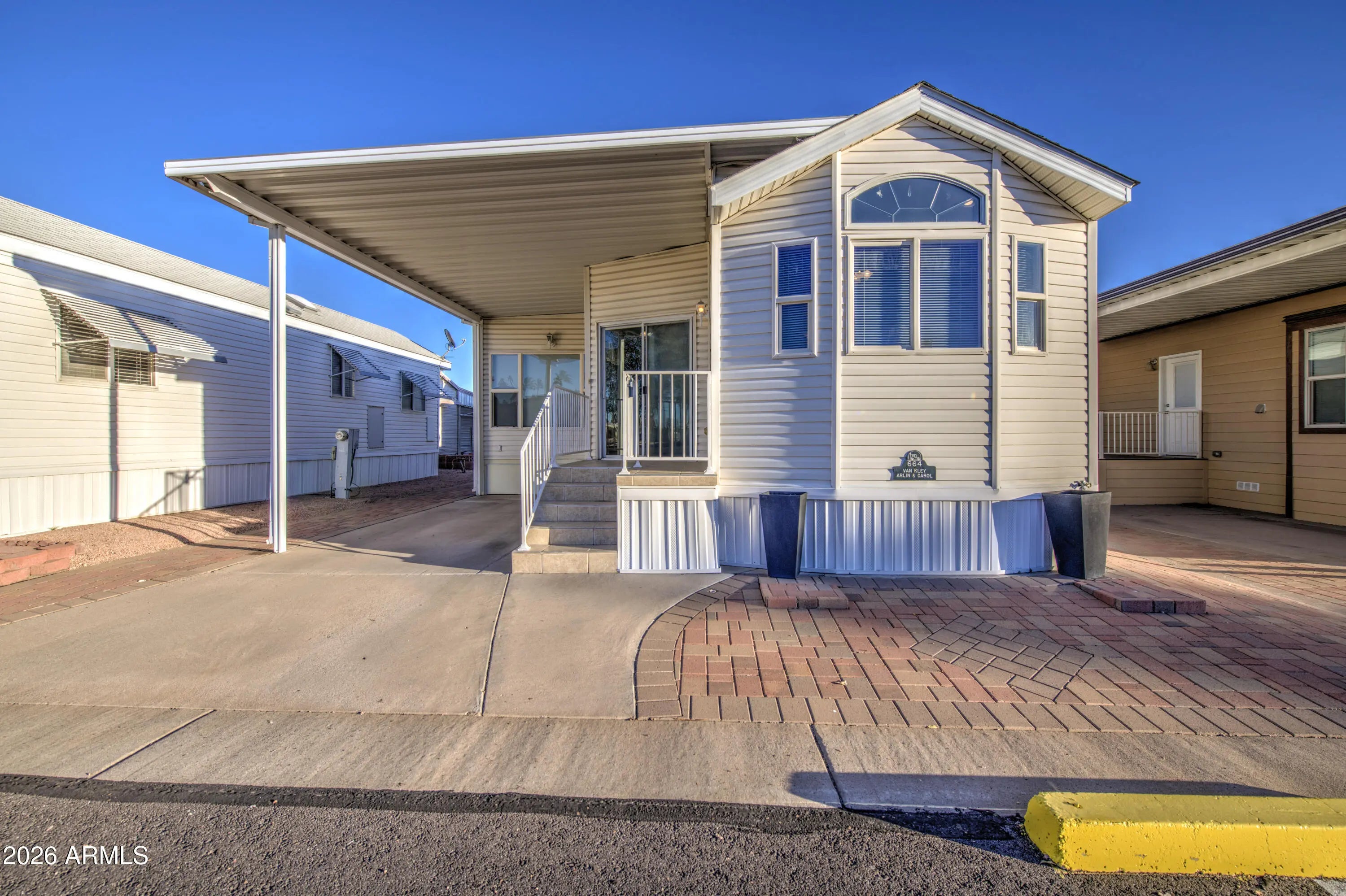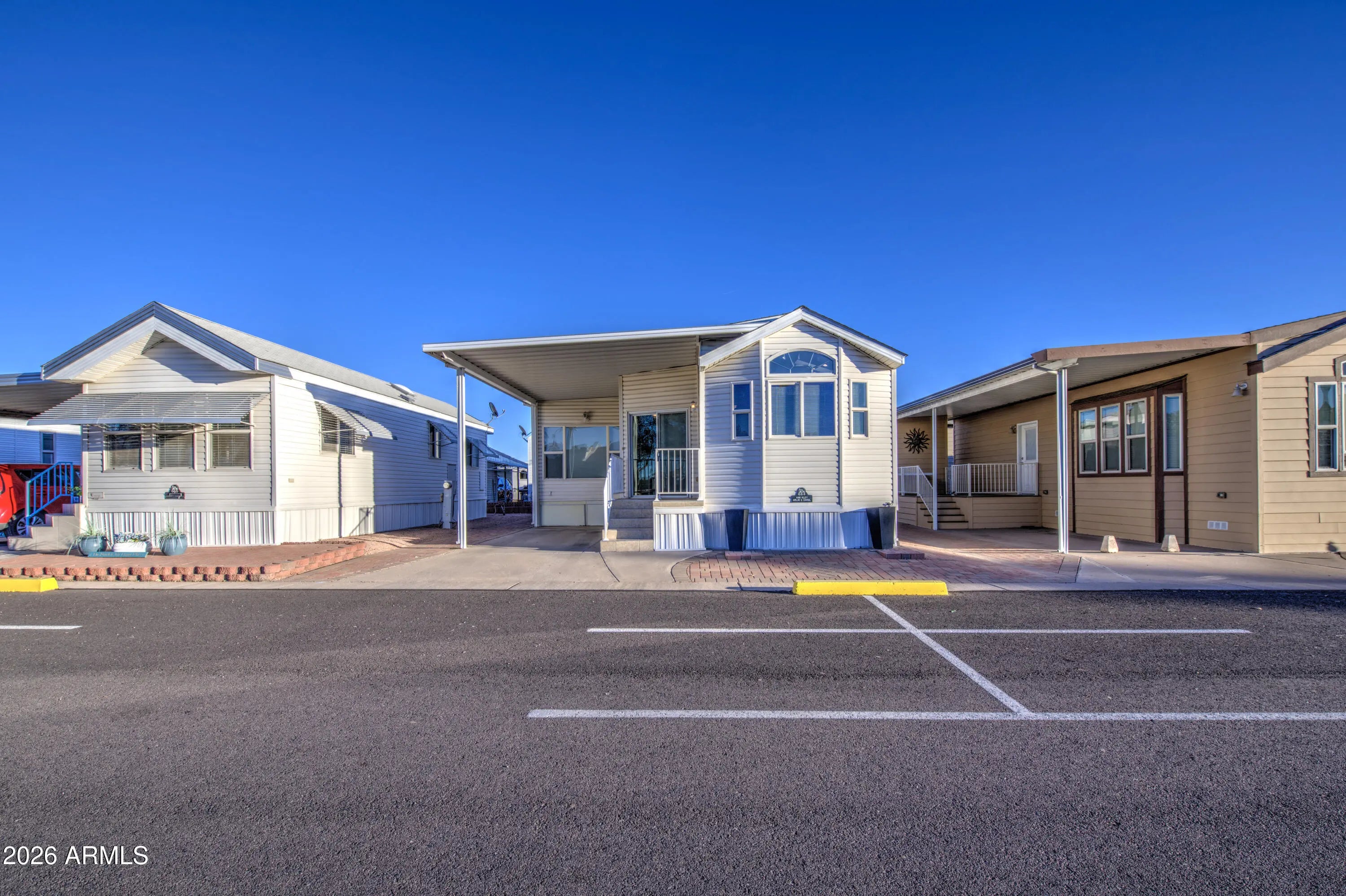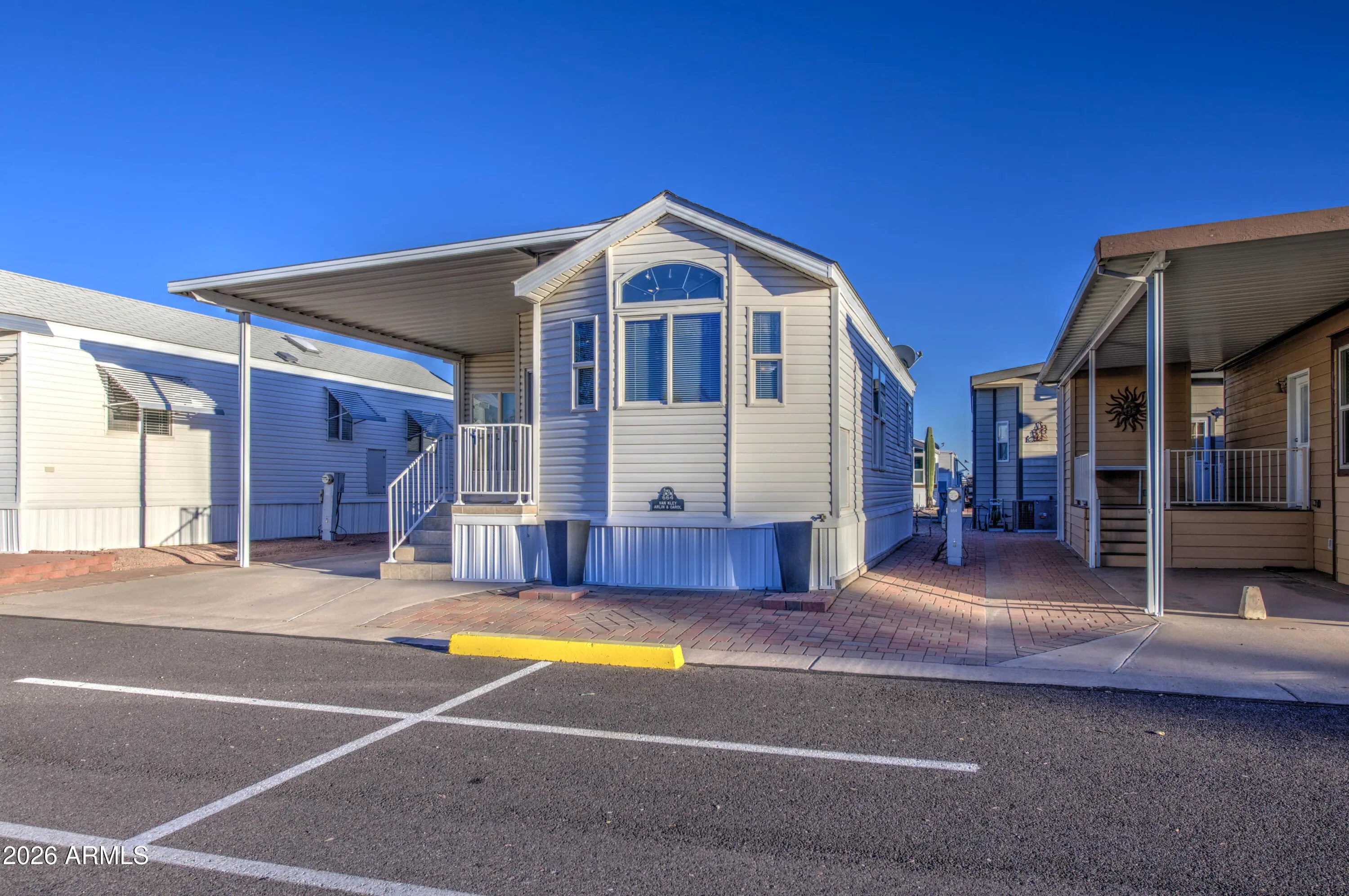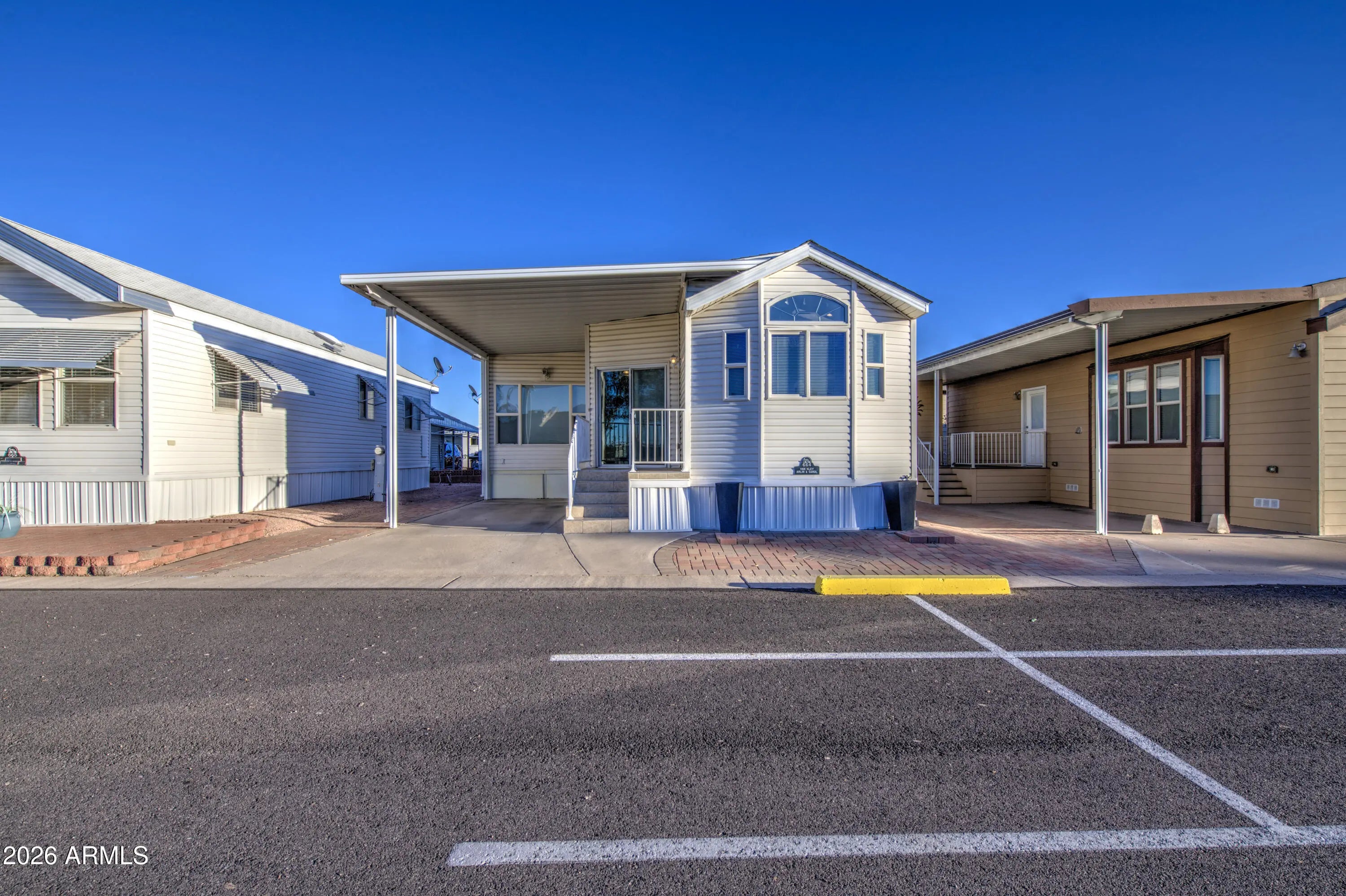 This is an awesome northwest facing newer park model with an Arizona room in Carriage Manor Resort, a premier 55+ Community where you OWN THE LAND! Location, location, location. This home is just steps away from the clubhouse. It has pavers all the way around the house so no need to worry about weeds. It has vinyl siding and skylights to brighten the inside. This home comes with a front kitchen and a bath and a half and a stackable washer and dryer inside the home. It had a new water tank installed in 2024. Carriage Manor has 24/7 on site security, a heated SALTWATER pool/spa, fitness facility, Tennis, Pickleball, Bocce, Shuffleboard, Golf Club, Billiards, Lapidary/Silversmith, Ceramics, Glass Art, Sewing, Wood shop, Bingo, Dances parties & many more activities & amenities
