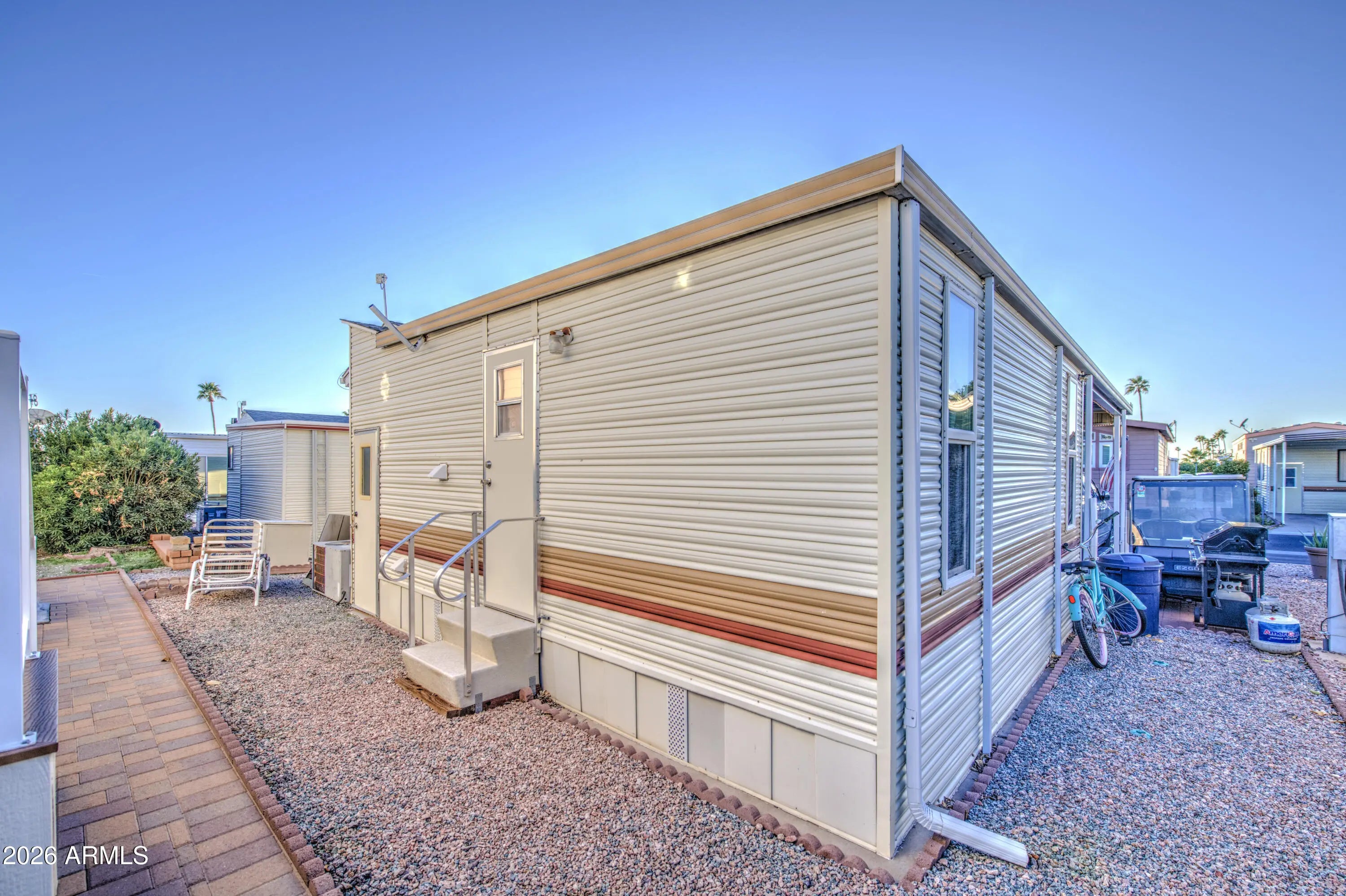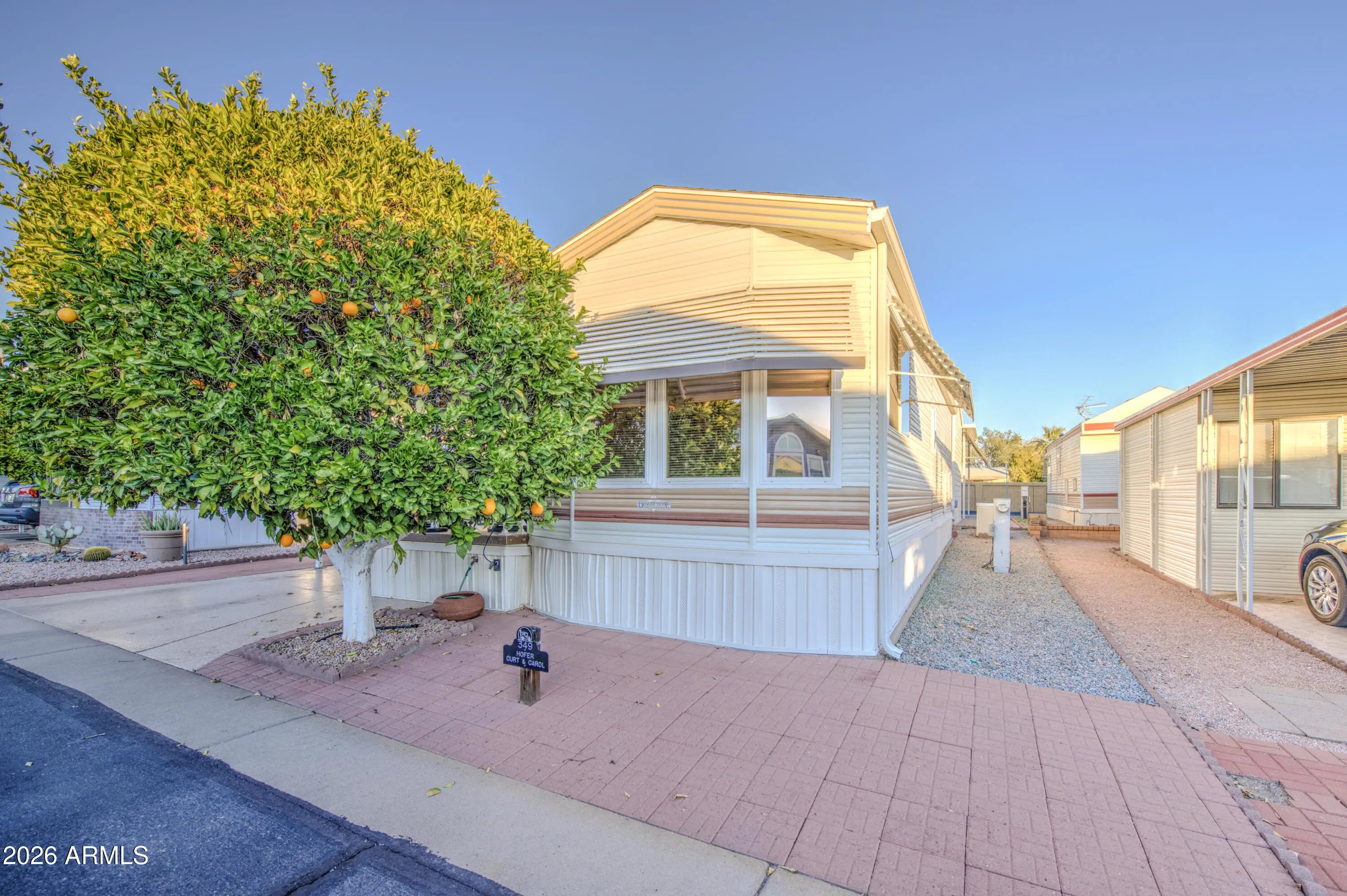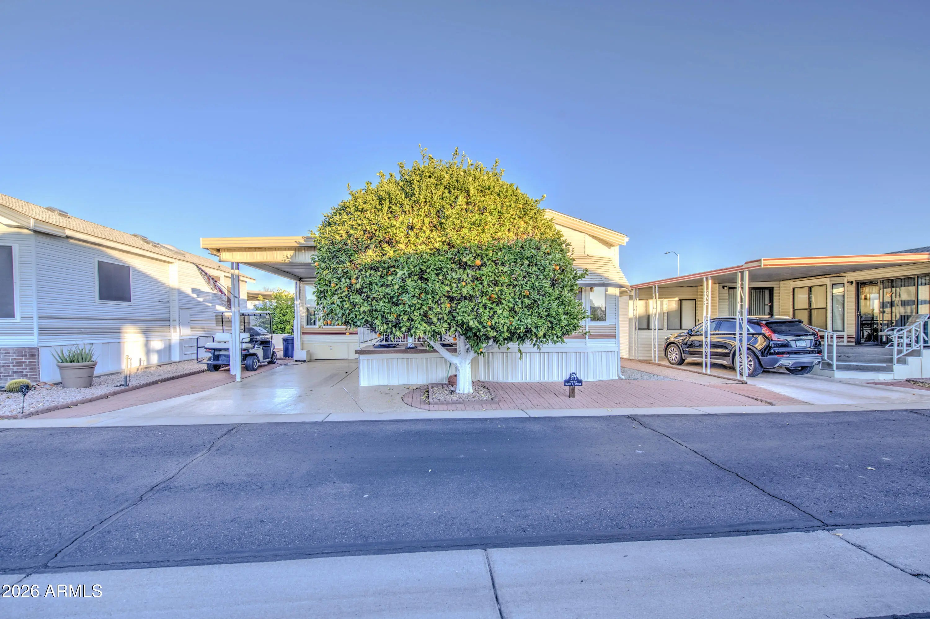 This is a beautiful west facing park model with an Arizona room in Carriage Manor Resort, a premier 55+ Community where you OWN THE LAND! Enjoy sitting on the large deck in the evening and watching the sun set. Large orange tree in front of the home and pavers on the side to park the golf cart that is included with the sale. Outside you have 5 large storage drawers. This home that has dual paned windows also comes completely furnished with new stackable front load washer and dryer in the 2nd bath. Hot water tank only 2 yrs old. Carriage Manor has 24/7 on site security, a heated SALTWATER pool/spa, fitness facility, Tennis, Pickleball, Bocce, Shuffleboard, Golf Club, Billiards, Lapidary/Silversmith, Ceramics, Glass Art, Sewing, Wood shop, Bingo, Dances parties & many more activities & amenities.