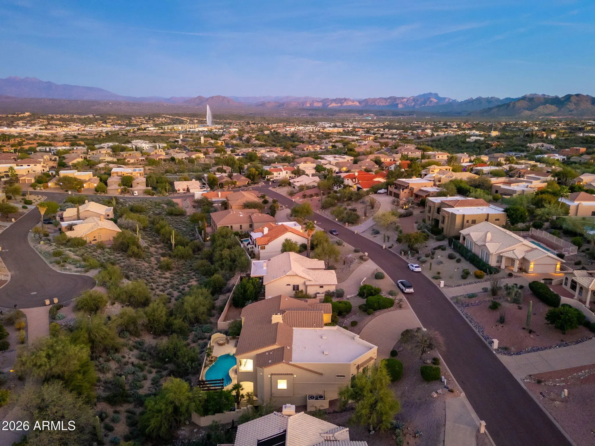 Completely reimagined from top to bottom, this stunning Fountain Hills residence offers resort-style living with breathtaking mountain and fountain views in one of the town's most desirable central locations. Set on over a third of an acre, this custom home blends sophisticated design, luxurious finishes, and exceptional indoor-outdoor living across two expansive levels. The main living level is designed to capture the views, featuring a bright, open great room, two ensuite bedrooms, and a beautifully updated chef's kitchen anchored by an impressive 11-foot Taj Mahal porcelain island. The kitchen showcases new custom whitewashed alder cabinetry, high-end Thermador appliances, touchless faucet, and elegant champagne brushed gold fixtures. Just beyond, a spectacular oversized butler's pantry / prep kitchen with sink, coffee bar, quartzite counters, appliance shelving, and built-in outlets elevates everyday living and entertaining alike. A generously sized laundry room with additional refrigerator adds even more functionality. New 2'x4' porcelain tile flows throughout the home, complemented by fresh interior and exterior paint, upgraded lighting, new 5¼" baseboards, and beautifully remodeled baths featuring Taj Mahal porcelain countertops, new sinks, and TOTO bidet washlets. The lower level offers a spacious family room with fireplace and wet bar, a dedicated theater room, and a fourth bedroom with egress window perfect for guests, a home gym, or office. Step outside to true desert resort living: a fully refinished saltwater pool with new PebbleTec and tile, a swim-up bar, shaded ramada, fire pit with banco seating, and two expansive balconies. The upper deck has been extended with new tile to create the perfect vantage point for enjoying the iconic four peaks and Fountain Hills fountain views. A rare opportunity to own a fully remodeled, turnkey home in the heart of Fountain Hills with breathtaking views and beautiful living spaces throughout!