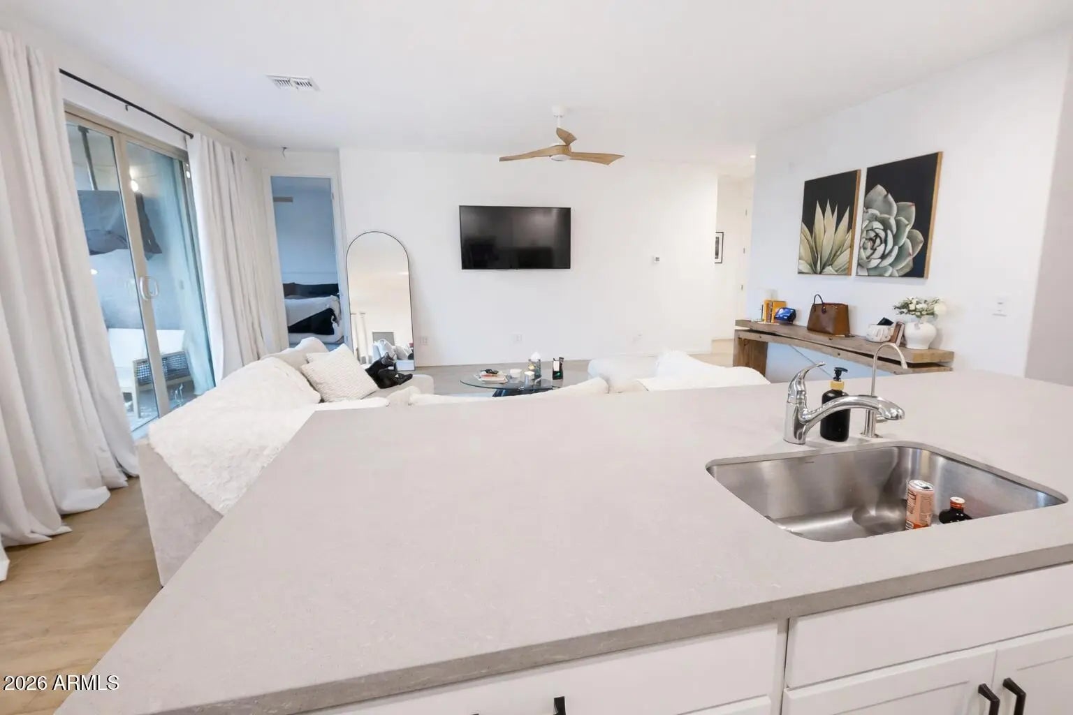 Beautifully upgraded 3-bedroom, 2-bath home with an open floorplan. The great room flows seamlessly into the kitchen and dining area, featuring white cabinetry, Quartz, pull-out shelves in the drawers, ample storage, and contemporary finishes, perfect for entertaining and everyday comfort. The spacious primary suite offers has a beautiful custom walk-in closet, walk in shower, and dual sinks. Secondary bedrooms are well-sized and versatile for guests, home office, or fitness space. Window coverings and ceiling fans throughout add comfort and efficiency. Enjoy upgraded water quality with a water softener and reverse osmosis system. Step outside to a low-maintenance backyard featuring synthetic grass, automatic underground irrigation, and a mature citrus tree already producing lemon