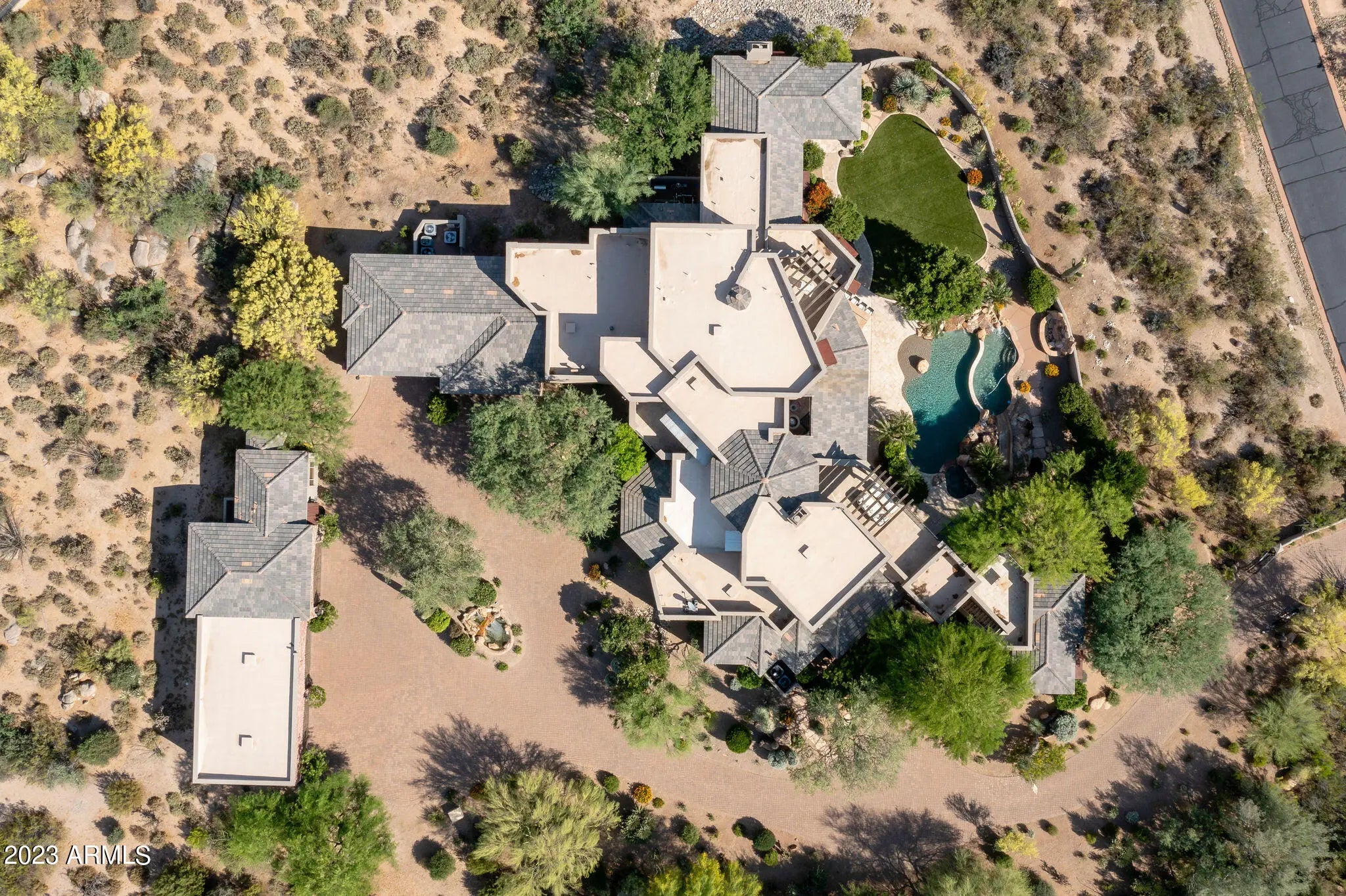 Redesigned in 2020 for primarily single-level living, this fully furnished estate features light-filled interiors and seamless indoor-outdoor flow with resort-style outdoor spaces, pool, spa, and sweeping valley and city-light views. The main level blends open gathering areas with private rooms for work, media, and relaxation, while a secondary primary suite, den, and game room upstairs offer flexibility for guests or multi generational living. Set on 3.8 acres within a gated community and bordered to the north by 11 acres of HOA-owned open land, the property offers exceptional privacy and scale. A private one-bedroom casita, detached 1,815-sf auxiliary building, and 10-car garage complete the estate embracing expansive desert valley views. The kitchen blends refined design with high performance, anchored by a curated appliance suite and a 200-bottle, glass-walled, temperature-controlled wine cellar that becomes part of the architecture. A linear gas fireplace wrapped in natural stone adds a sculptural focal point, elevating both everyday living and evening entertaining. Designed for hosting, the media room features custom cabinetry and a sleek bar topped with a waterfall quartzite countertop that invites conversation. Glass sliders open directly to the infinity-edge pool and spa, creating a seamless indoor-outdoor connection. Two dedicated offices or dens further support today's work-from-home lifestyle and multigenerational flexibility. The residence offers a total of six ensuite bedrooms, with a seventh flexible-use room discreetly positioned beyond the media room, ideal as a guest suite, wellness room, or private retreat. Fully furnished and ready to enjoy, this estate embraces the views and lifestyle that define North Scottsdale.