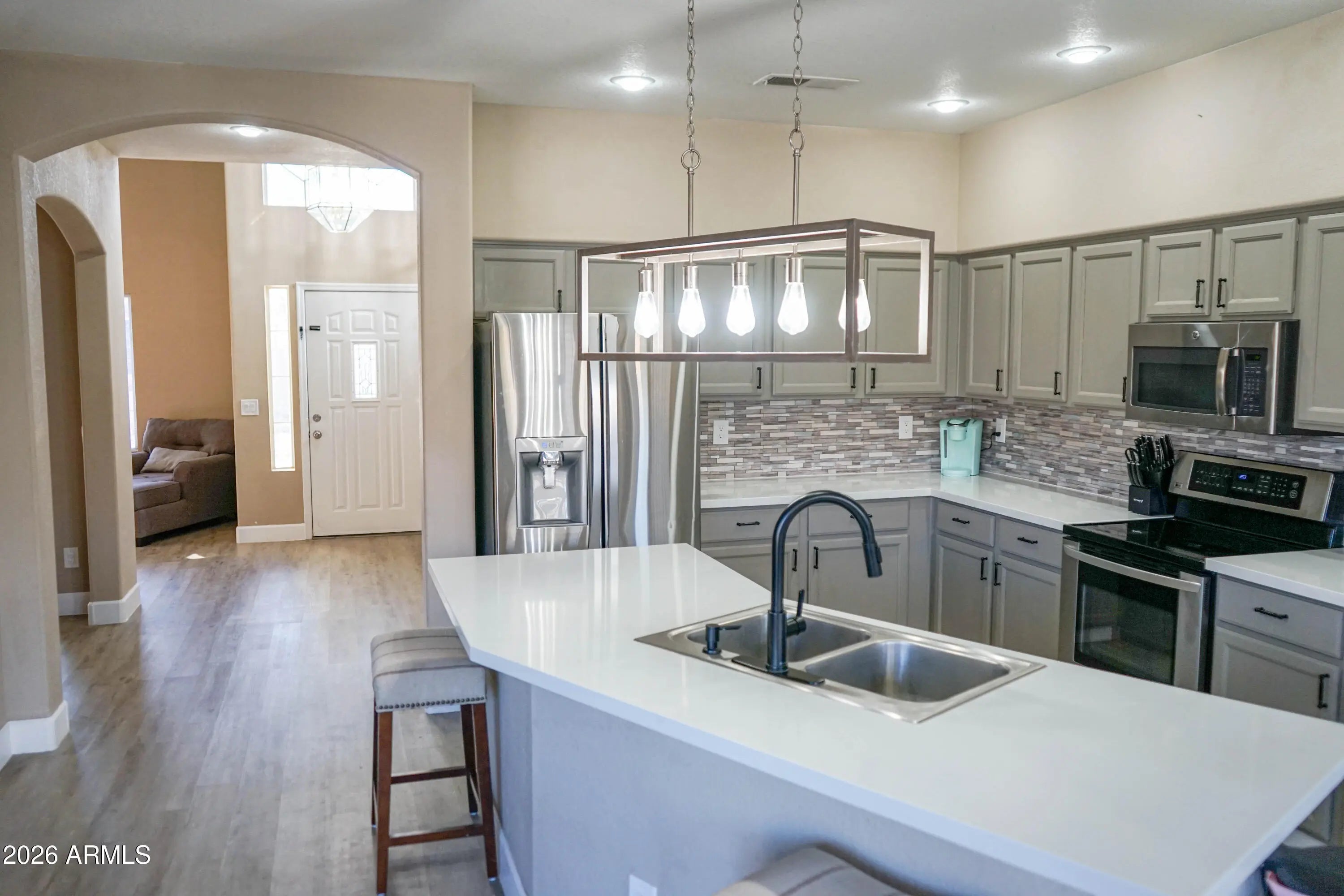 Step into comfort, style, and peace of mind in this beautifully updated two-level home. With a newer roof and A/C already in place, you can settle in knowing the big things are done. Inside, the home welcomes you with a warm, neutral palette, wood-look flooring, graceful arched doorways, and a cozy fireplace—perfect for relaxed evenings and meaningful moments. The heart of the home is the updated kitchen, where quartz countertops, abundant cabinetry, recessed lighting, a pantry, mosaic backsplash, black stainless-steel appliances, and a generous center island come together to create a space made for gathering, cooking, and connection. The spacious primary retreat feels like a true escape, privately set behind double doors and featuring a walk-in closet and an ensuite bath with dual sinks. ideal for morning coffee, evening relaxation, or casual outdoor dining. This home is move-in ready and truly checks all the boxesdon't miss it.