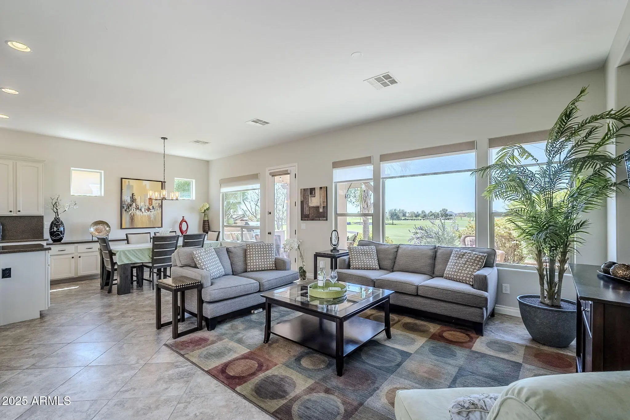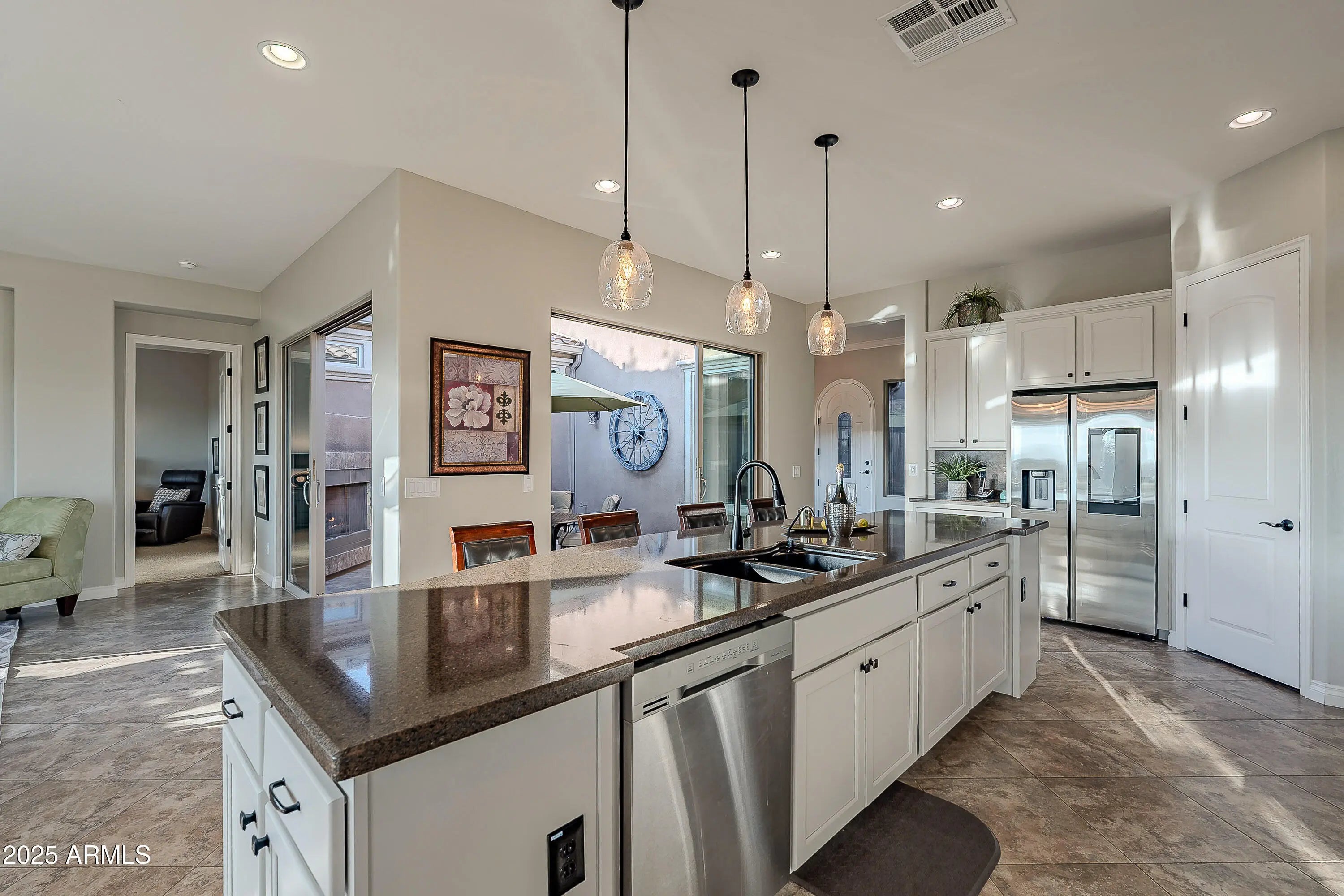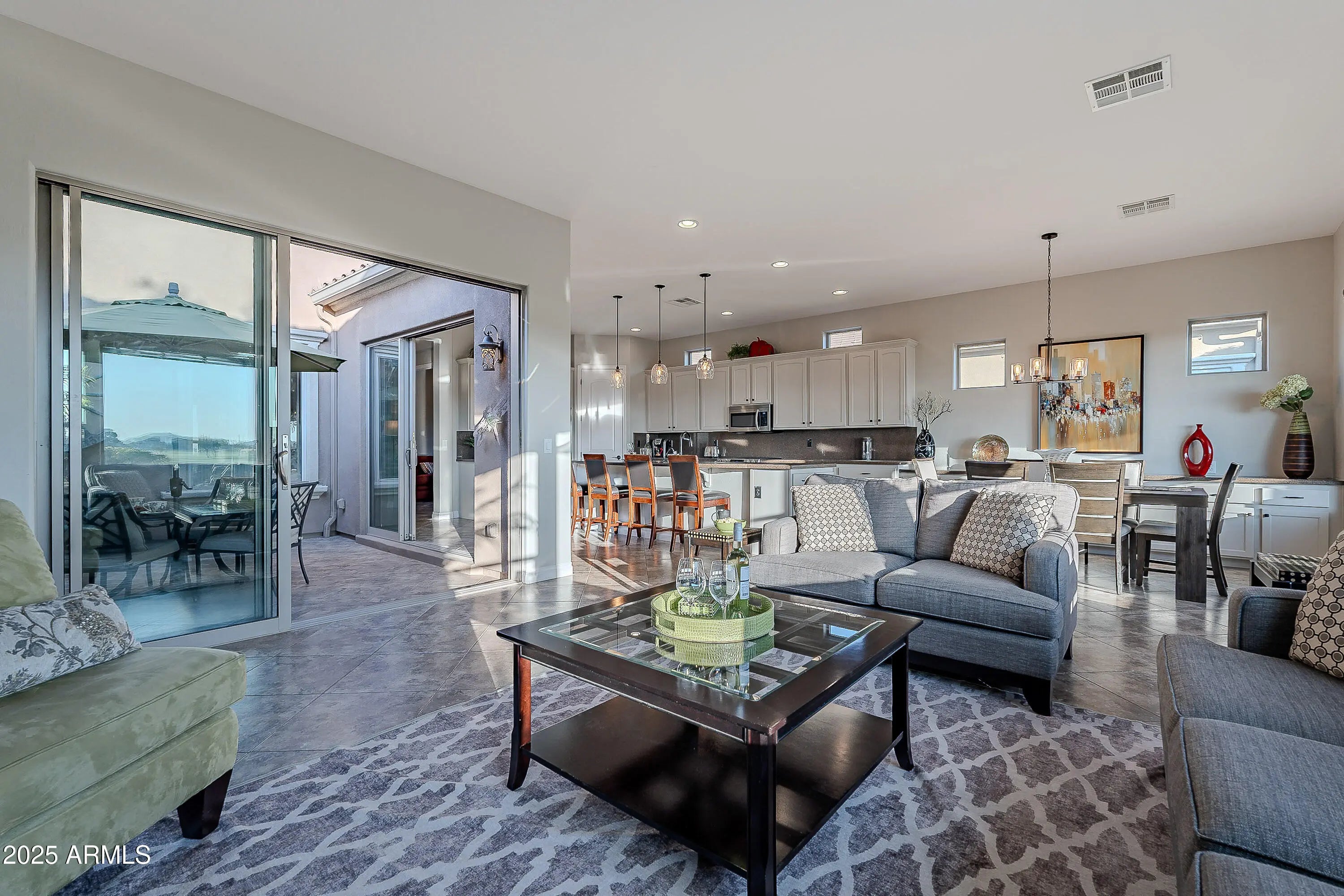 Positioned directly on the 13th hole, this home delivers sweeping 180-degree panoramic views of the golf course and mountains, one of the most impressive vantage points in Encanterra. If the view is your priority, this one is hard to beat. SELLER IS OFFERING $12,000 TOWARDS BUYER CLOSING COST OR RATE BUYDOWN. The 2-bedroom plus den, 2.5-bath layout spans 2,143 square feet with an open kitchen featuring an oversized island and refinished cabinetry in a warm modern greige. Two rolling walls of glass open to a private courtyard with a gas fireplace, creating the indoor-outdoor flow Arizona living is known for. The den with French doors works well as a home office or optional third bedroom. The smartspace laundry offers generous storage. Updated where it counts: many windows replaced, new window treatments, newer AC/heat system (2023), newer hot water heater (2022), built-in BBQ, and replaced sprinkler lines. Roof recently inspected with maintenance completed. Offered fully furnished and completely turn-key. A golf membership may be purchased through the club at closing.